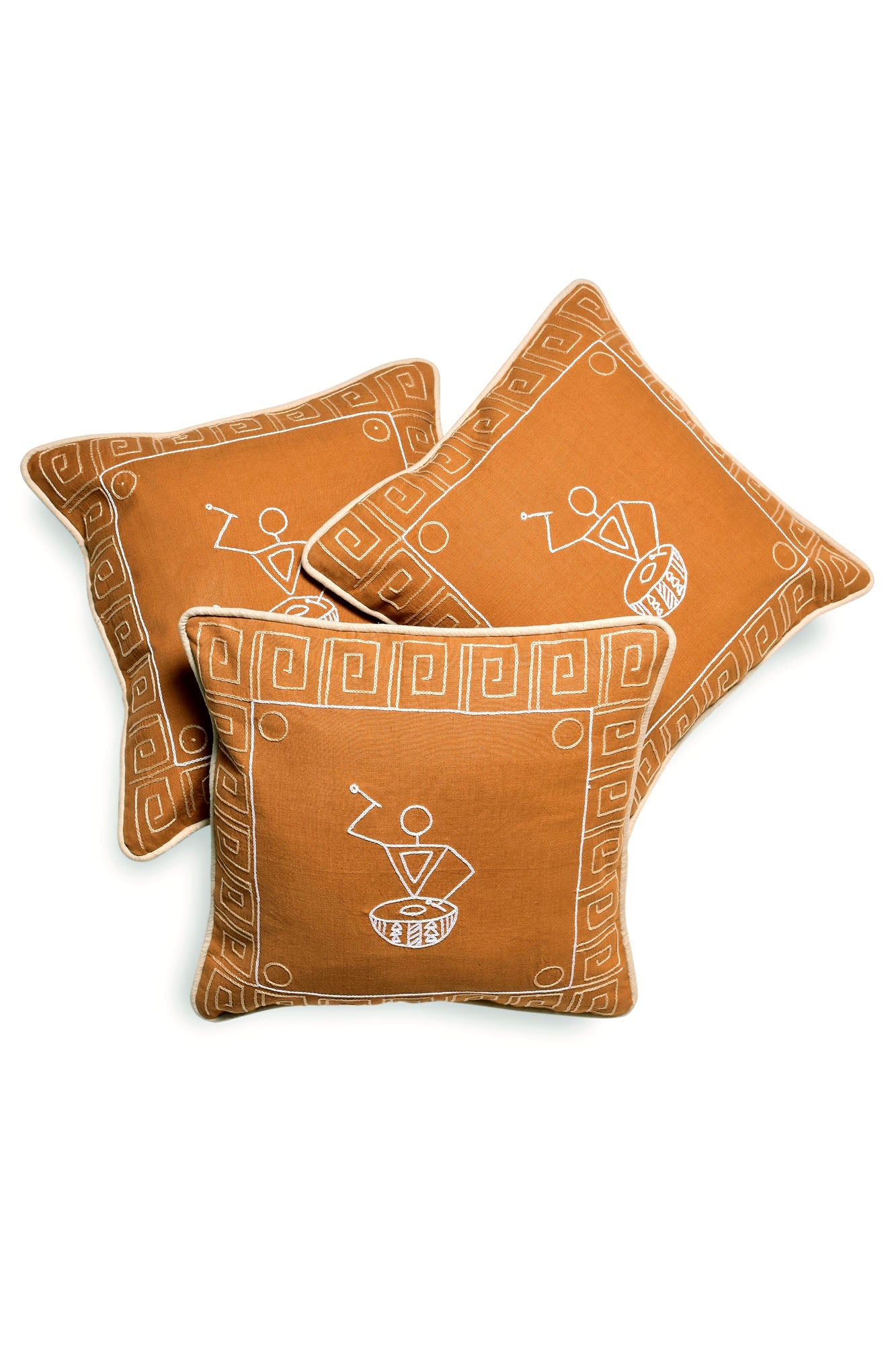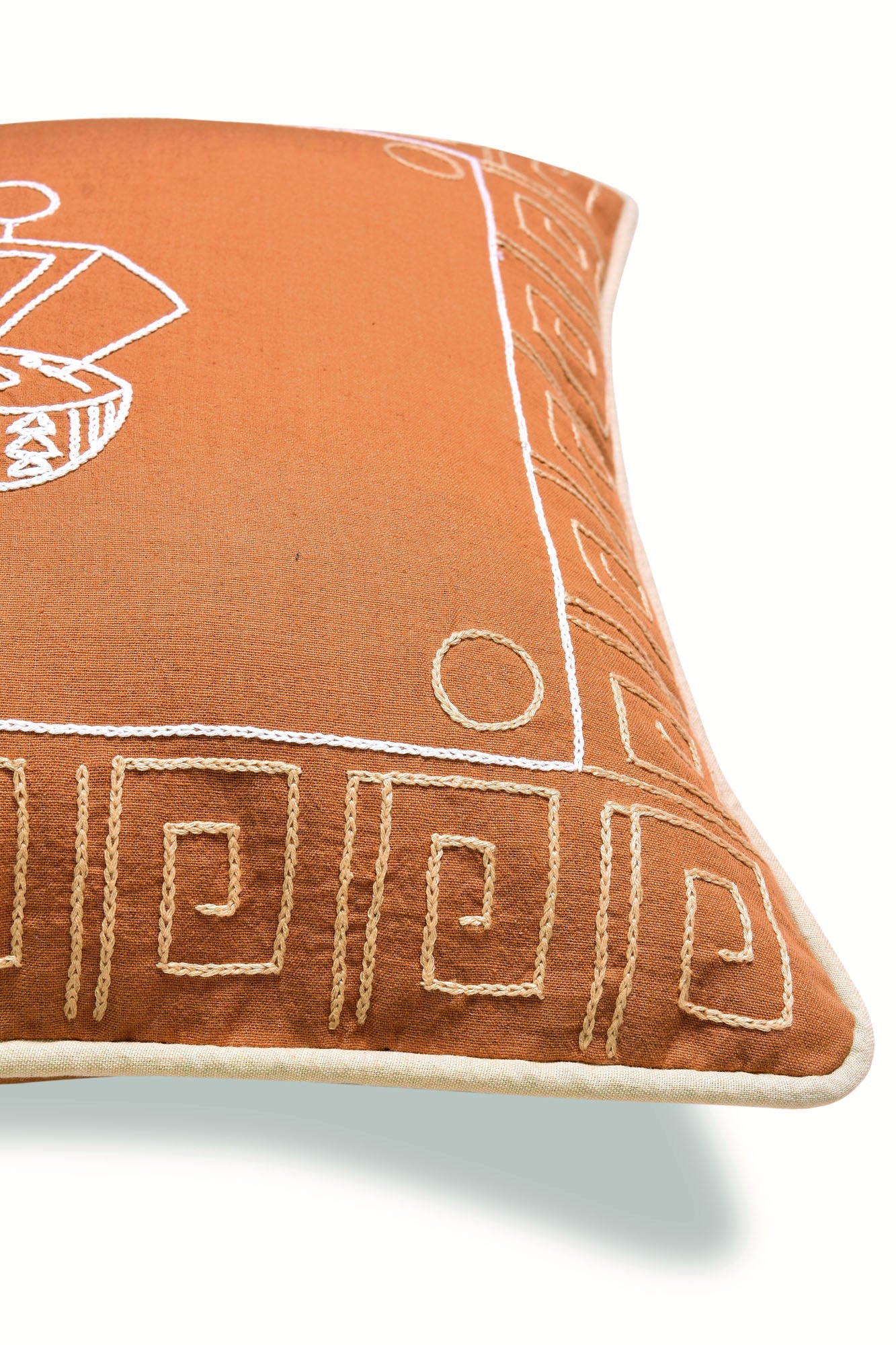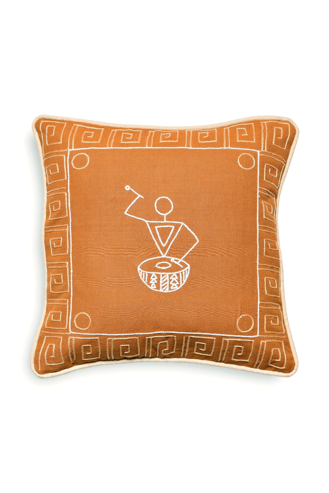Asteria Pilo has divine qualities as per Greek ancient stories. The hand-woven cushion cover depicts Greek and Warli art, paired with khadi cotton and hand embroidery. The clay background depicts celebratory designs and the drum masters. Celebrate with this set and upgrade the essence of your occasions by placing this cushion over set with floor height furniture.