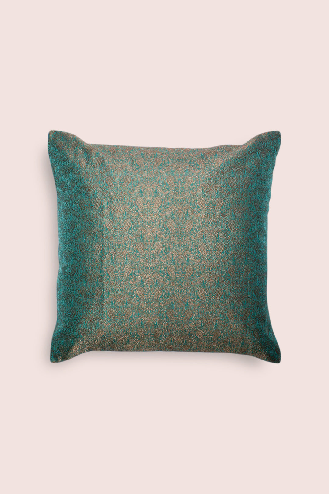 Our Banu handwoven cushions in pure silk is woven with gold zari to elevate your space with a scintillating spirit for the season. The paisley pattern achieved with the jacquard weave in green is inspired by persian artform to add a touch of artistic flair to your festivities.
