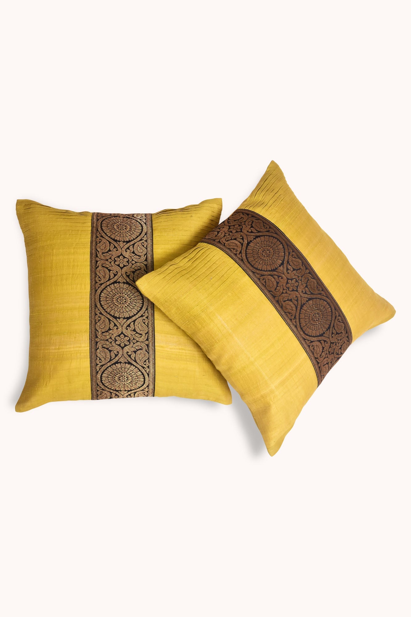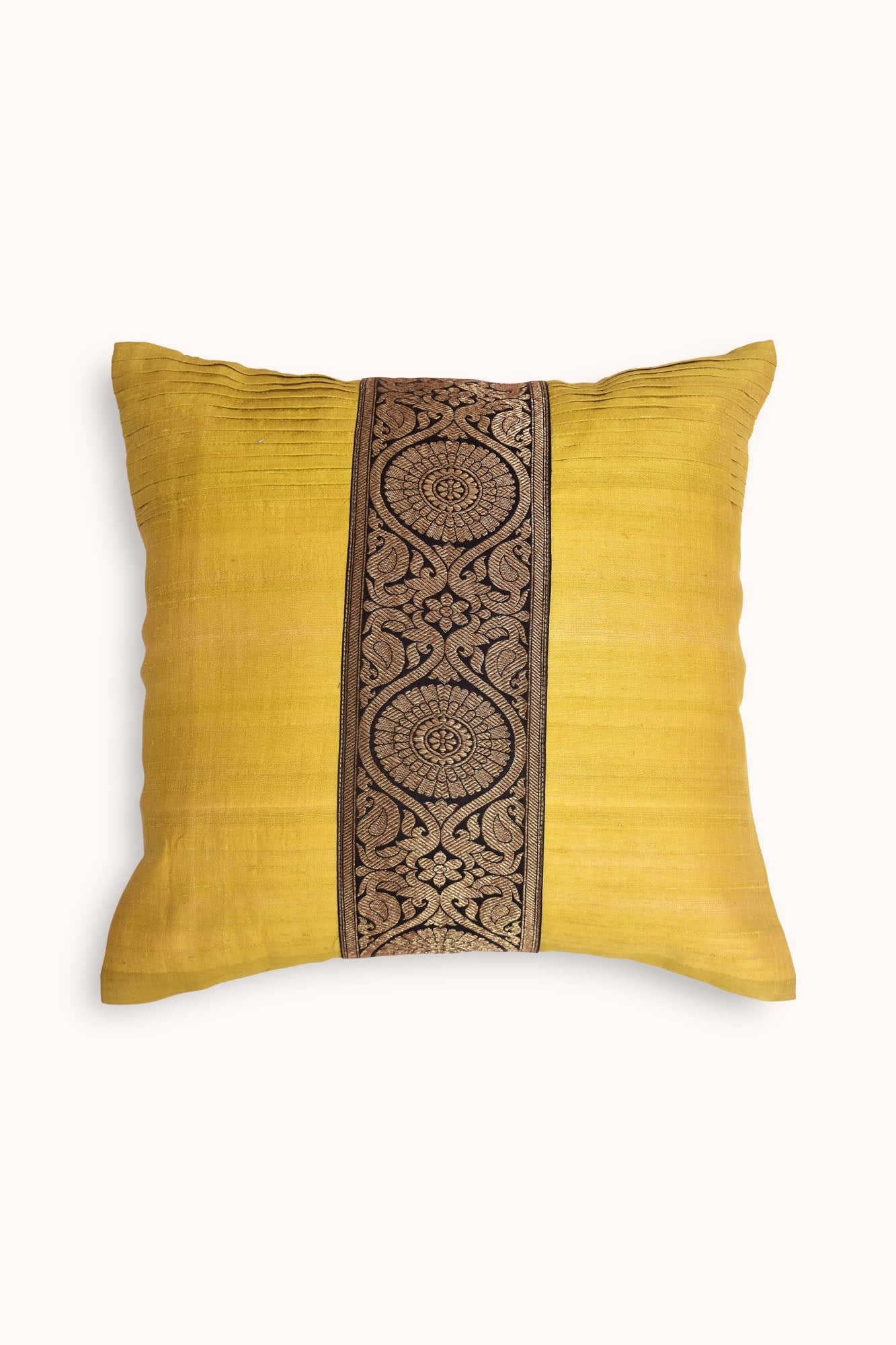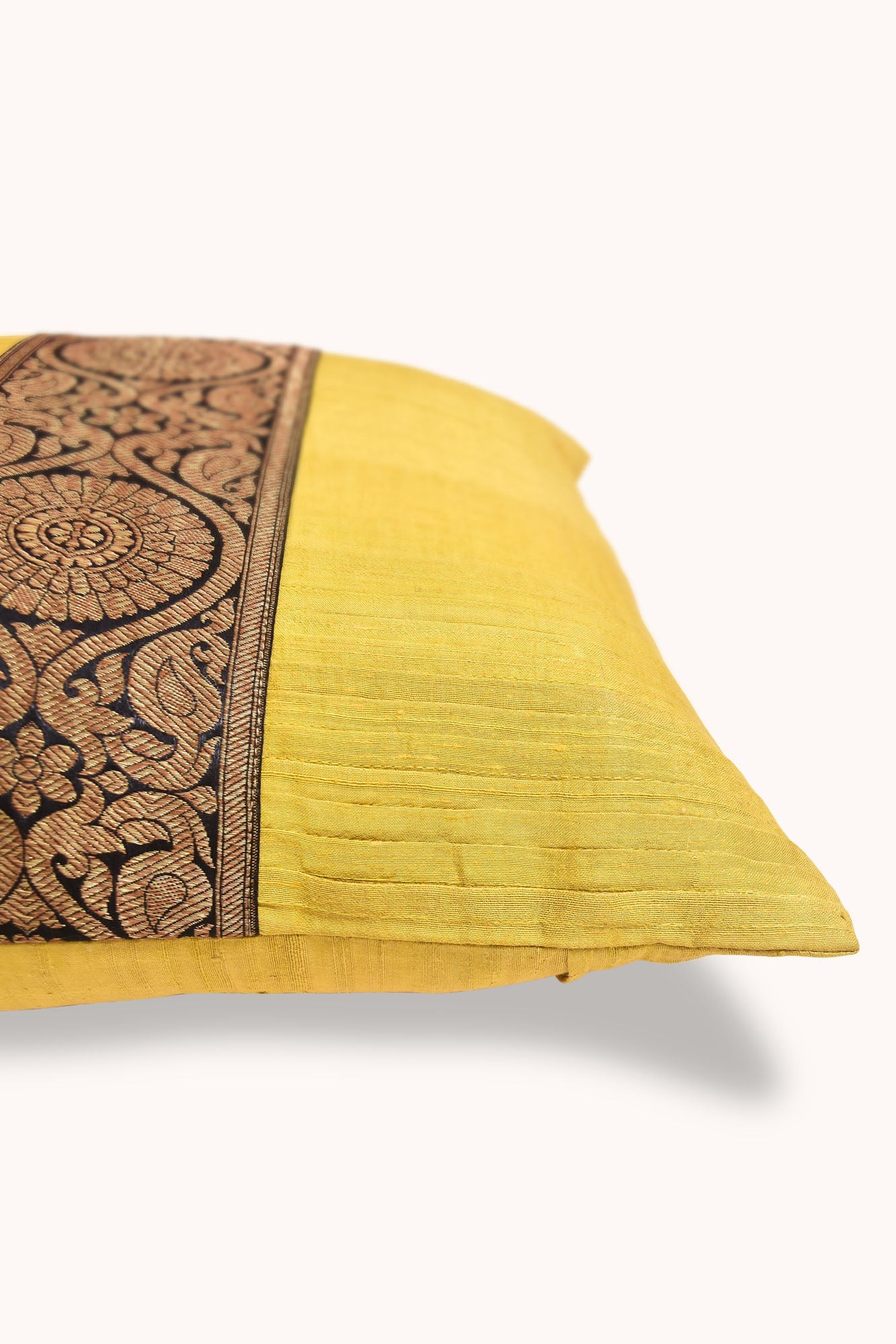 Bewider means a wider scope is an Indian cushions with extensive ribbon art. It is made with the richness of Indian matka silk with homely pleats and zaree boarder vastness of immersive yellow water body. The cultural pattern is placed beside the kind of traditional or contemporary sofa lounge collection.
