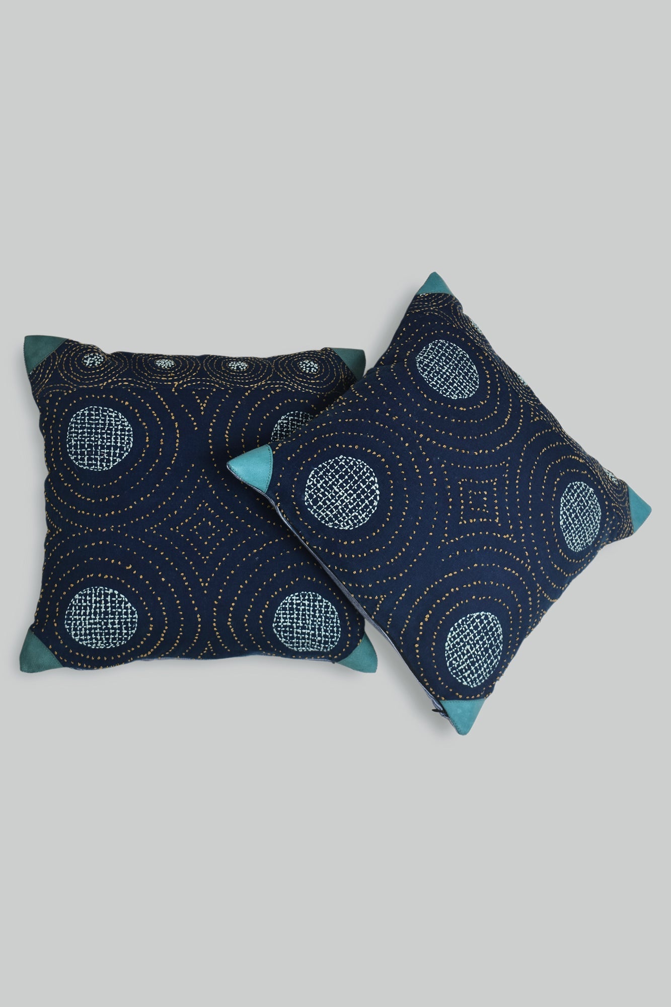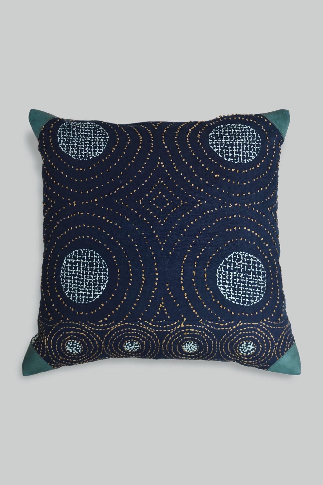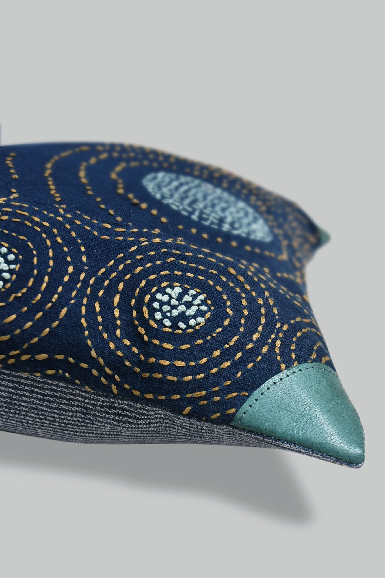 Bordado cosmos depicts a galaxy of threadwork cueing towards our cushion cover which is handmade with khadi cotton in knotted hand embroidery. The circles signify concentration and the symmetrical blue tips will create an appealing contrast with your indoor or outdoor furniture as the corners of the cushions are locked with natural leather.
