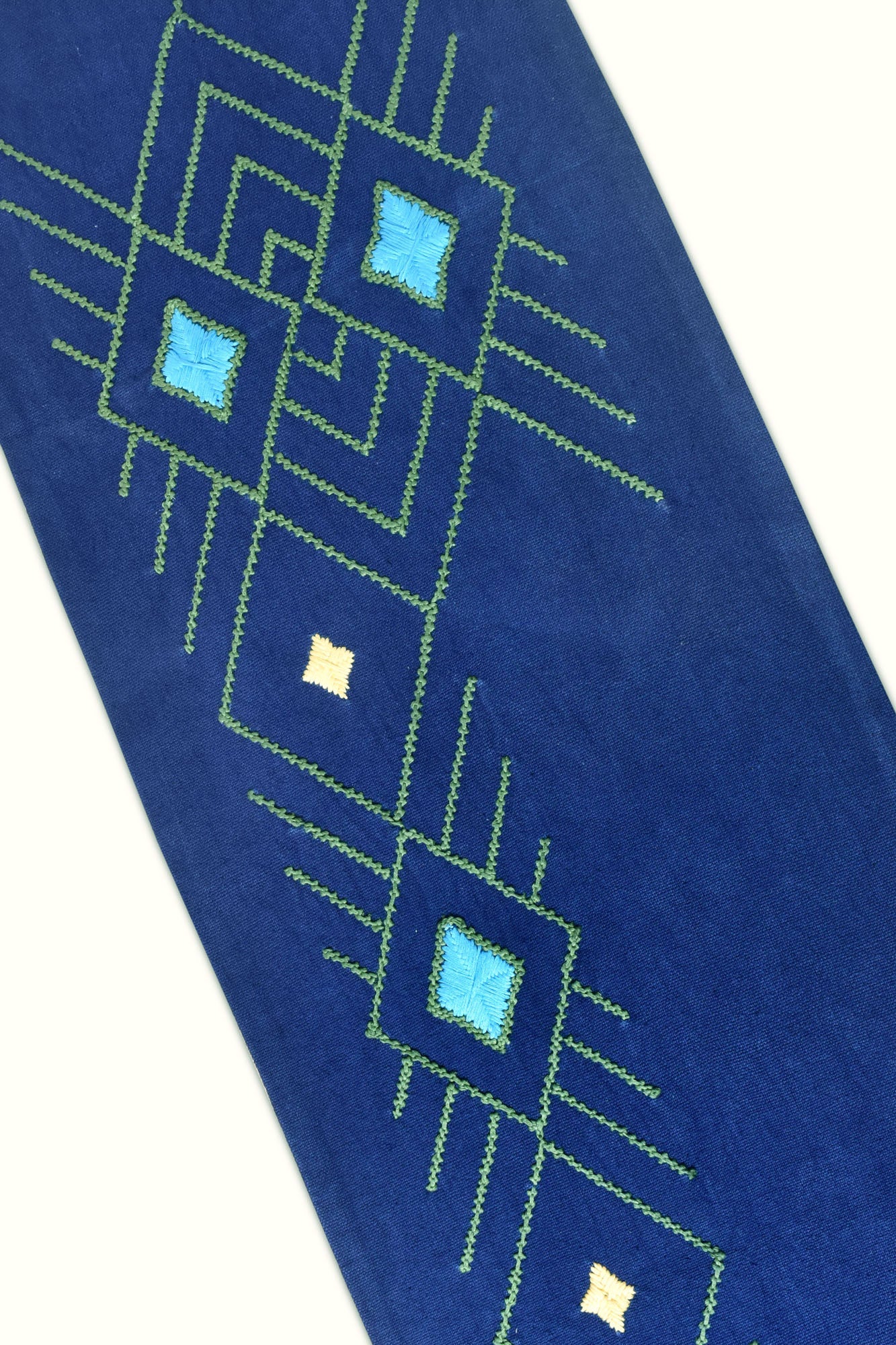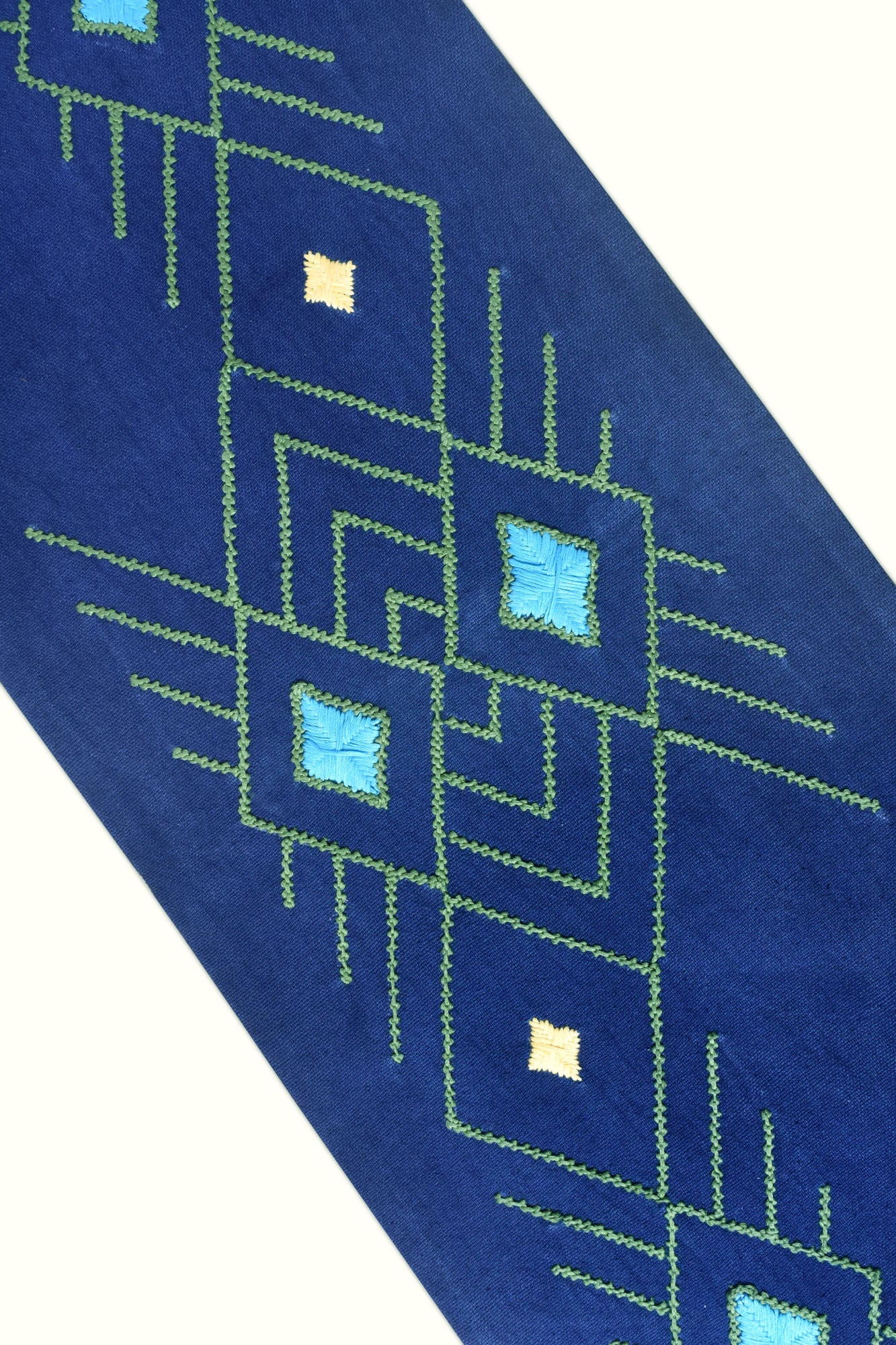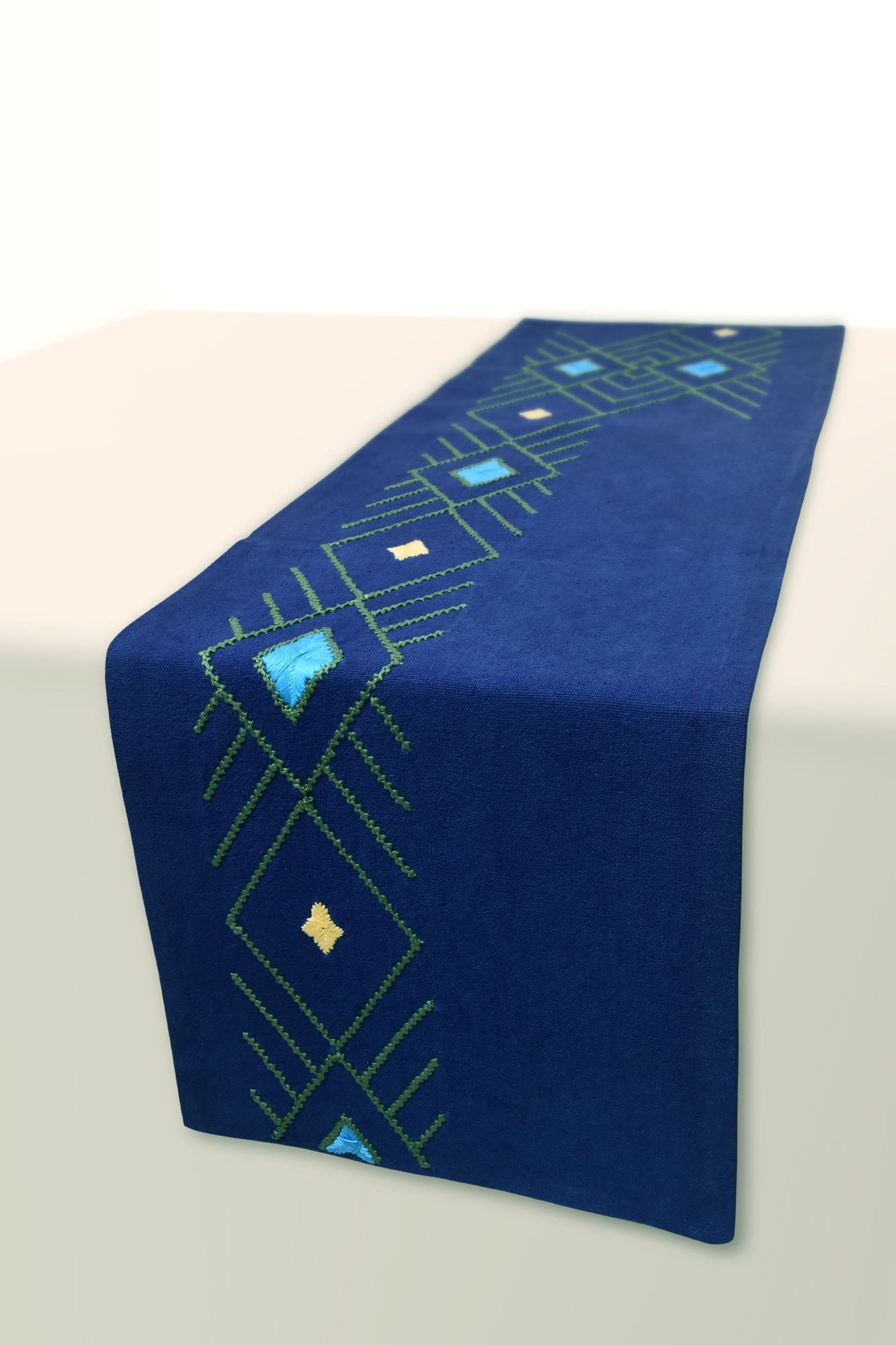 The Cicero table runner beautifies the length of your dining setup with its exuberant contrast of popping colors through the hand embroidery, inspired by African-Aztec culture.