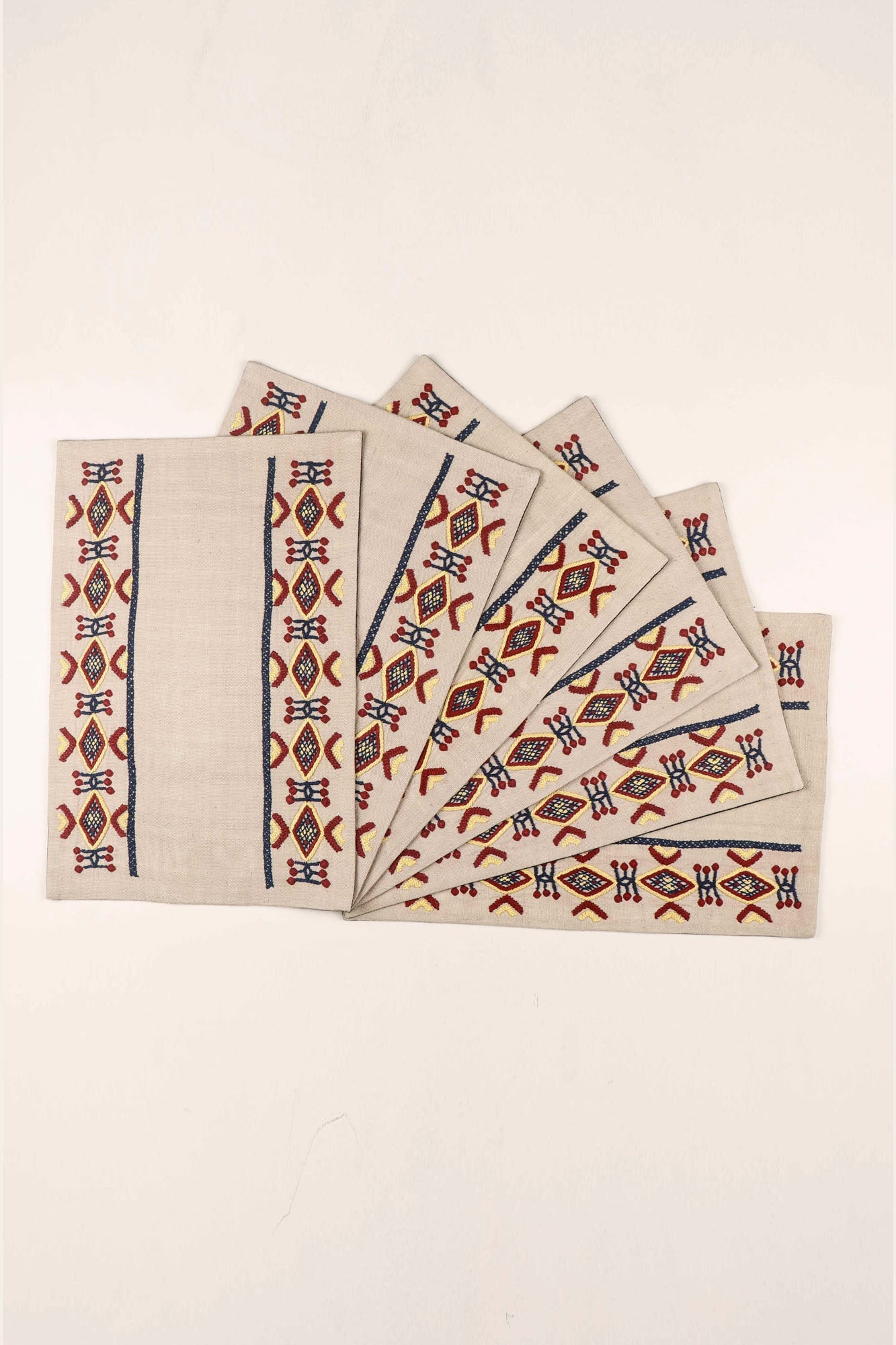 The Dyson table mats are not just any regular set of table mats. The handwoven, cotton table mats feature an elaborate hand embroidery inspired by the African-Aztec culture. The colorful designs stand out from the neutral background with a harmonious play of contrasting colors.
