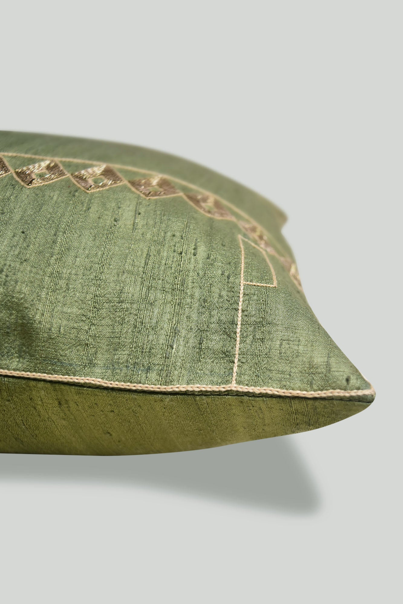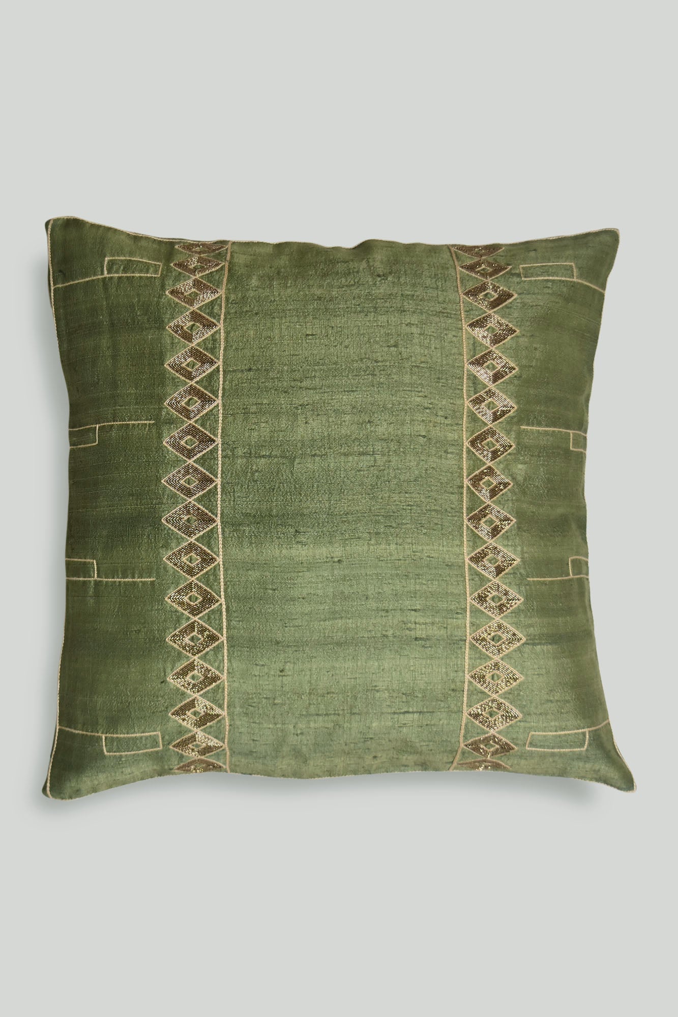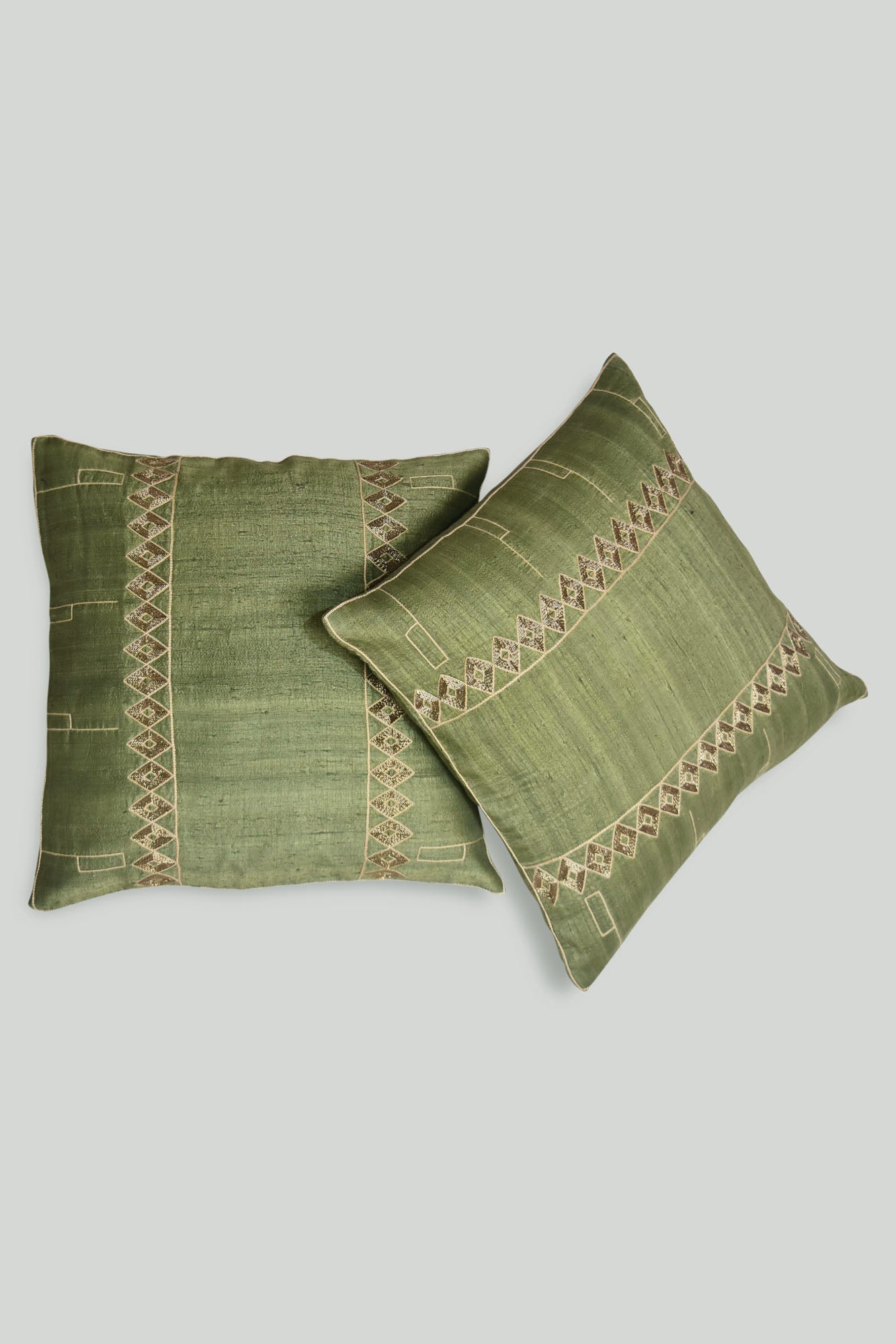 Ecuacion verde means green equatióon cushions hand wóooven in dupion silk and hand embroidered in zardoozi art .The Mapuche and tribal naga artwork depicts open spaces that equalizes the mood swings enabling a better celebration of spring cottage gardens .