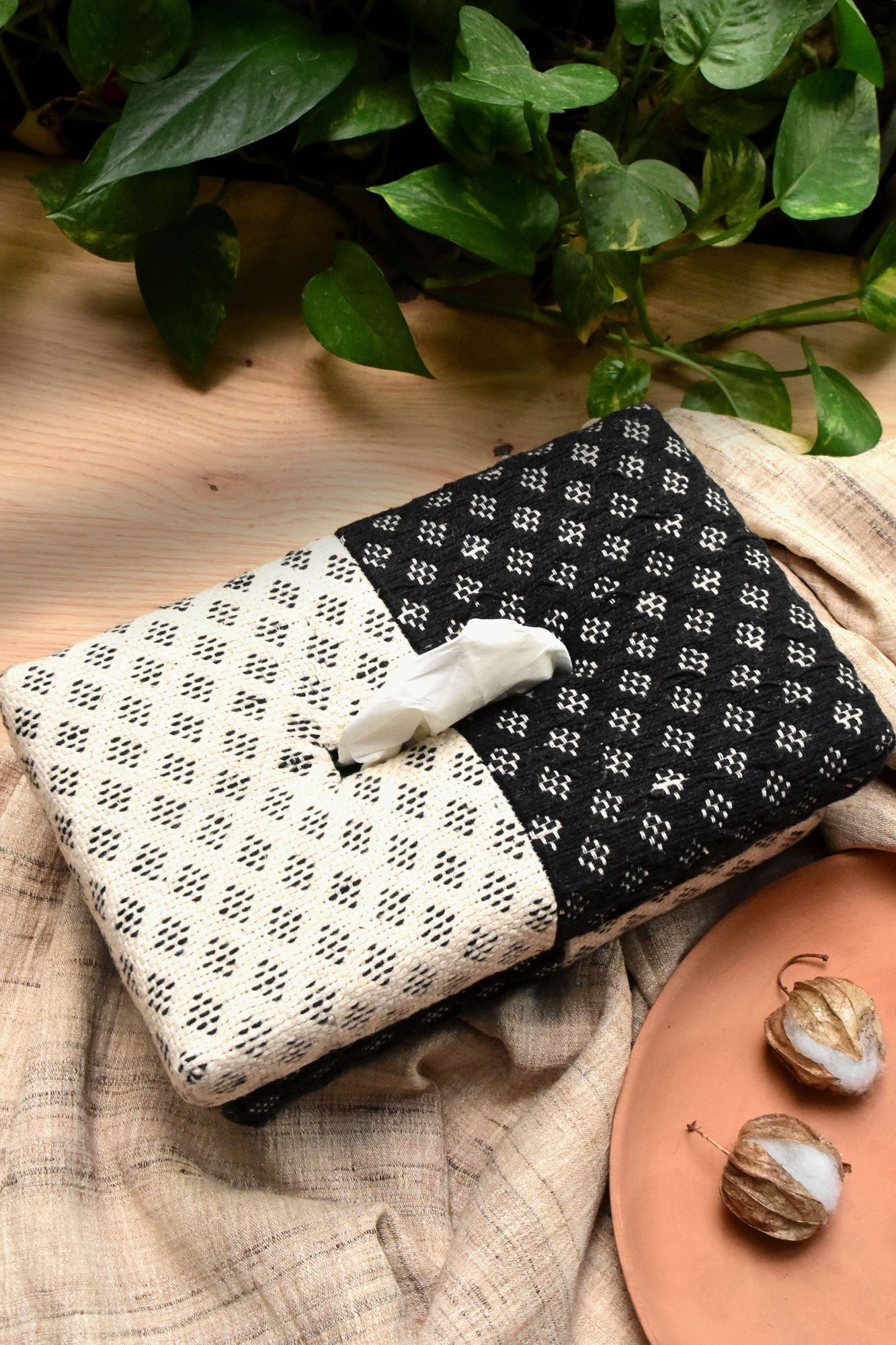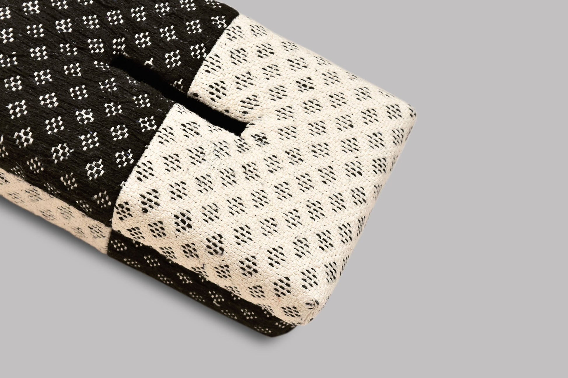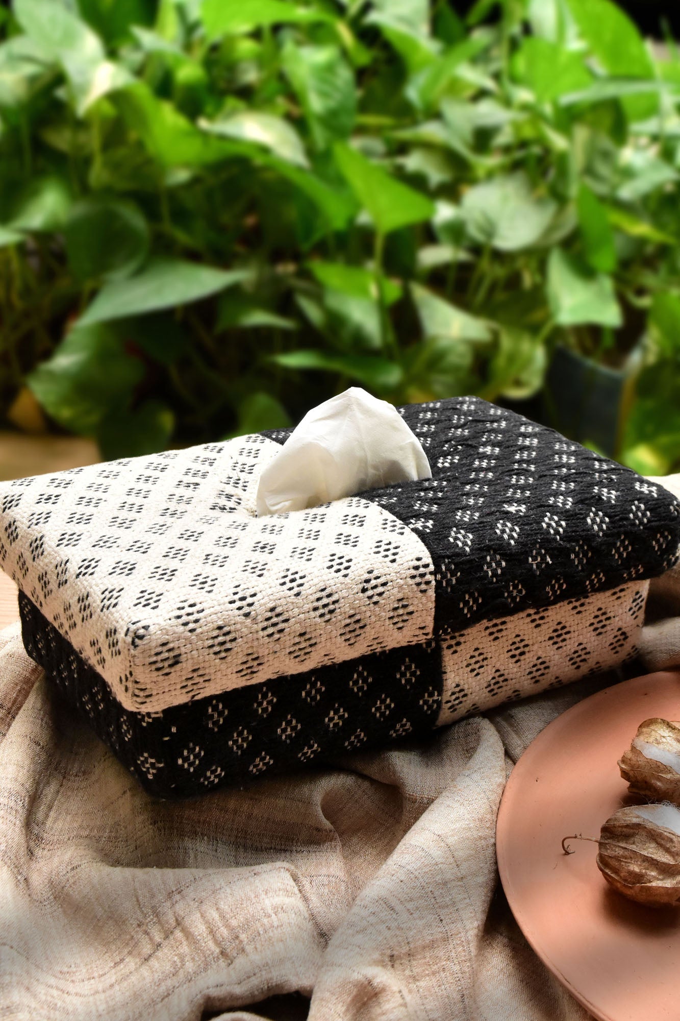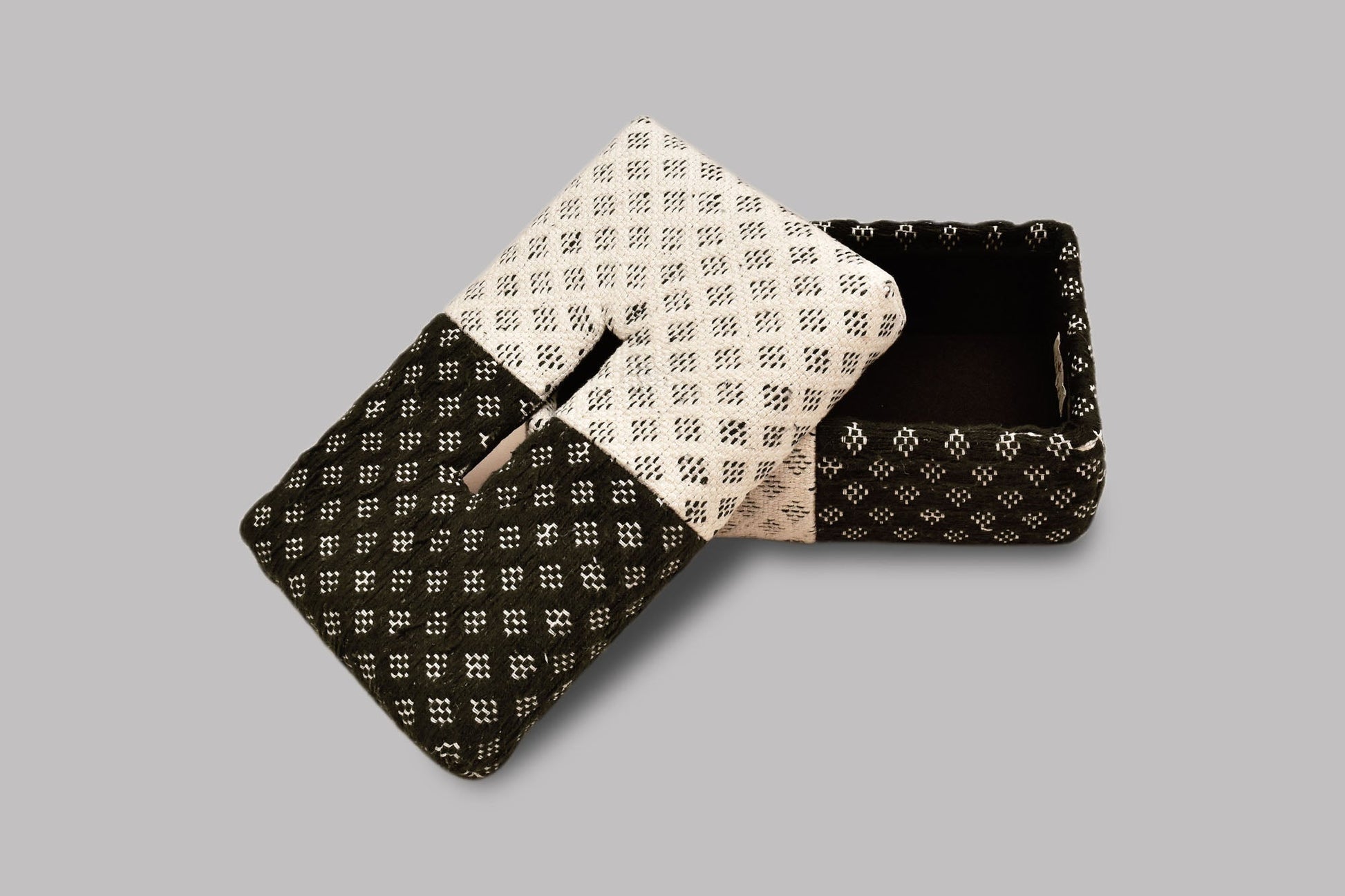 Elav or Clarity, is inspired by a medley of two sides of the jacquard in the sunlight on a peaceful day. The rich and vivid design are jacquard woven. Handwoven tissue box can go well with any abstract art.