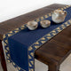 The pattern embellished in our linen-khadi table runner is influenced by the renaissance in India, which Khadi symbolises, and inspired by the Elizabethan style. Set against a dark blue backdrop, the beauty of zardosi weave on the runner goes beyond simple vanity.