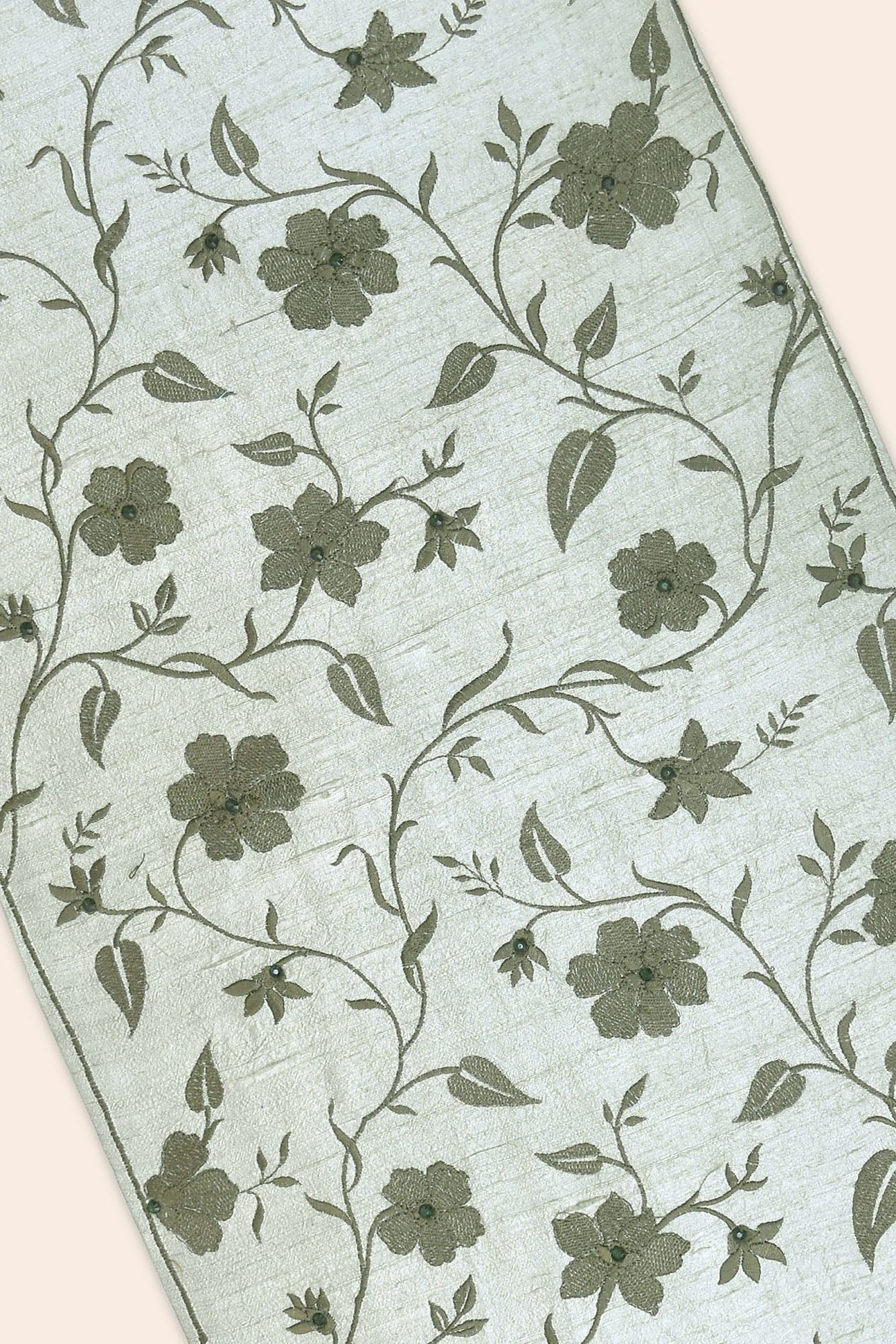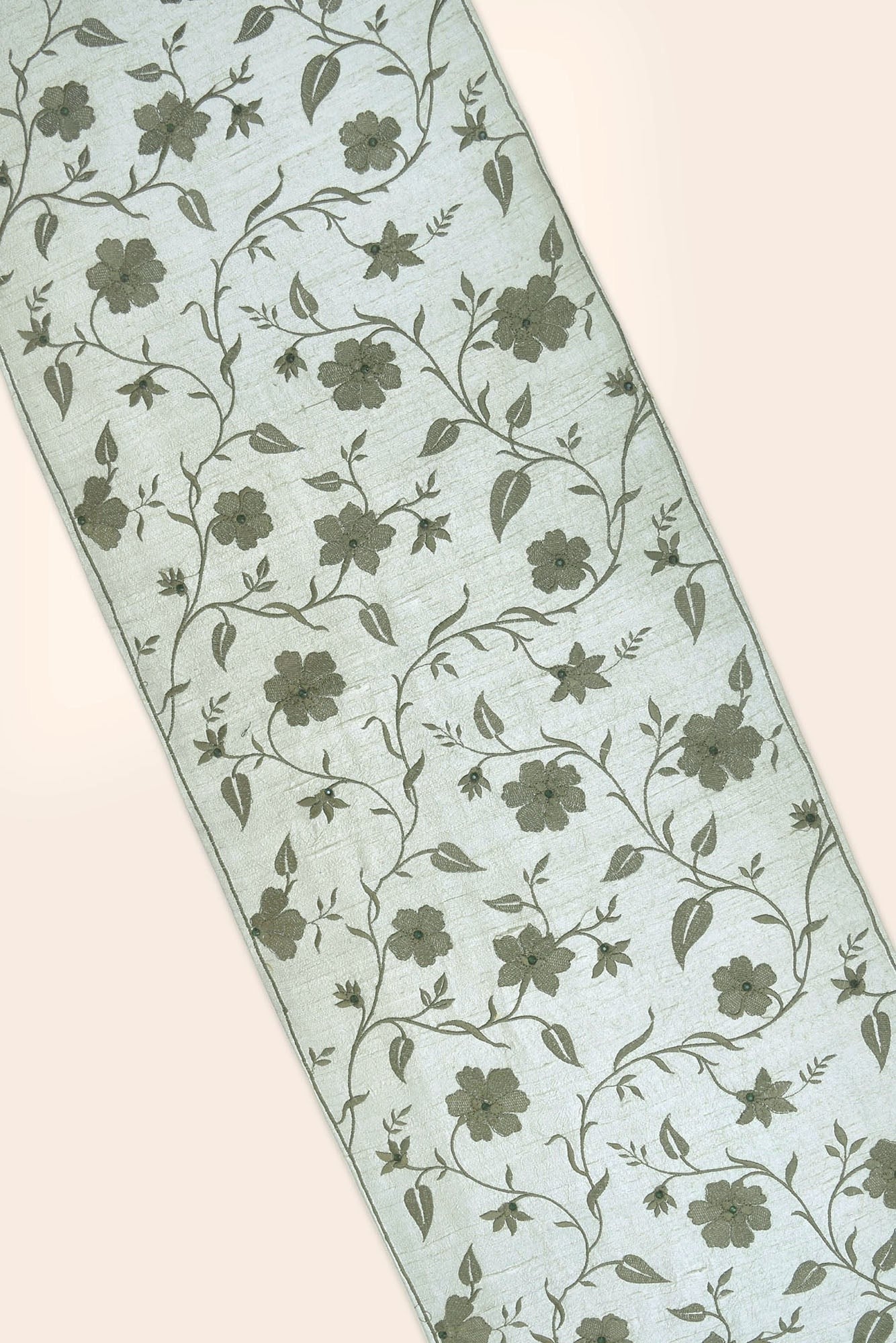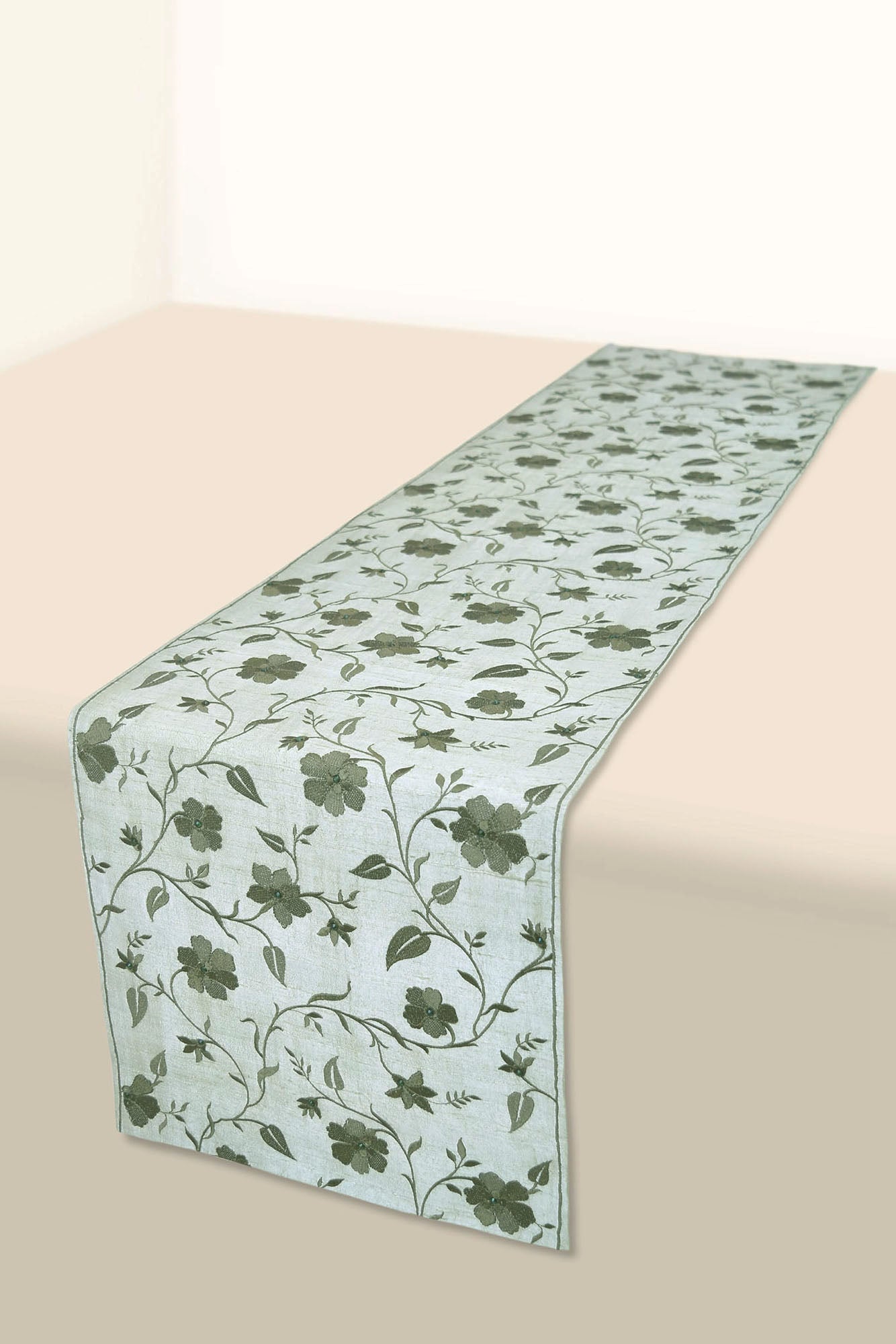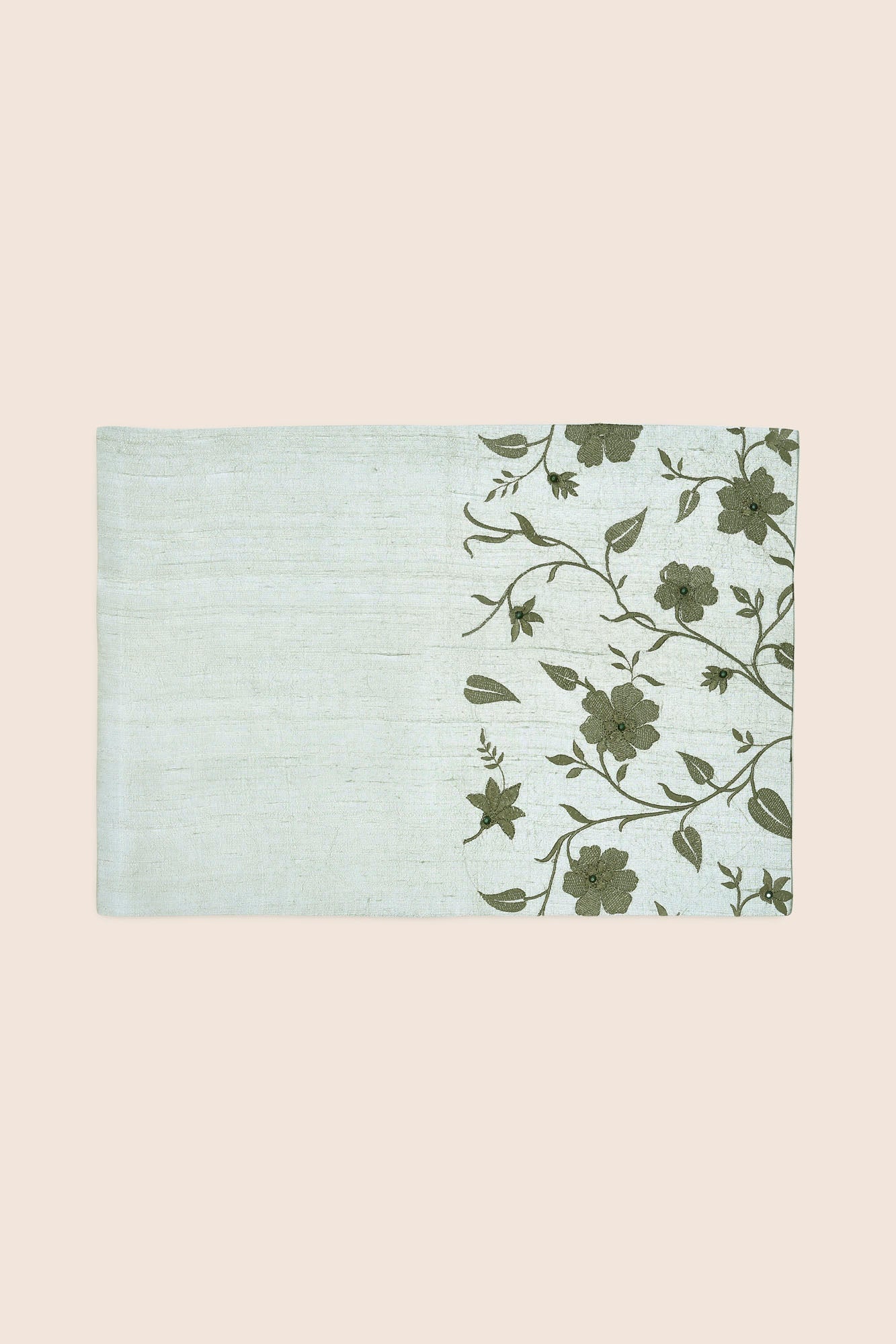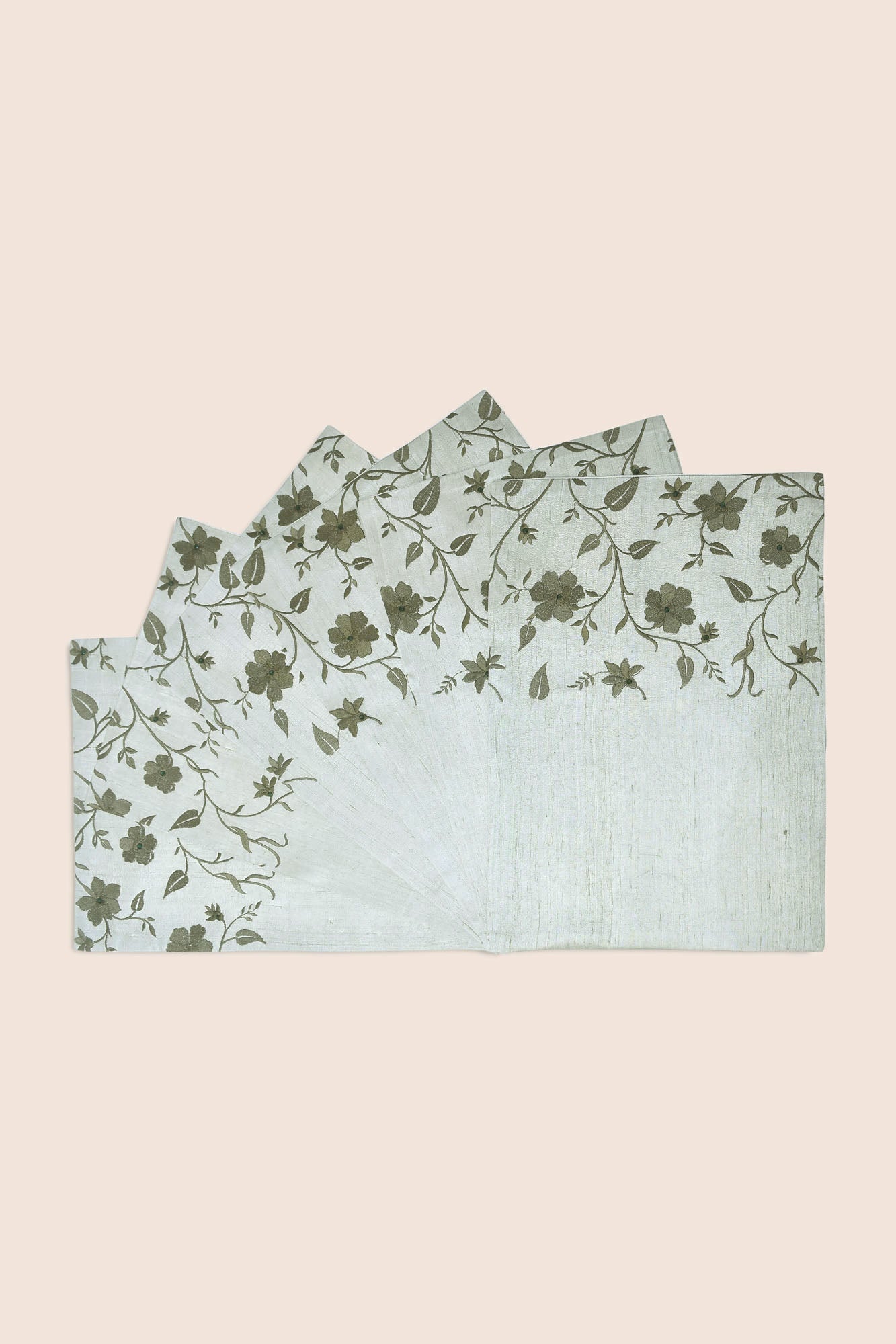Our Esther Handwoven Dining Set is embroidered with floral vines to elevate your space with a scintillating spirit for the season. The dupion silk fabric in shades of green is inspired by William Morris's art to add a touch of artistic flair to your festivities.