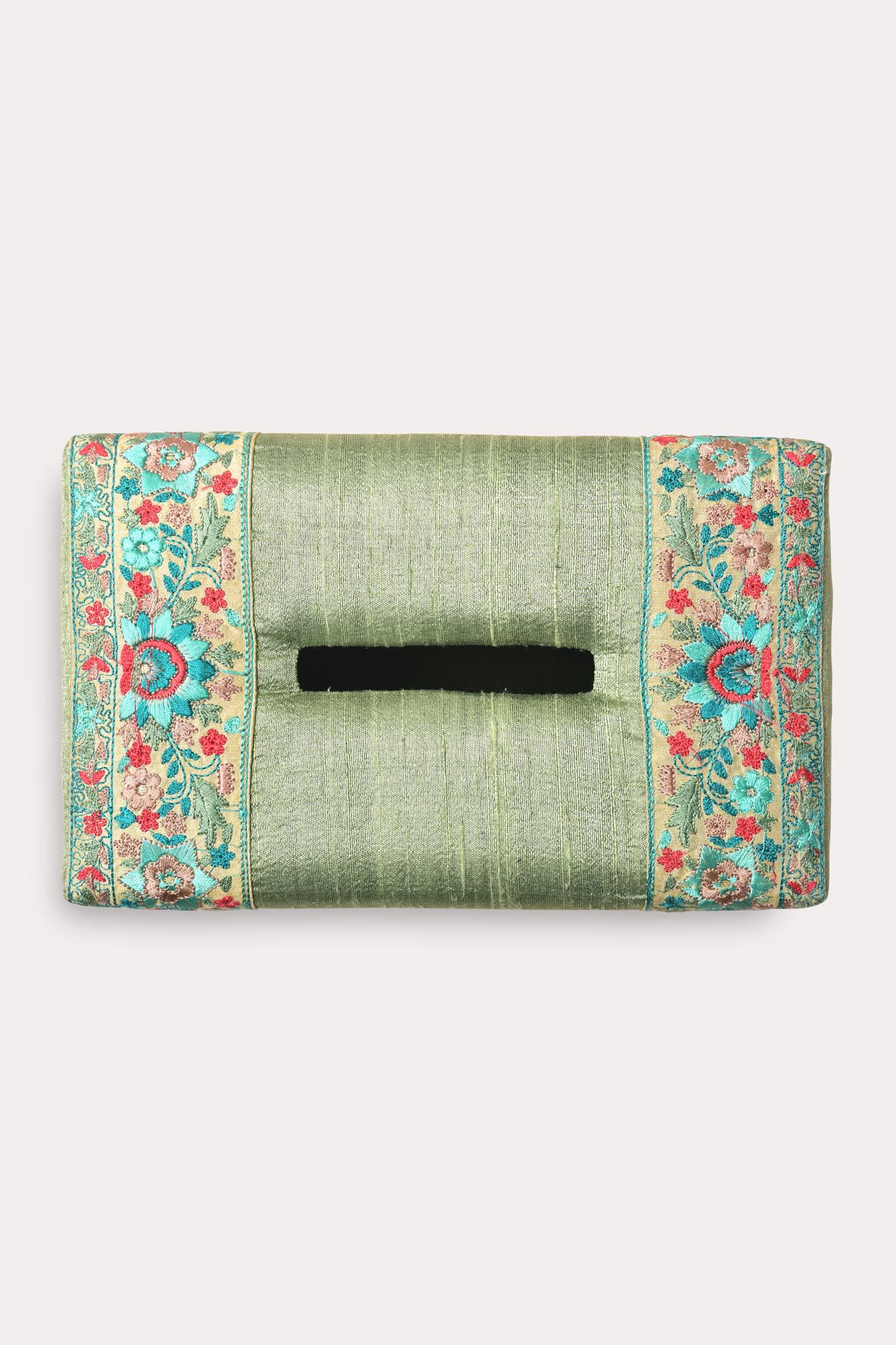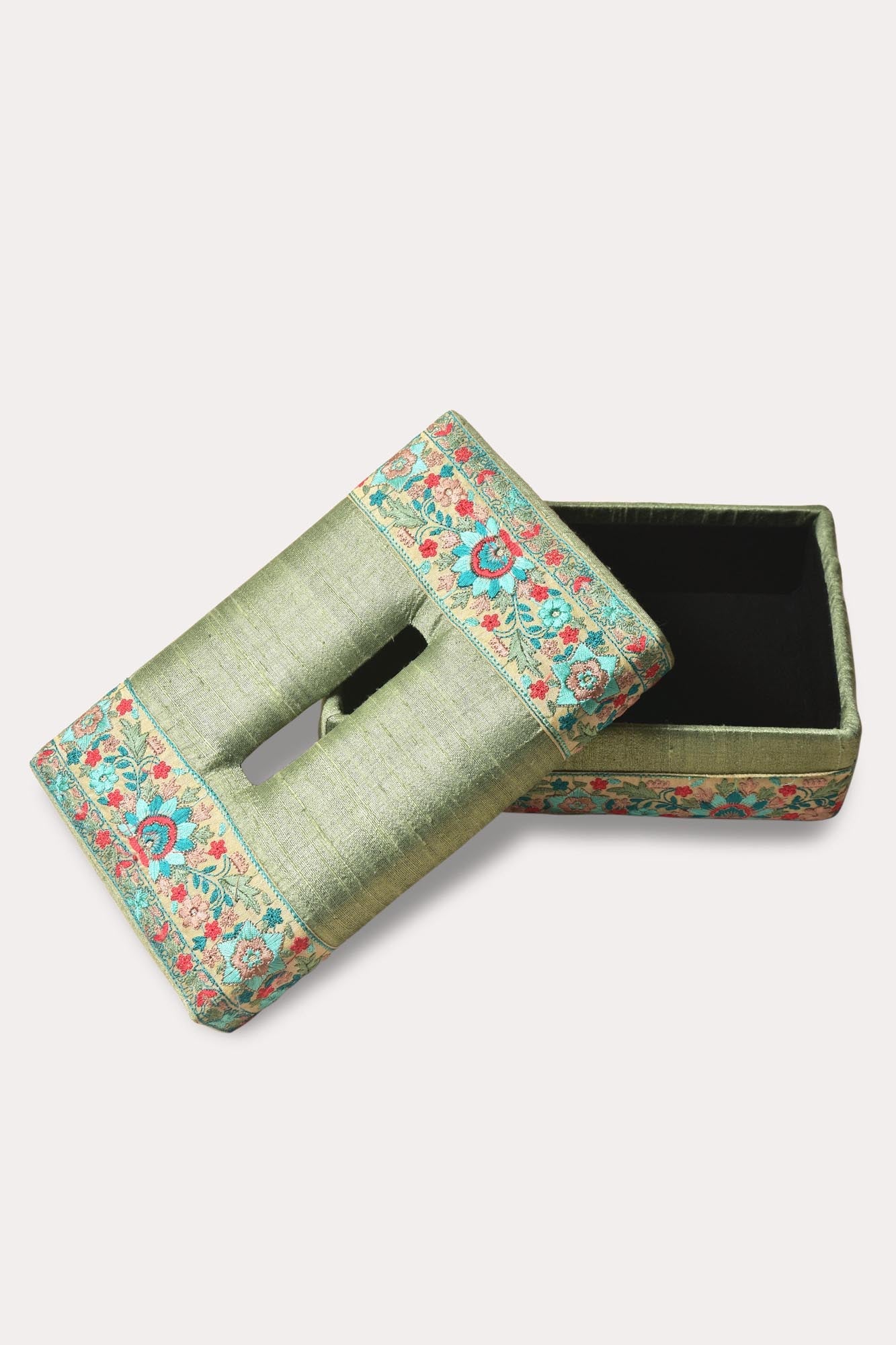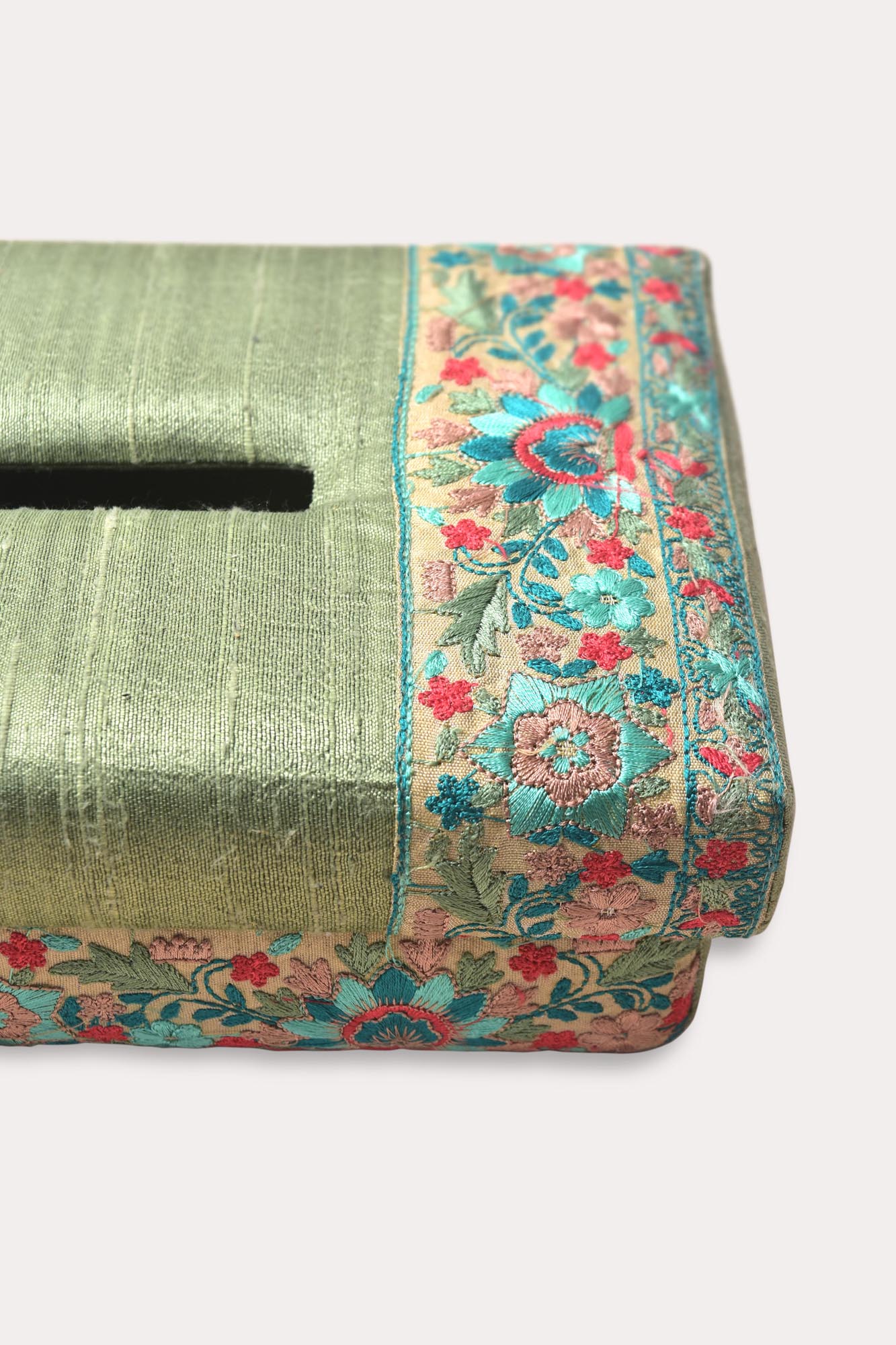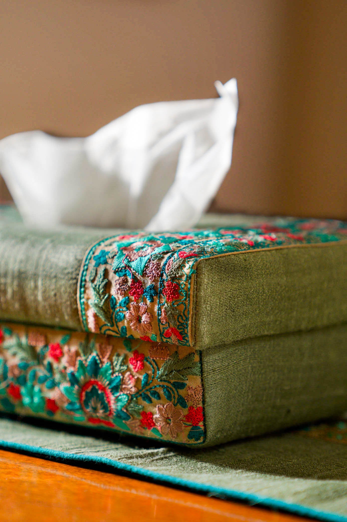 Floreo means ‘filled with flowers’ as showcased on the Floreo tissue box. This one-of-a-kind creation is handwoven with pure Dupion silk and is embellished with a floral hand-embroidery on the edges. A must-have for all your guests, this festive season!