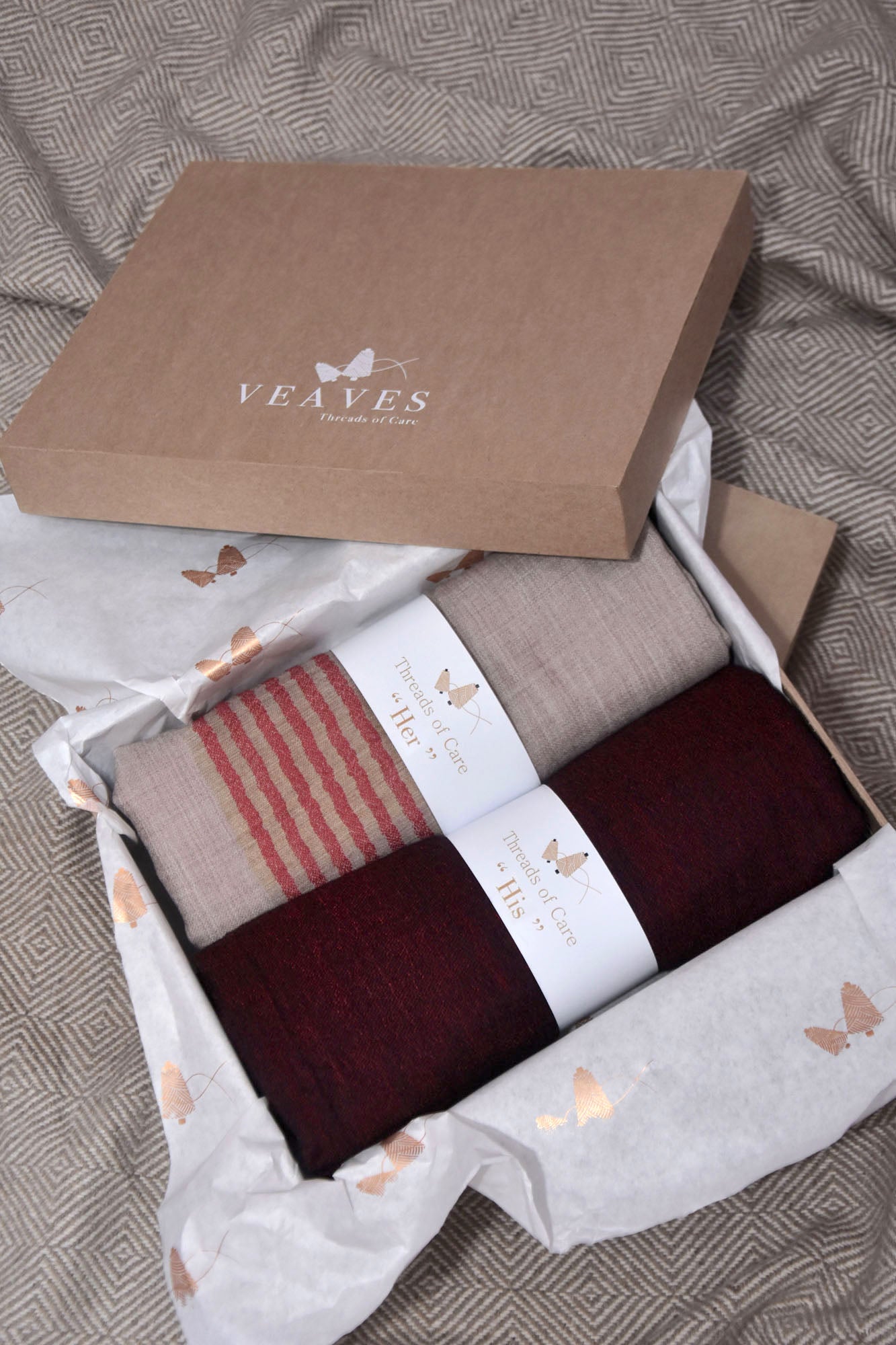 A gift hamper consists of 2 woolen stoles handwoven in fine cashmere for her and his. The stoles are soft as a feather, warm as a hug. Spread the feeling of love and concern. Celebrate the joy of gifting.
