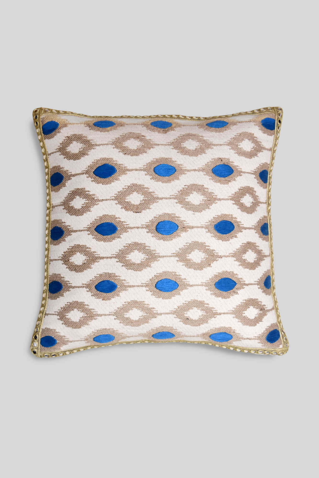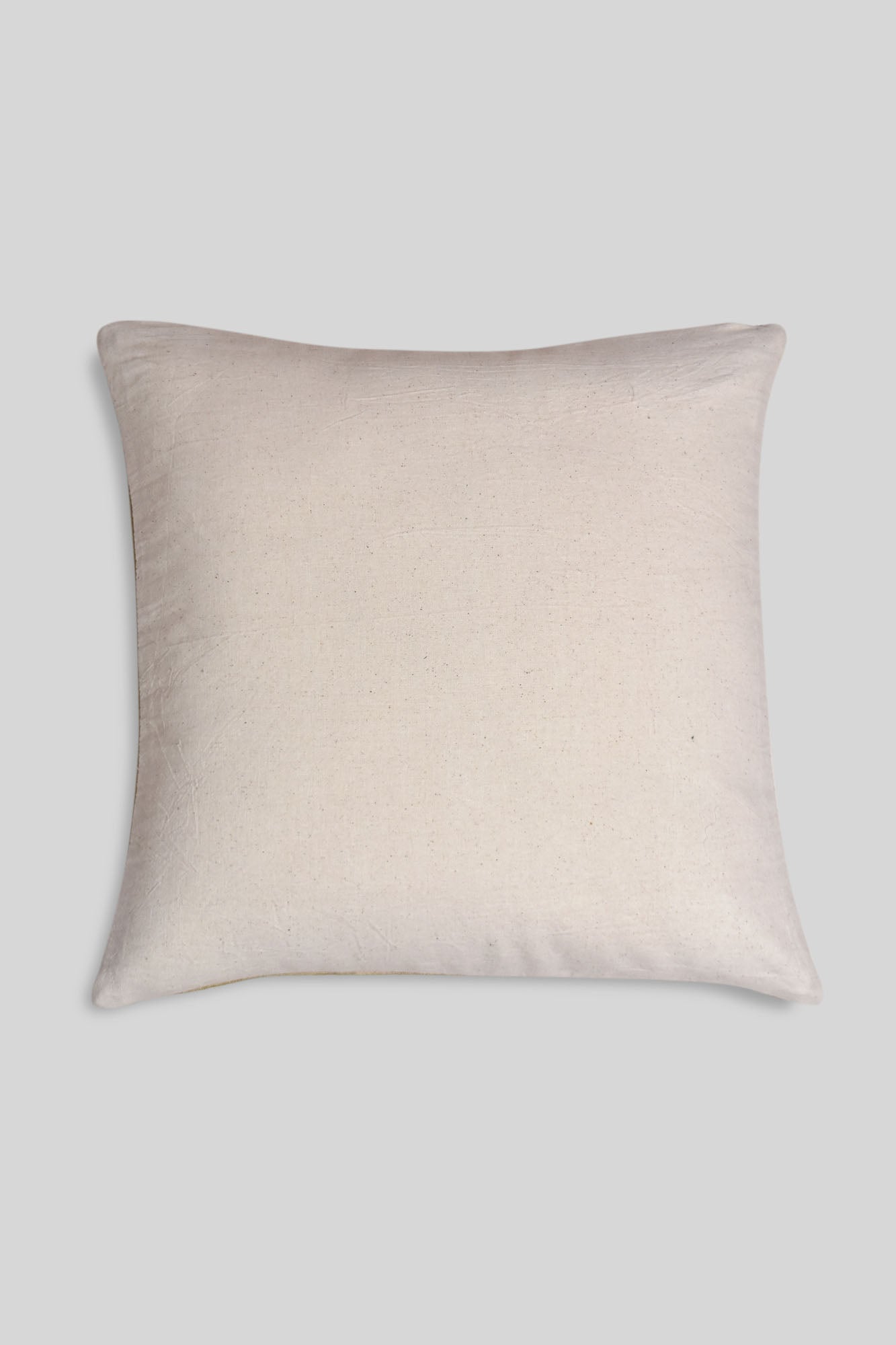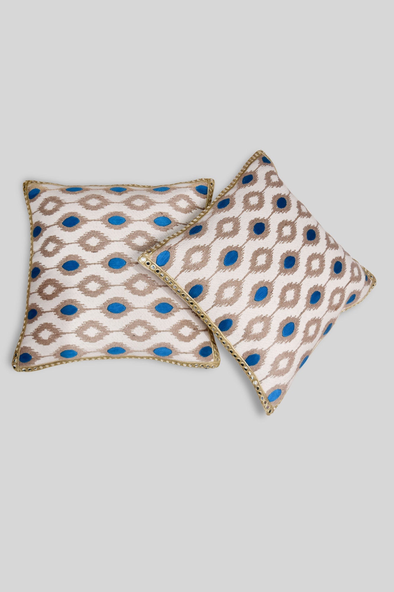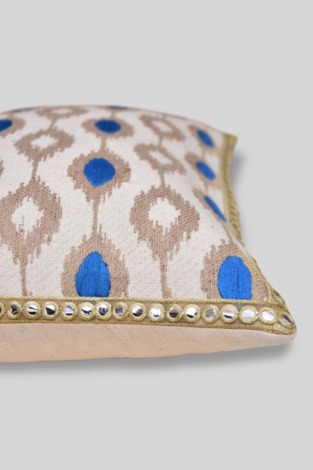 Lippan or mud-washing using materials locally available in the region like mixture of clay keeps the interiors of the houses cool. Mud and Mirror Work is mainly done by the women,So as the cushion covers made of handwoven in cotton with jacquard design and hand embroidered with mirror boarder.