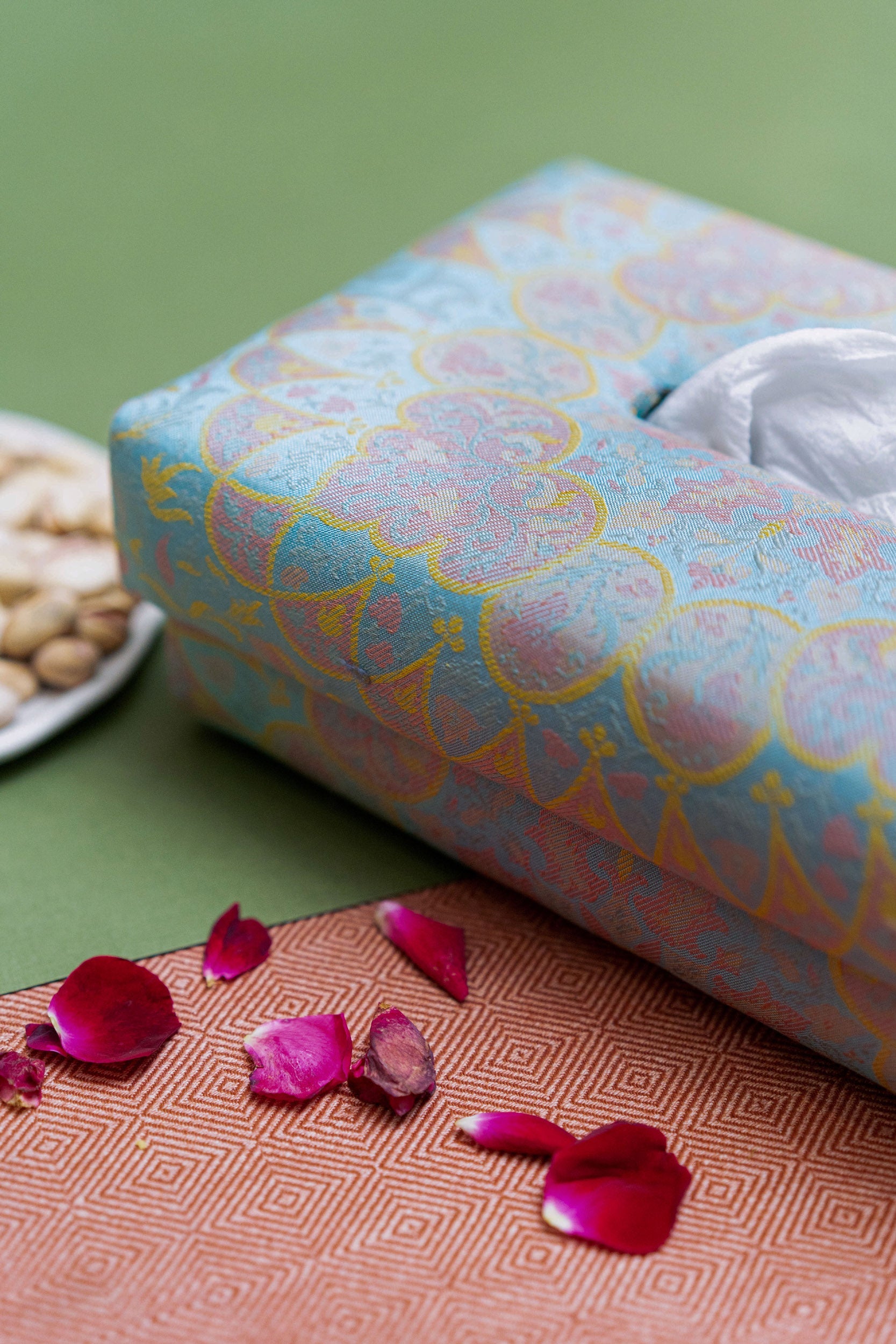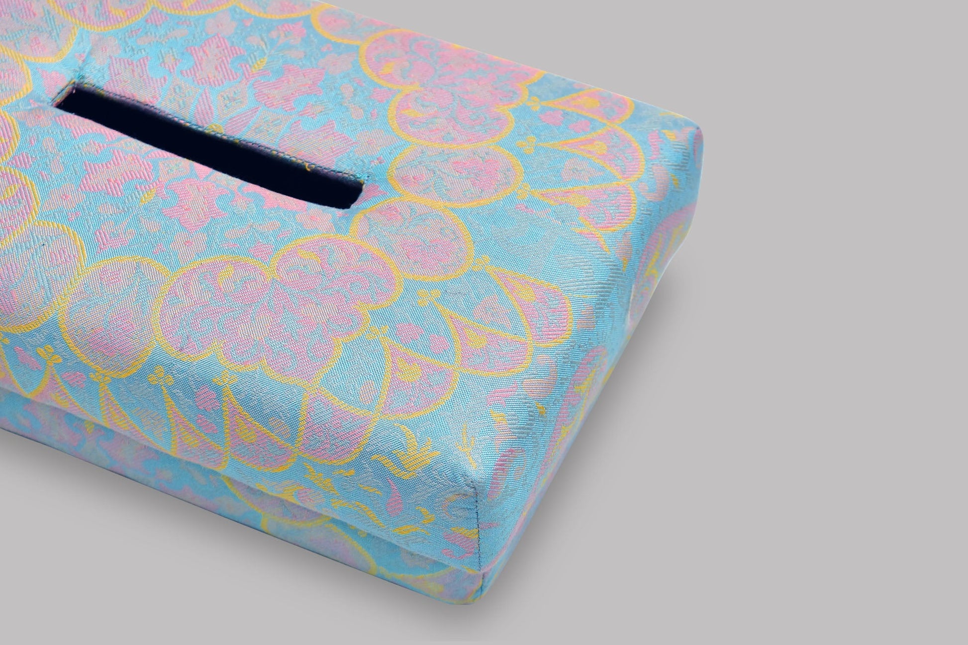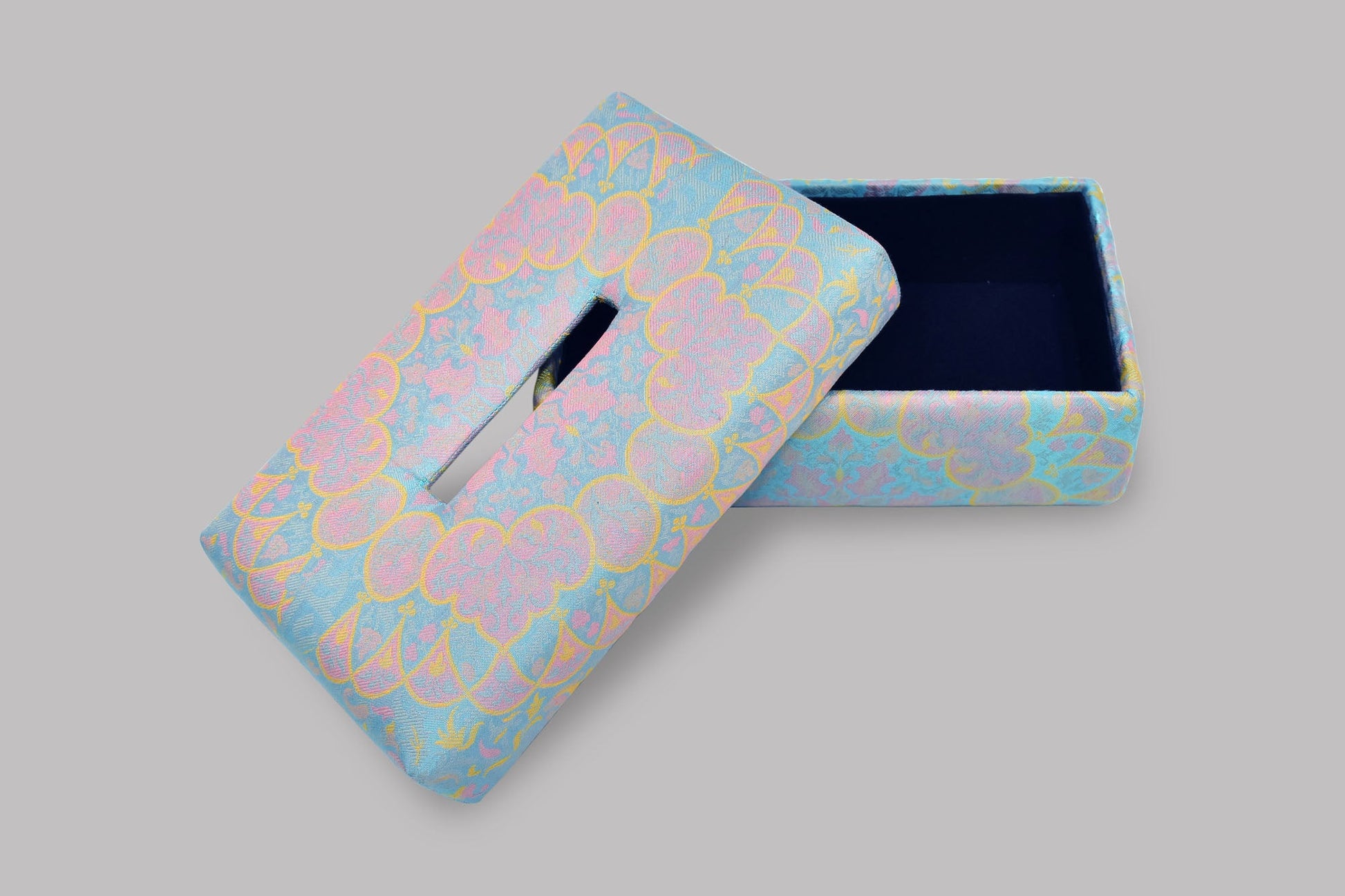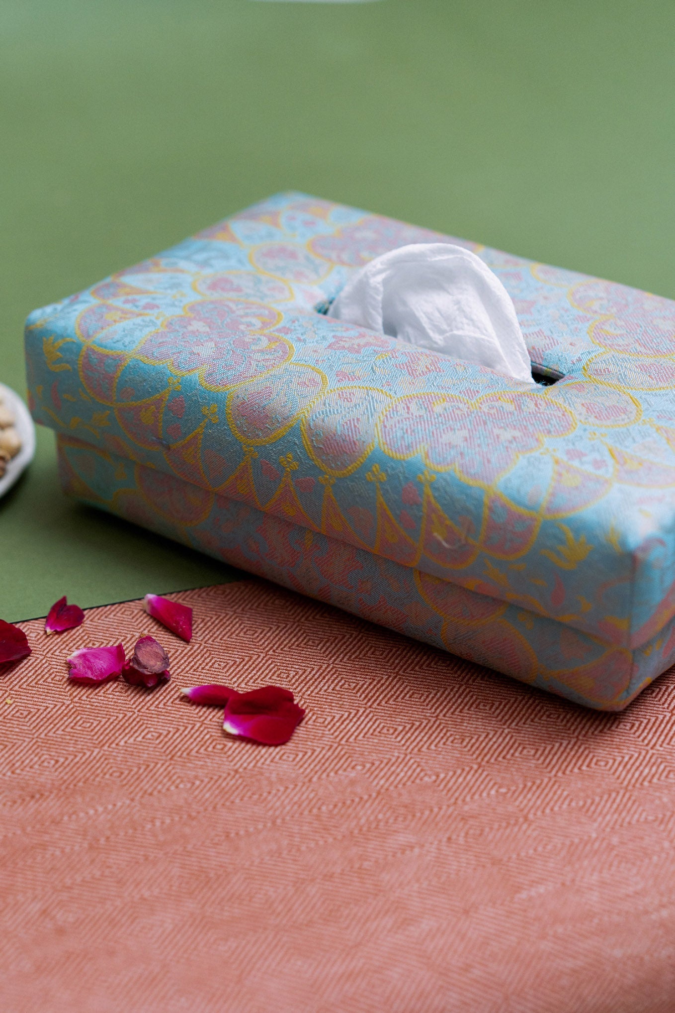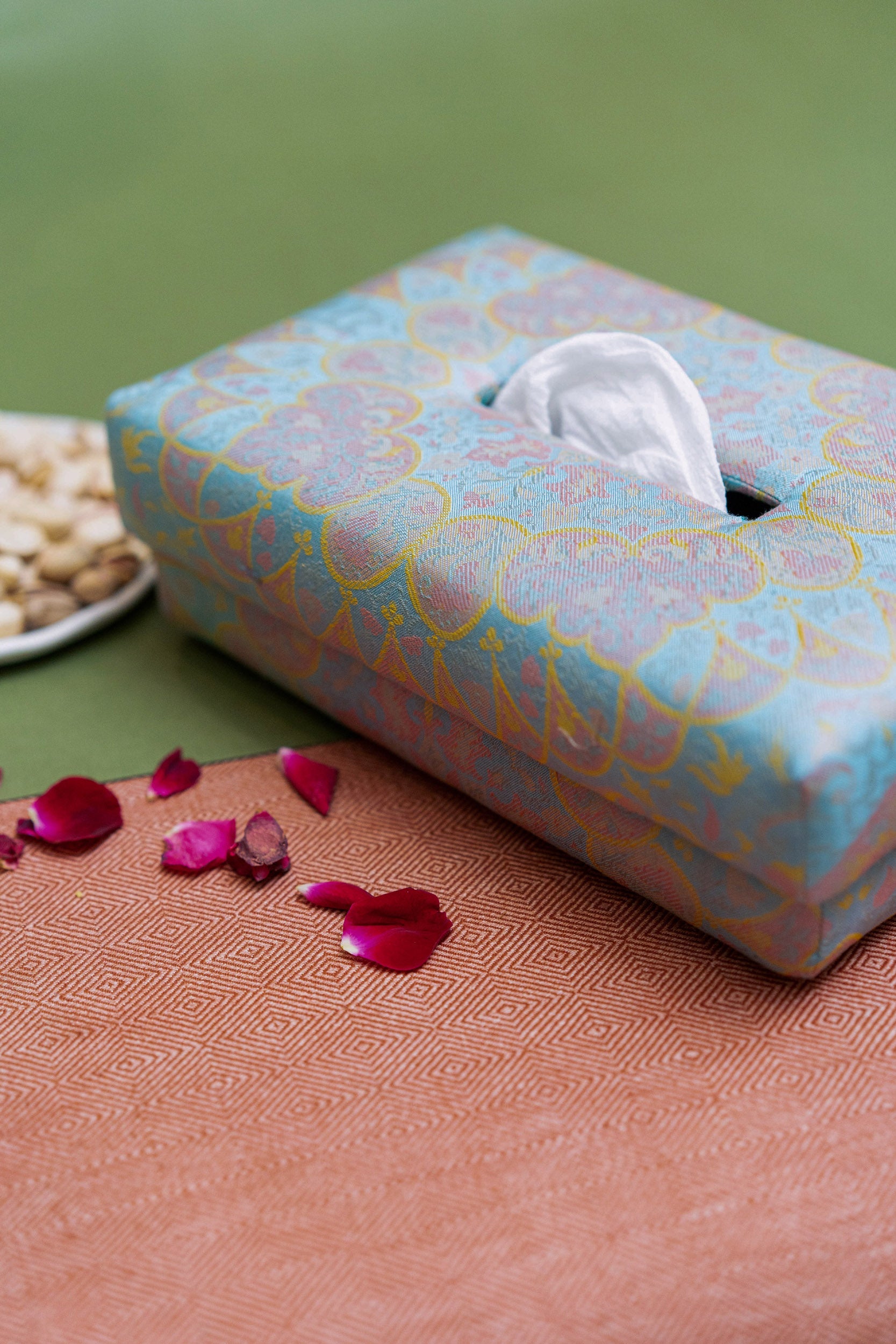 Isabeau is a hand woven silk tissue box in jacquard weaving art form that brings lightness and elegance to your bountiful table experiences. The belongingness on a new proposed table Isabeau. The tissue box appears as a new fashionable metamorphosis at a natural background.