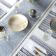 Striped in shades of a serene white and a calming grey, Lagom stands for 'just the right amount' and, is spruced with delicate patch fabrics by our proficient craftsmen. The table mats feature an attached bow. Adorned with skillful lace work, the dining set is sturdy and fuss-free.