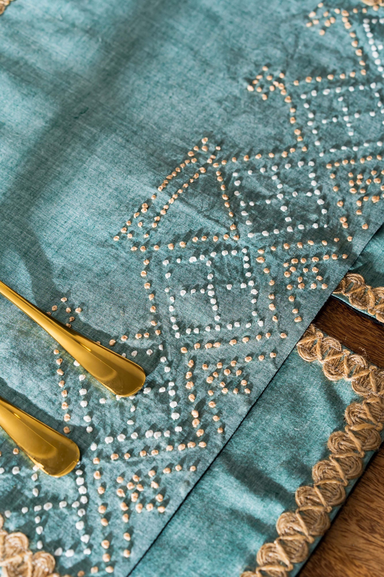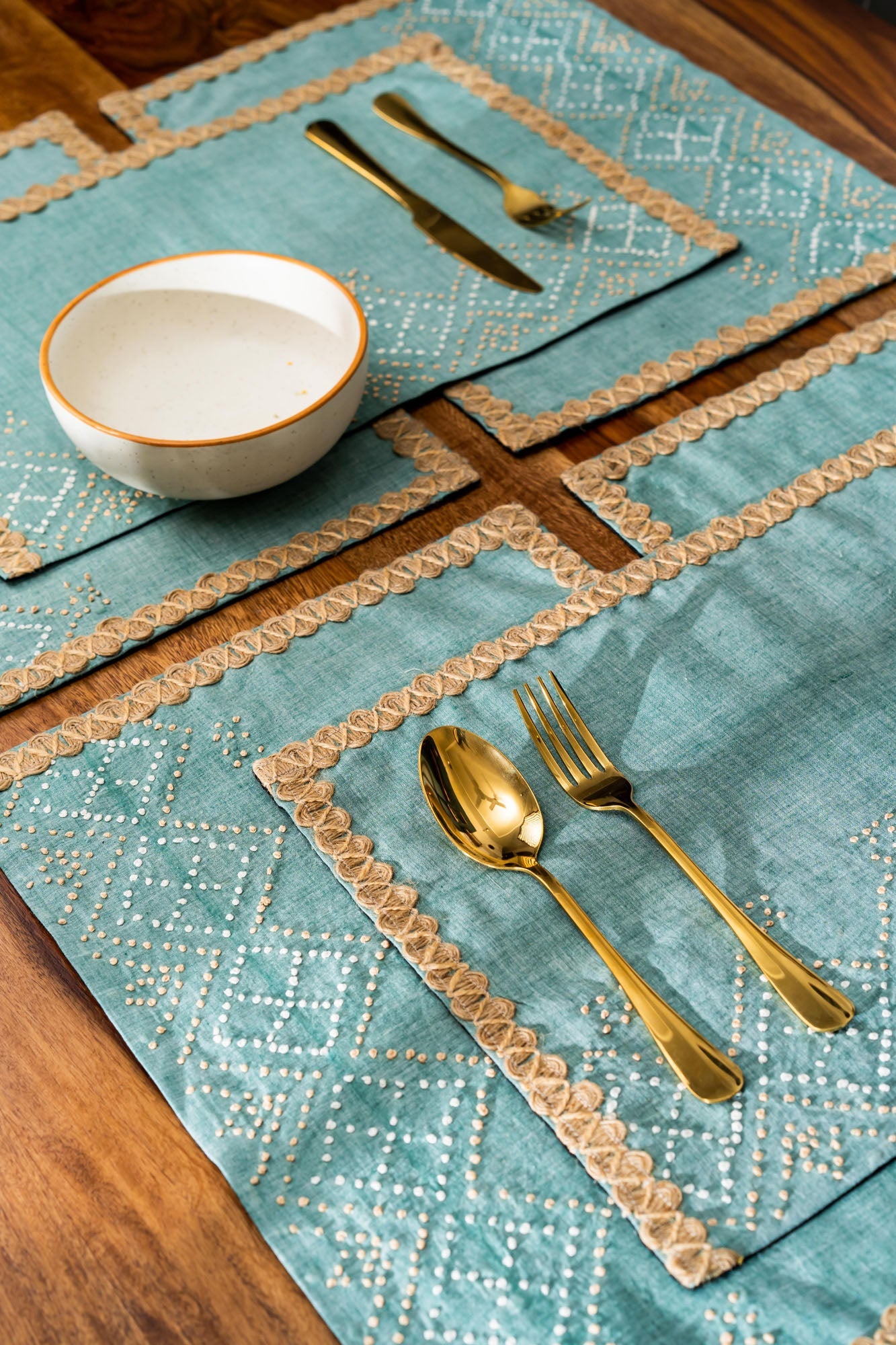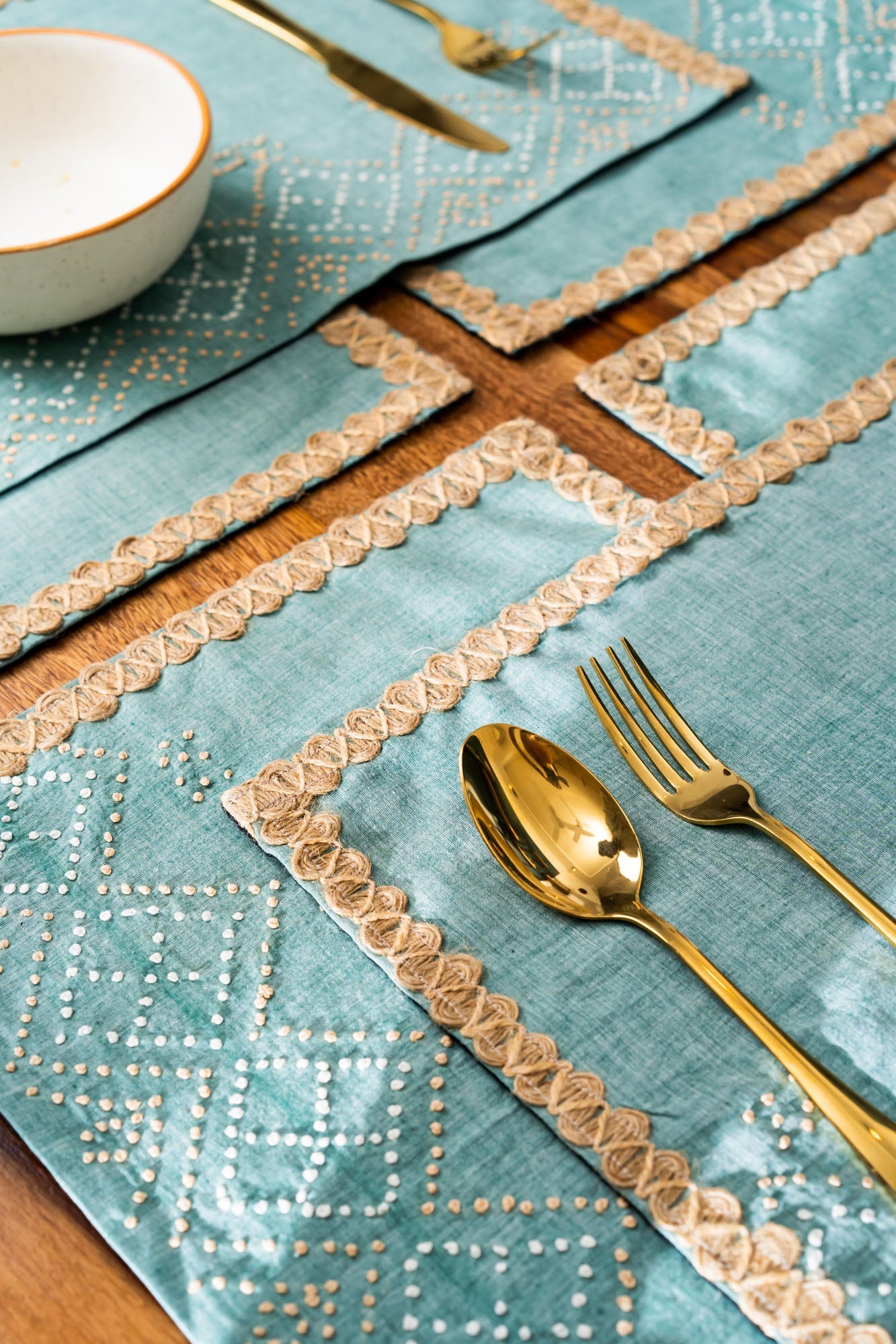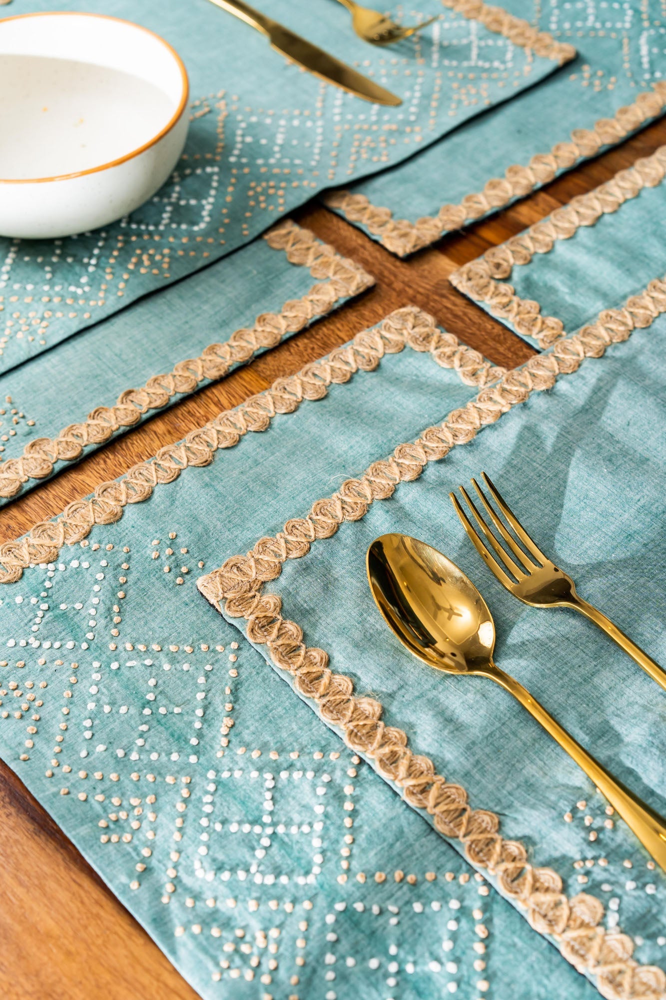 Luz Divina is a hand-worked divine light impression and theme. The table mat cotton hand work has knotted hand embroidery and jute lace expression. Place the mat on the Jute mode furnishings.