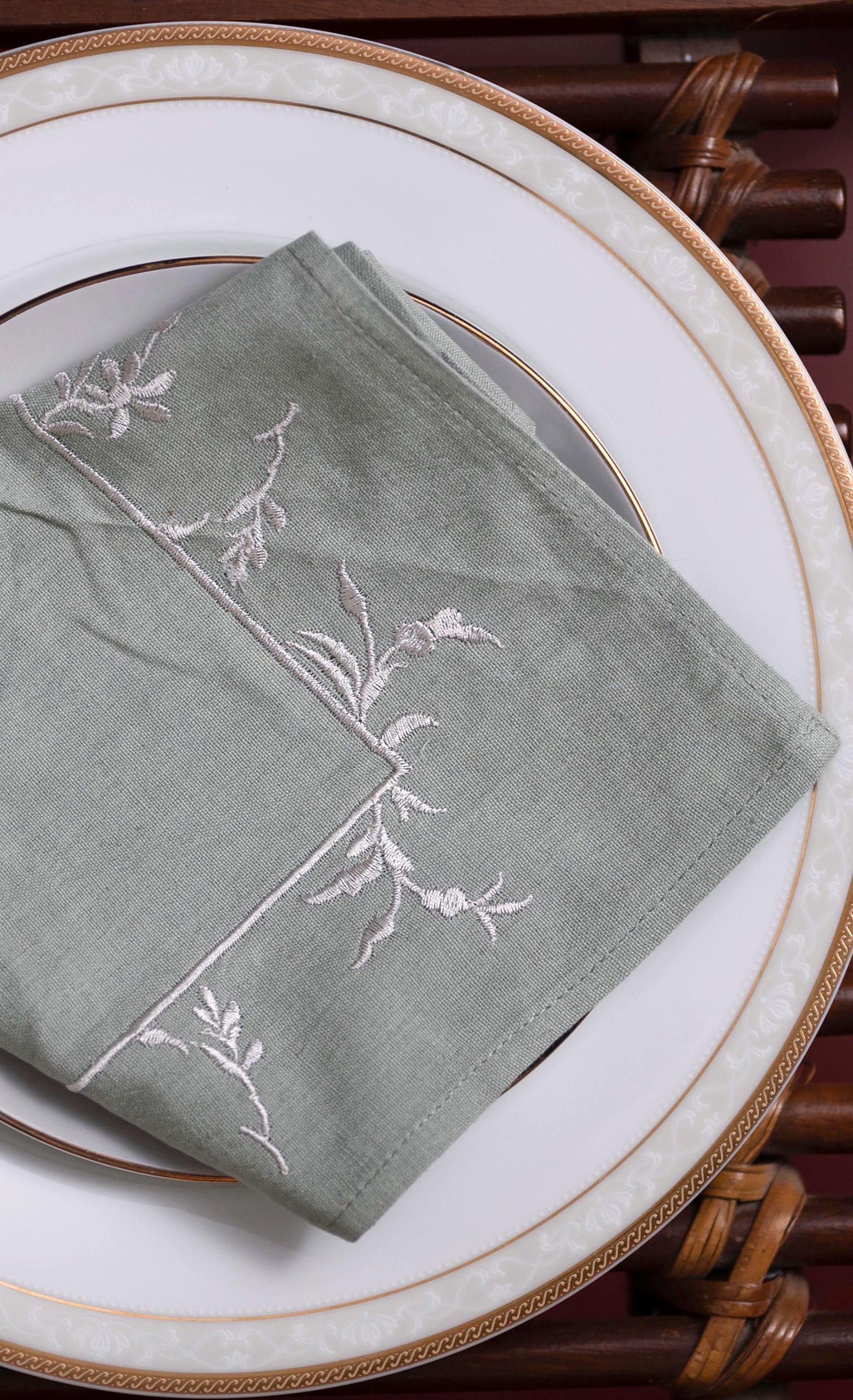 Our Maxim Handwoven Napkins, handwoven in Khadi Cotton by our weavers is a festive statement in sea green that is accented with floral motifs achieved through silk thread embroidery. Inspired by William Morris's designs, the luxurious details of the handwoven napkins bring your tablescapes alive with the spirit of the season.