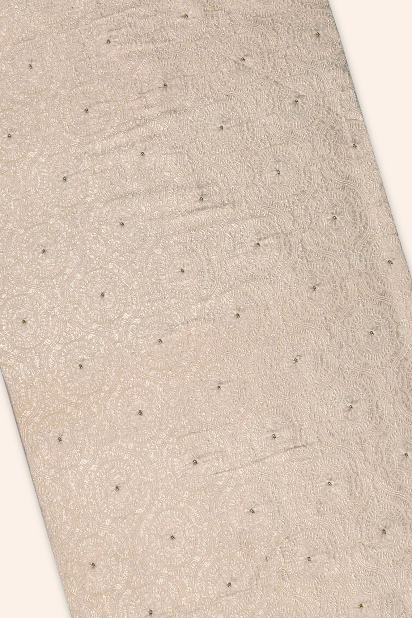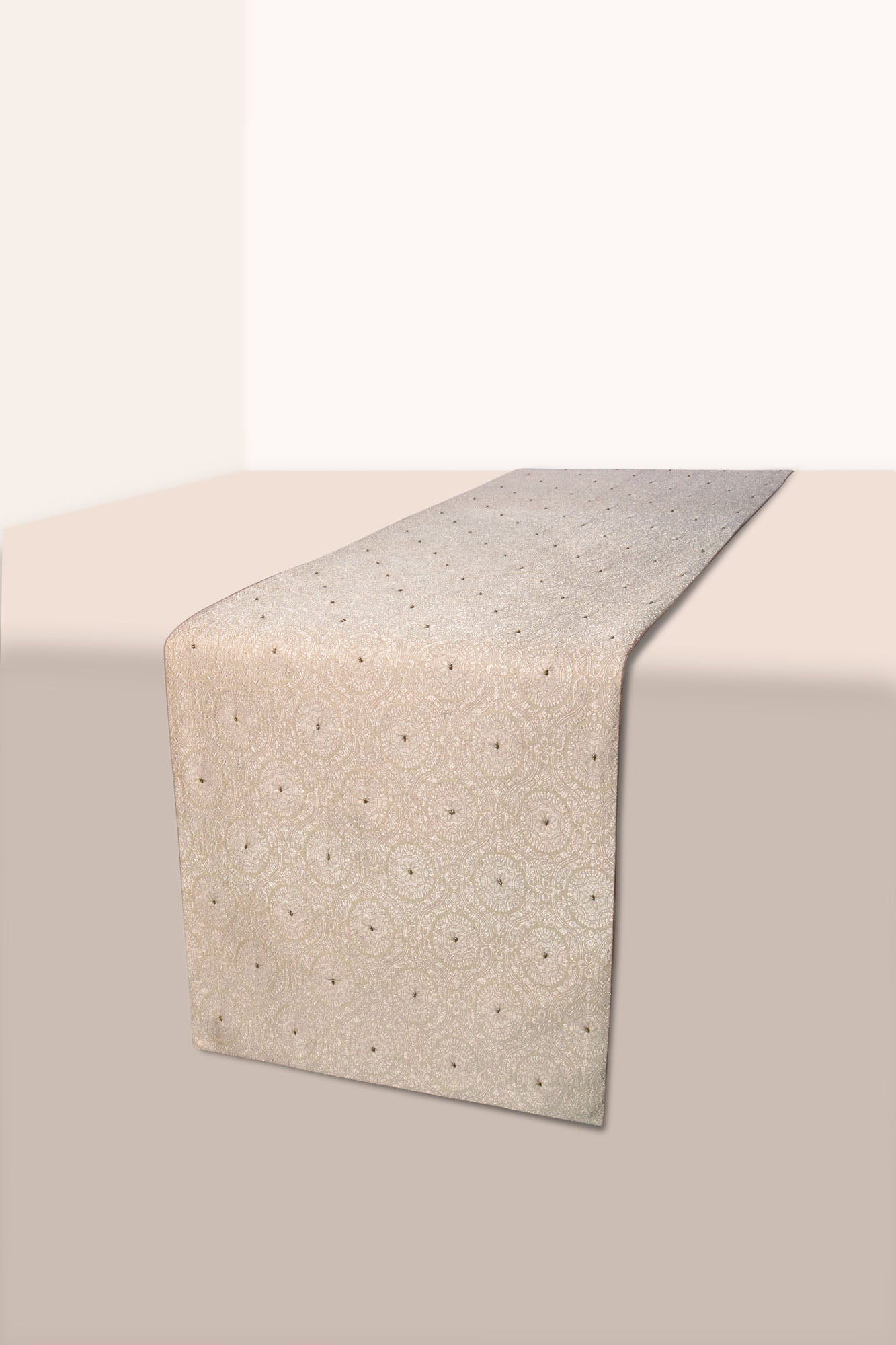 Our Mazuma Handwoven Table Runner is patterned with domes, inspired by ancient persian and iranian art. Exqusitely crafted with metallic gold zari and embellished with beads, the luxurious table runner brings glimmer to your festive tablescape.
