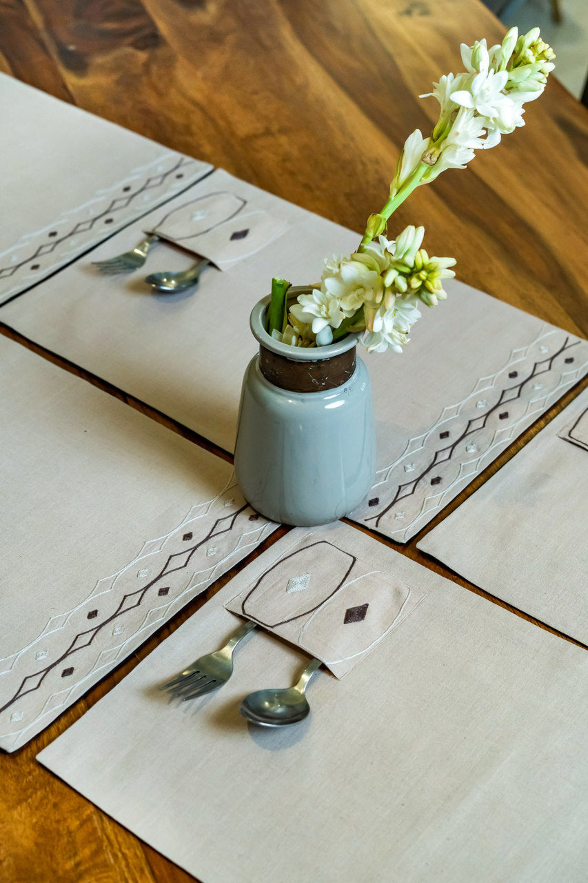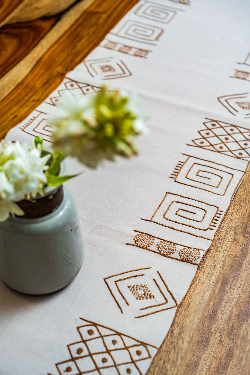 Medio lago confirms a new attitude of hand embroidery and hand-woven pure khadi cotton table runner and table mats which meets the realm of passionate chin and desire. Inspired by Mapuche art form.