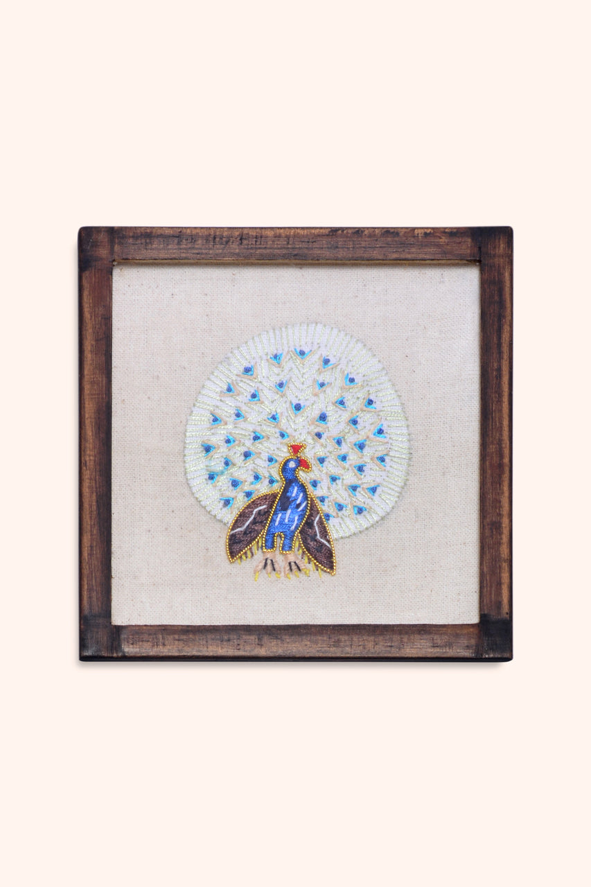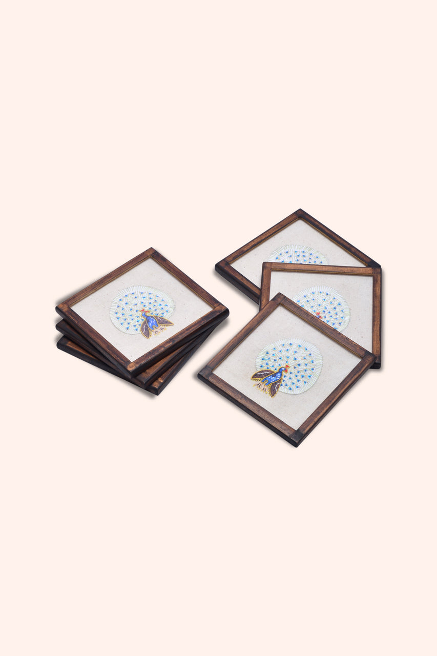 Elevate your cocktail hour with the festive flair of our Myla handwoven coasters. This set of 6 coasters is layered with peacock motifs embellished with hand-embroidered zardozi that adds an artistic charm to your festive home.