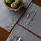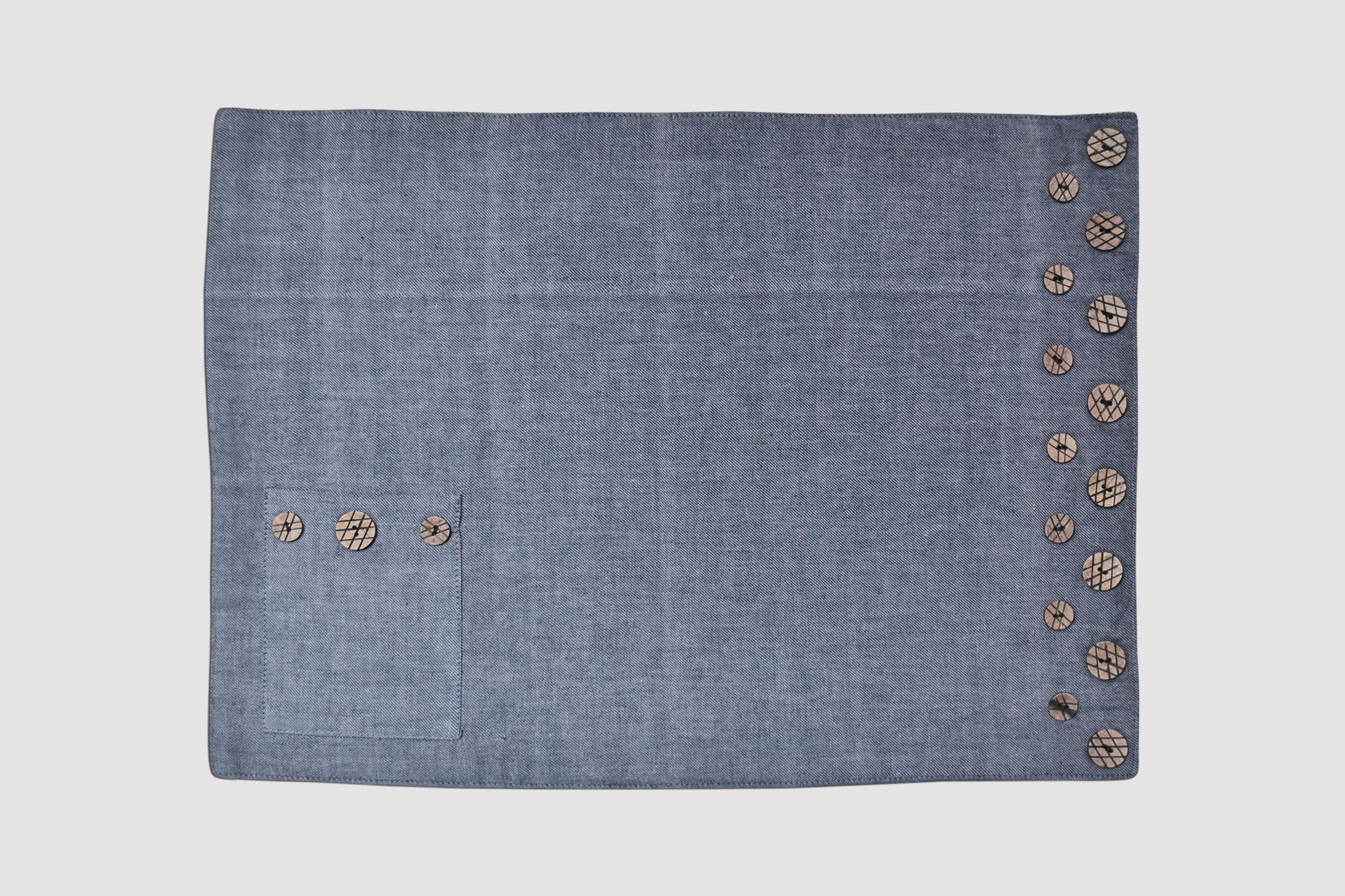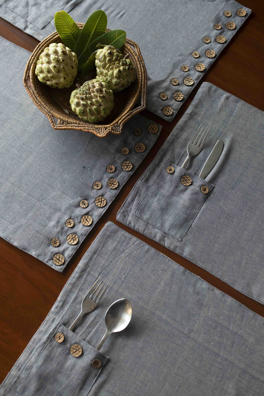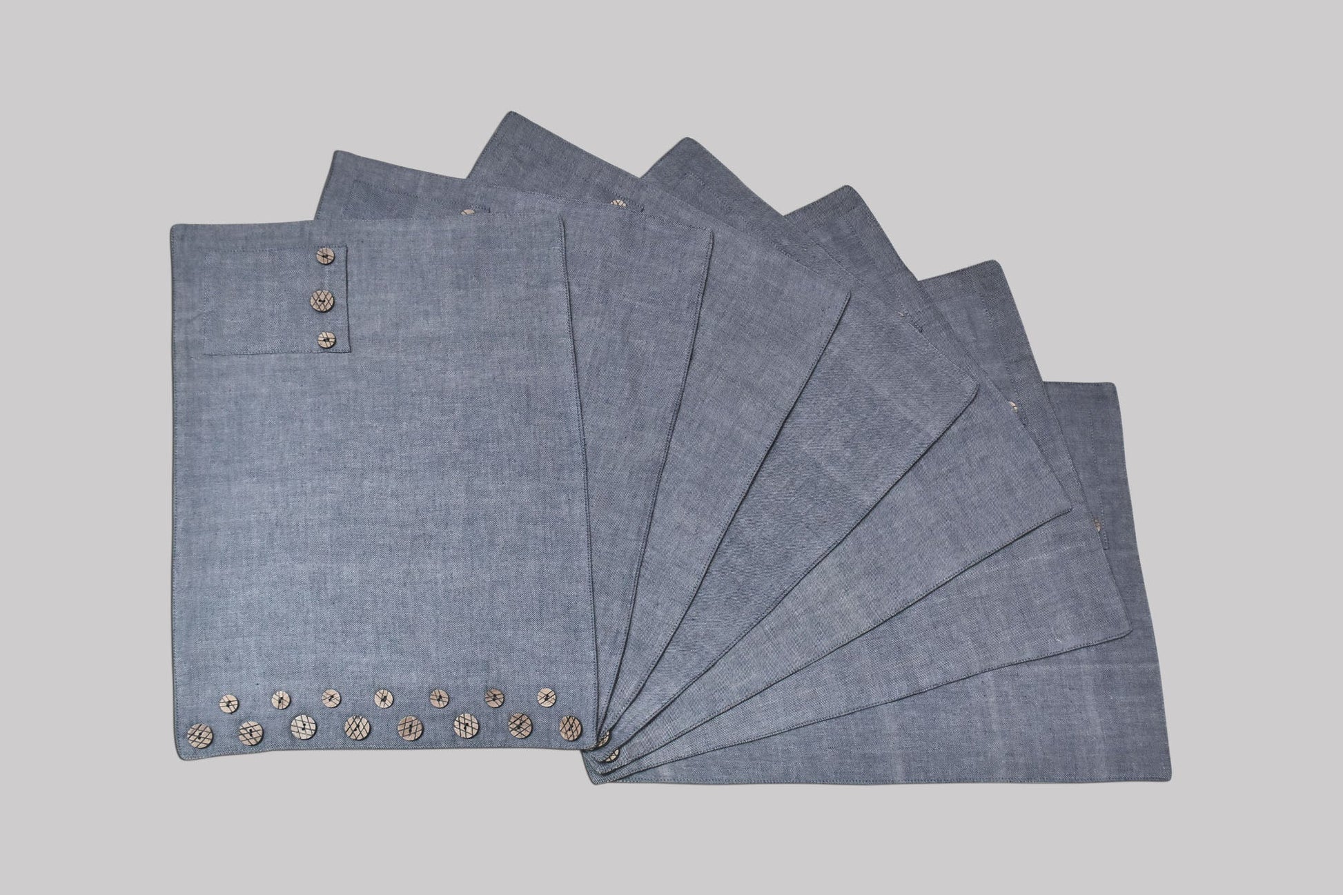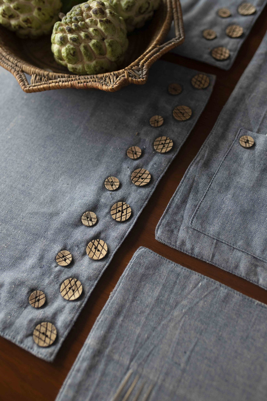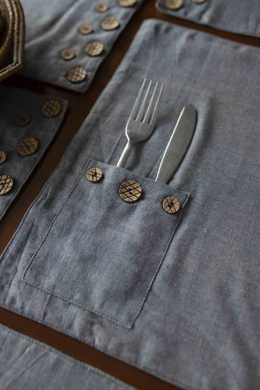 Nohea or beautiful are a unique rendition of handwoven denim cotton fabric to adorn your dining tables. Finished with minimal button design, it also features a pocket to keep your cutlery in place.