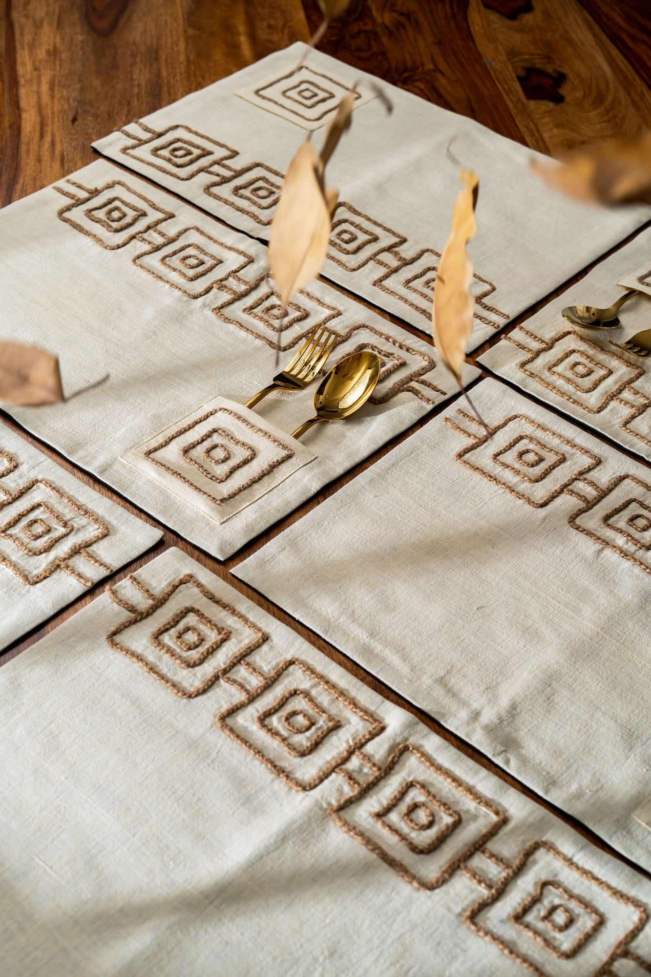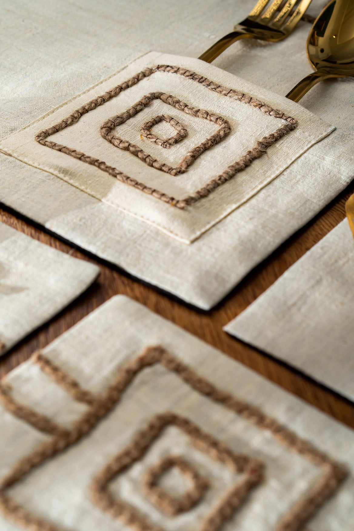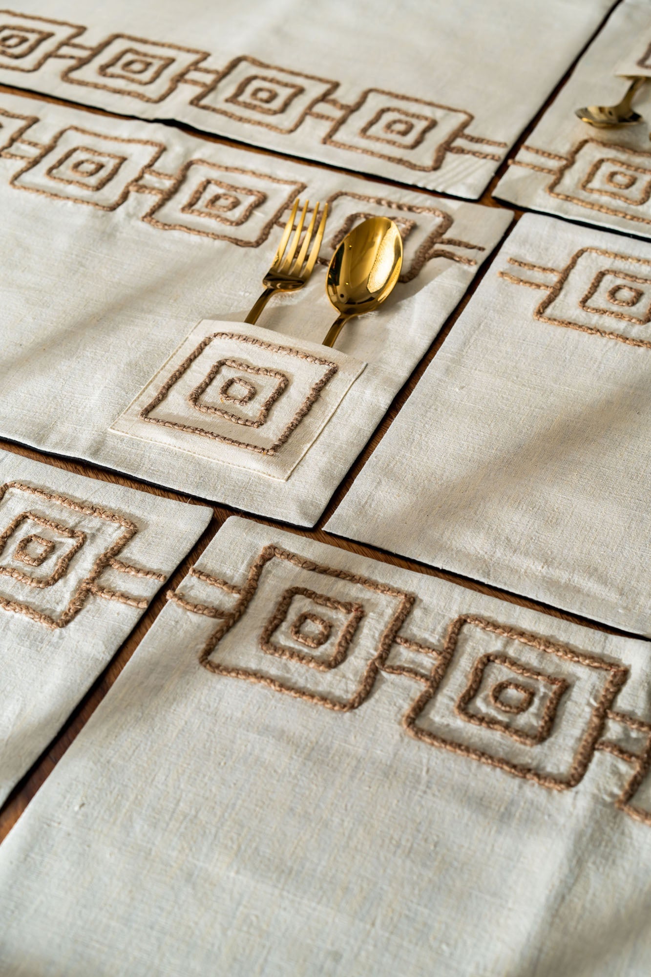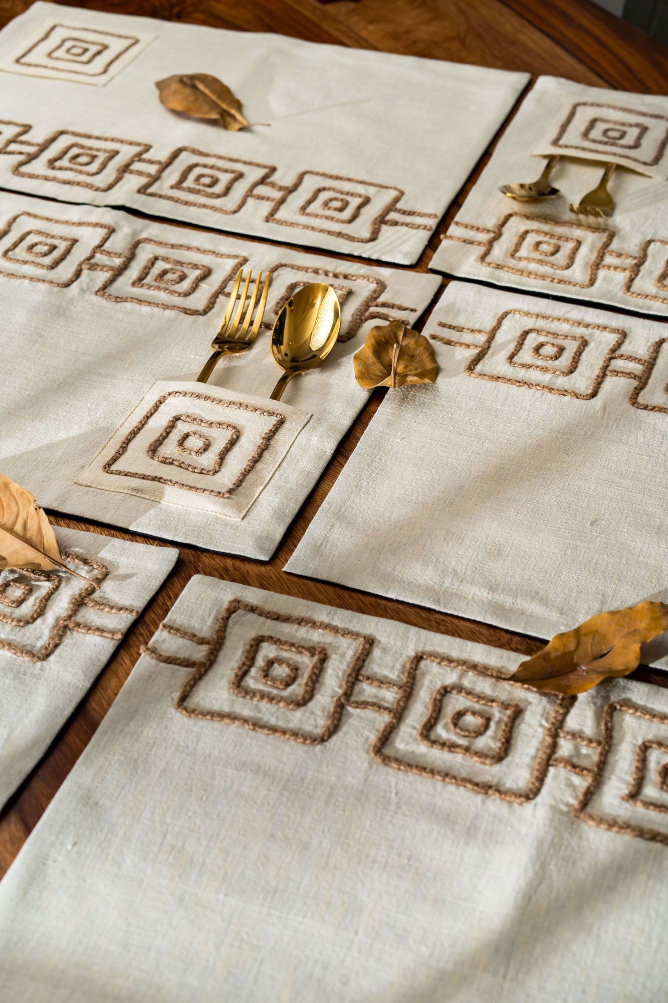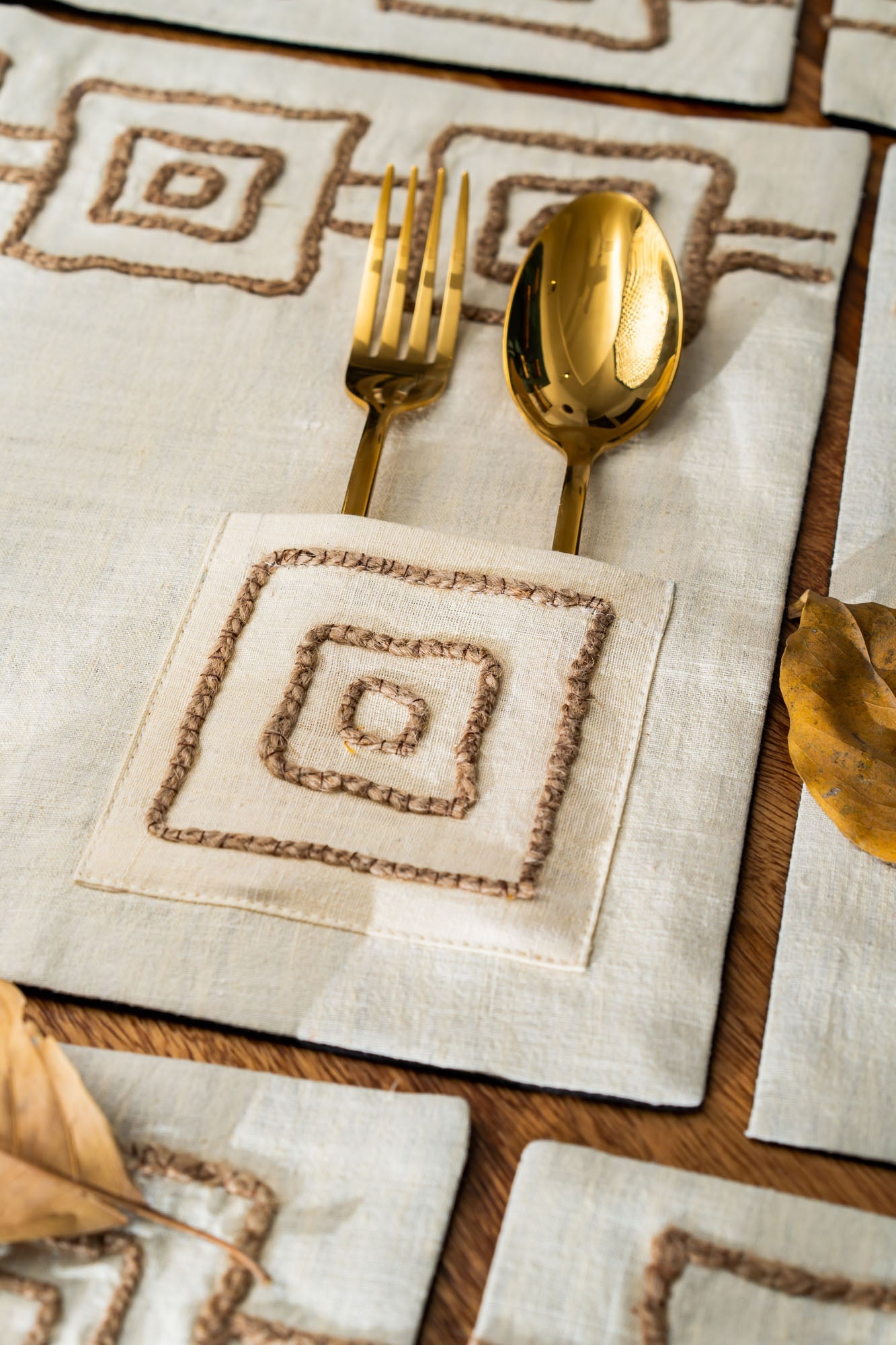 The immersiveness in the water ripples becomes ondas agua. The handwoven cotton table mat has jute hand work in twisted aqua ripple squares. The cutlery pocket adds the utility, luxury, and authenticity to the occasion.