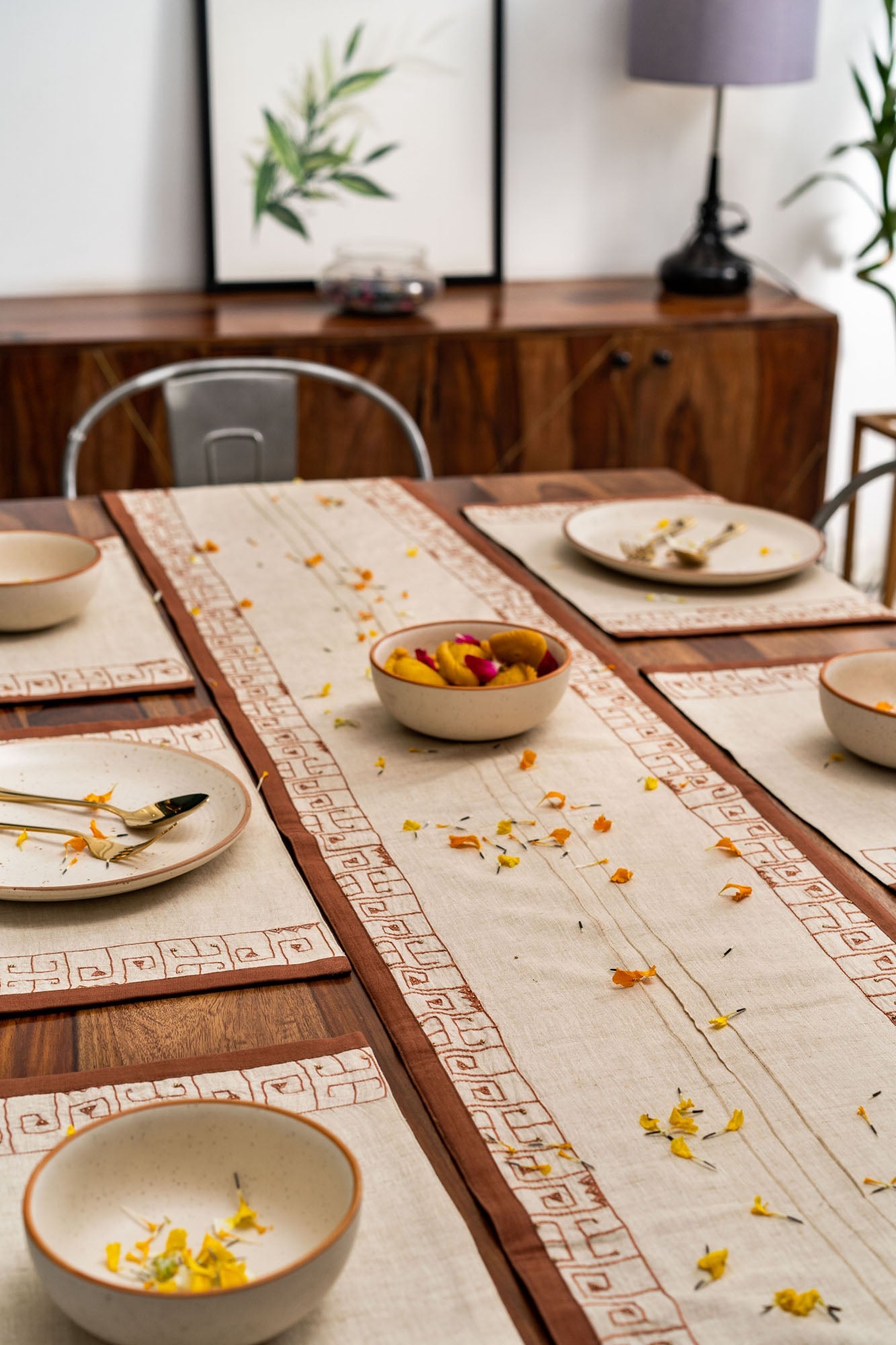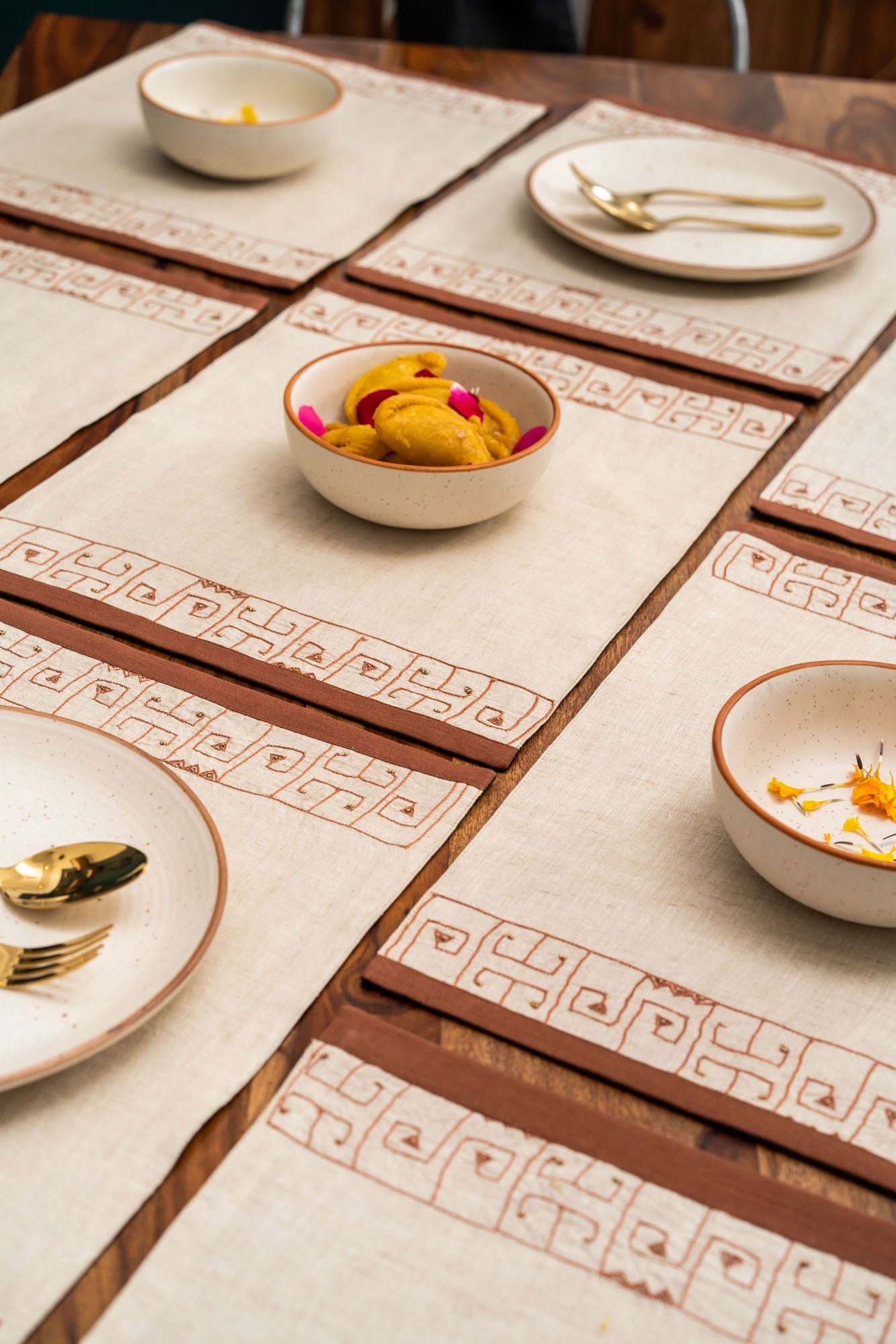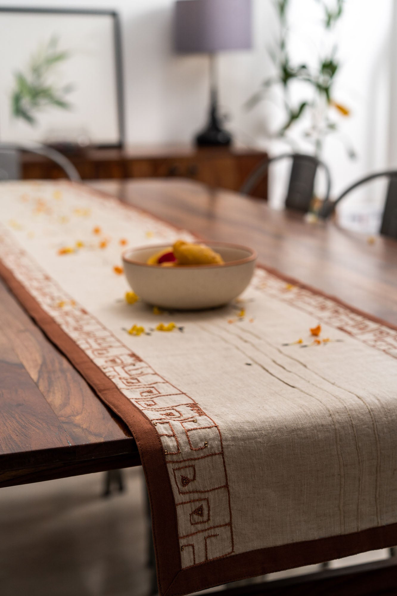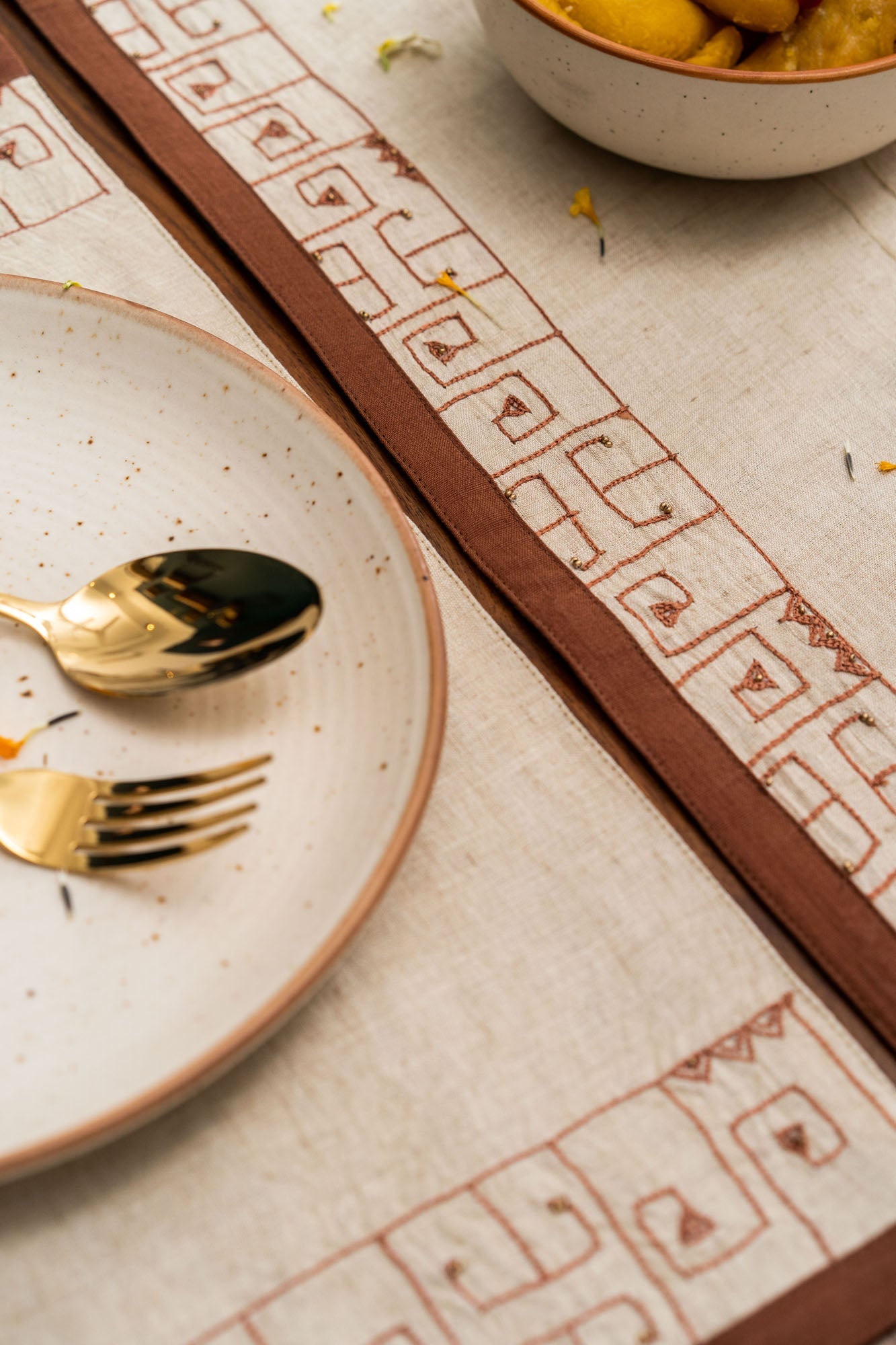 Orilla in the contemporary riverside city-limits presents the best hand-woven Linen cotton dining set with hand embroidered zardozi imaginative thread work. The Mapuche art design appears that you are looking from a skyscraper with a river flows in between a secret city. Surely you wish to spend time with the uniqueness of the moment.