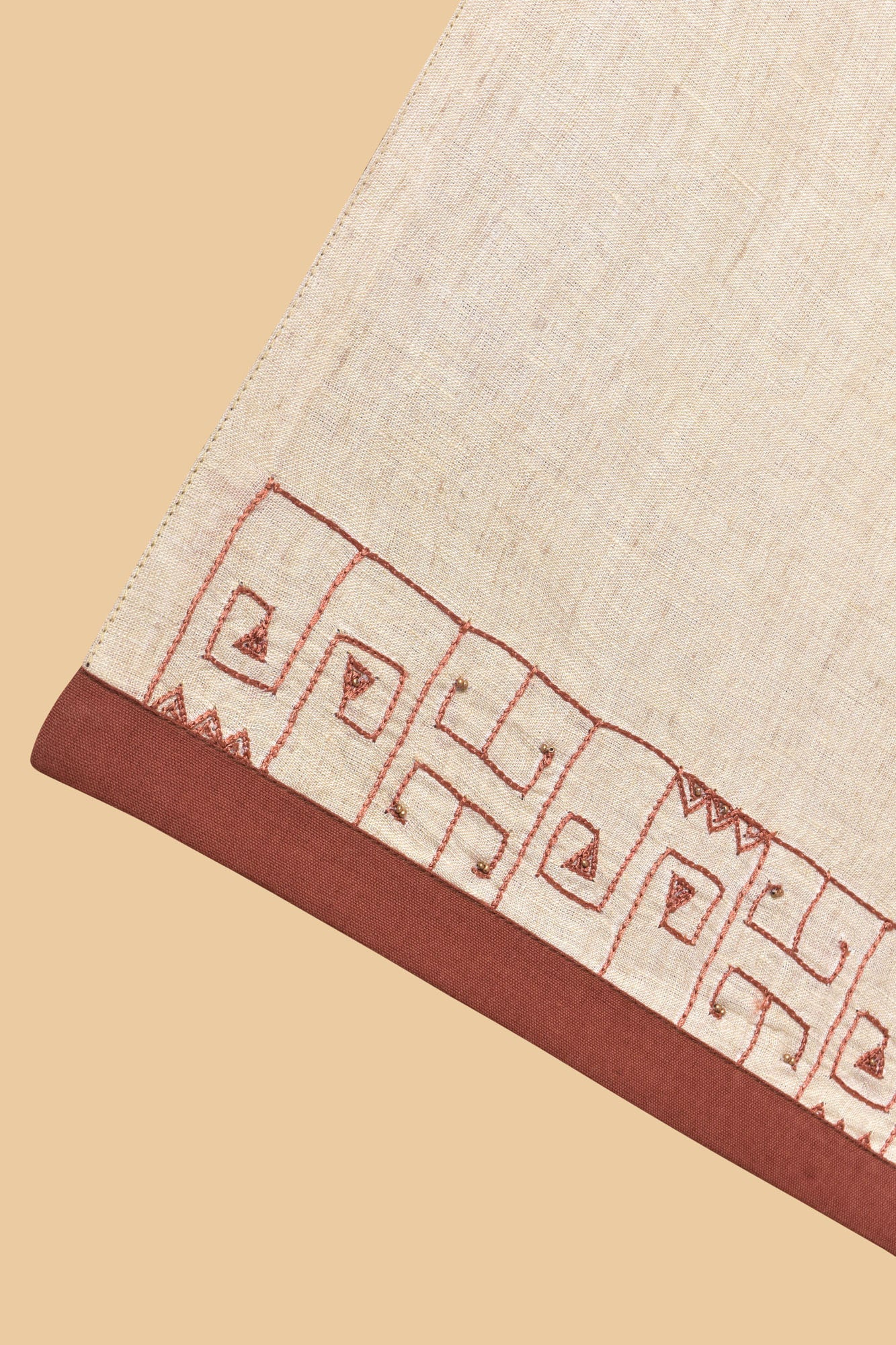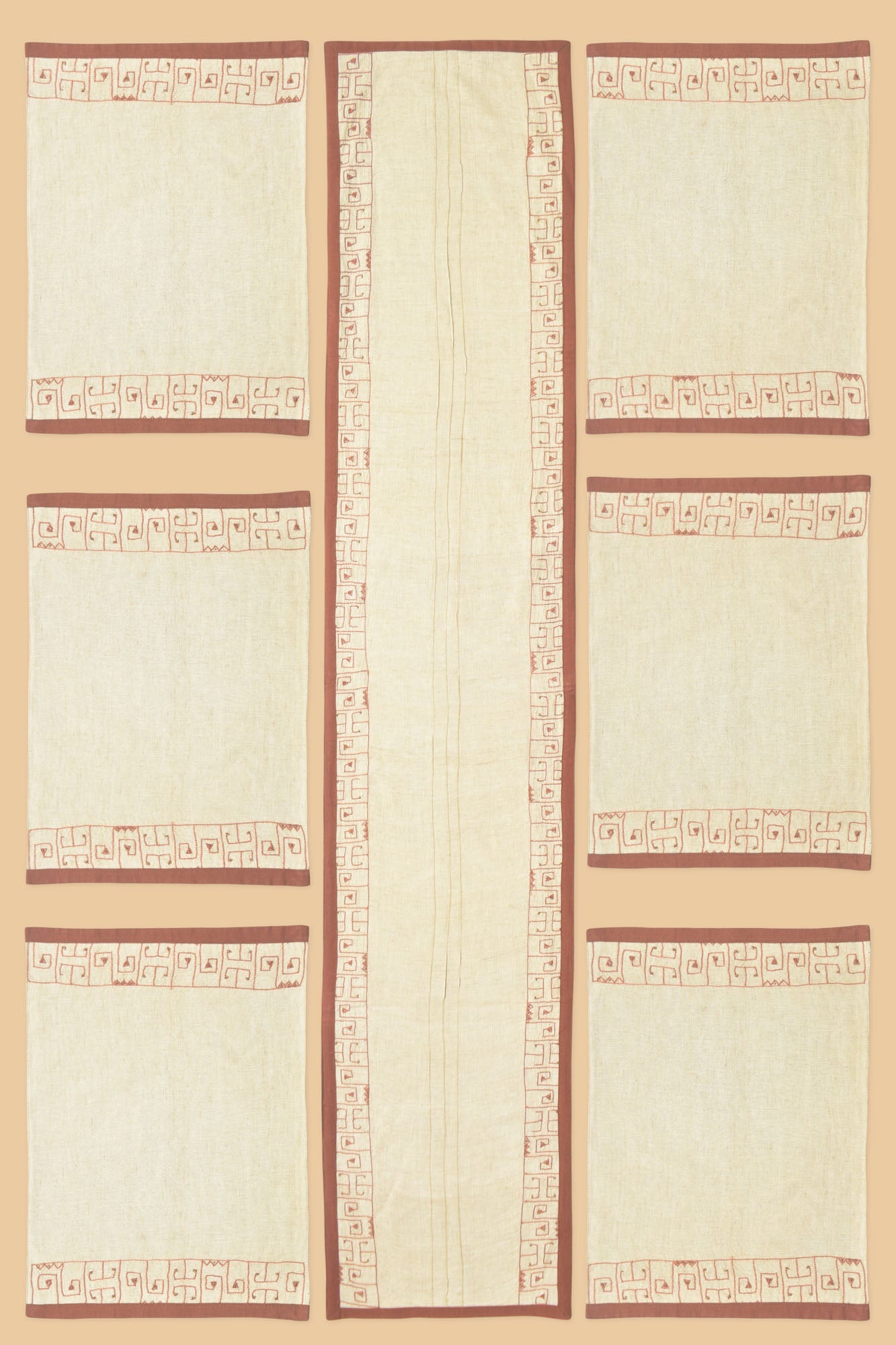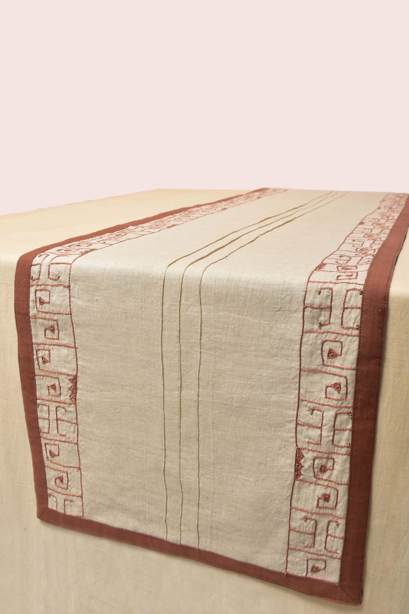 Orilla in the contemporary riverside city-limits presents the best hand-woven Linen cotton dining set with hand embroidered zardozi imaginative thread work. The Mapuche art design appears that you are looking from a skyscraper with a river flows in between a secret city. Surely you wish to spend time with the uniqueness of the moment.