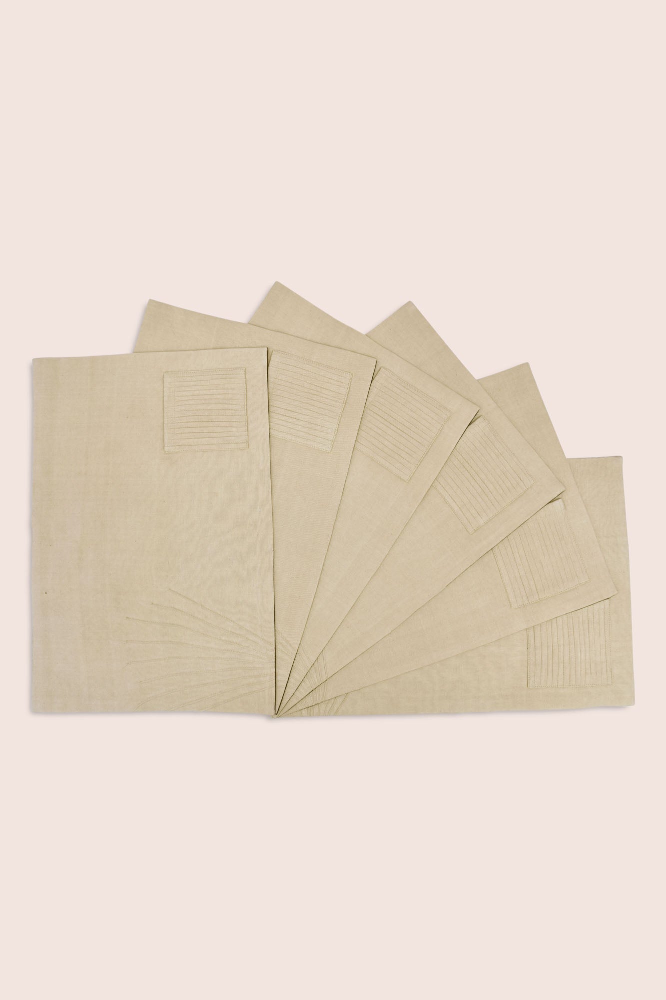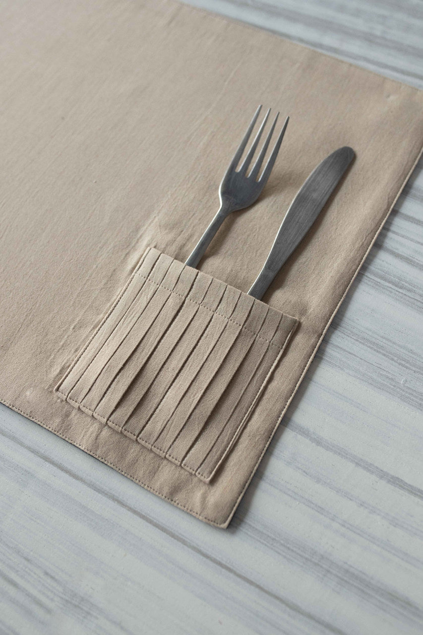 Plexure or interweave table mats are handmade with care from pure cotton yarns in a calming beige. It also features tuckes and a pocket patch for cutlery, to make your meal times serene and peaceful.