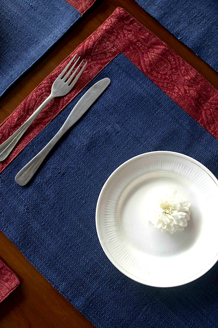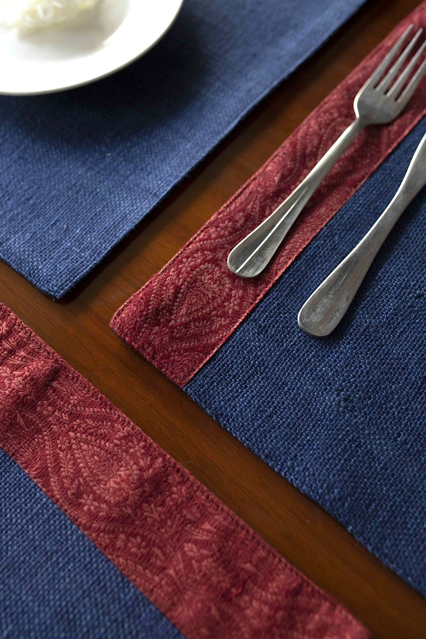 Poiesir or creation is an ode to our artisans creativity. Handwoven in pure khadi cotton fabric and finished patch red hand woven paisley jacquard fabric, our table mats are an attractive decoration for your dining tables.