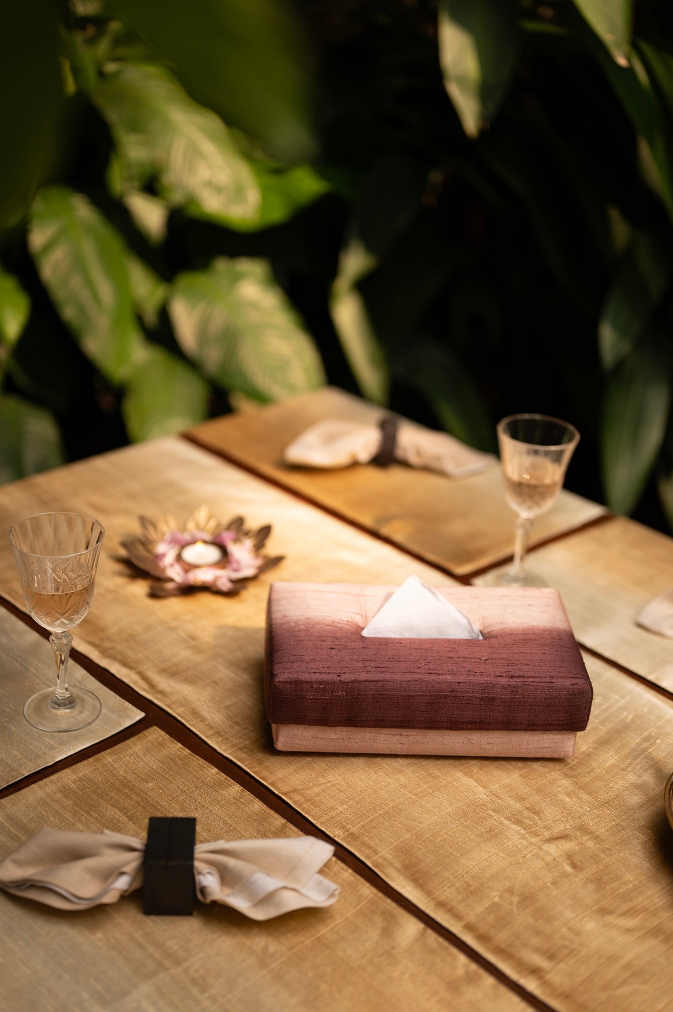 Introducing our Queen's Elegant Handwoven Dining Set, a vivid showcase of tie and dye patterns that can effortlessly enliven any dining area in your home. The table mats and runner are meticulously crafted with a gradient hand-dye technique, enhancing the tactile experience with dual-shaded Dupion Silk. This exquisite set brings a touch of opulence and sophistication to your dining table, elevating your dining experience to a new level of richness and elegance.