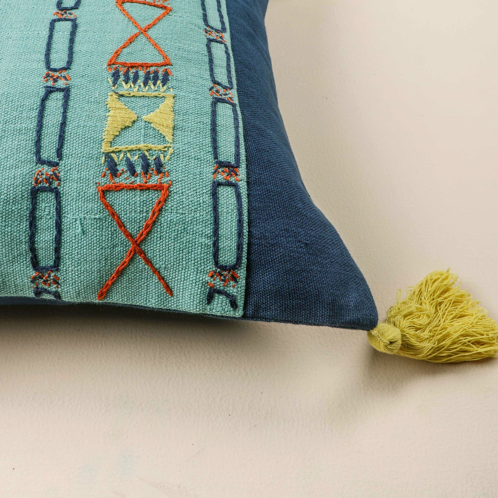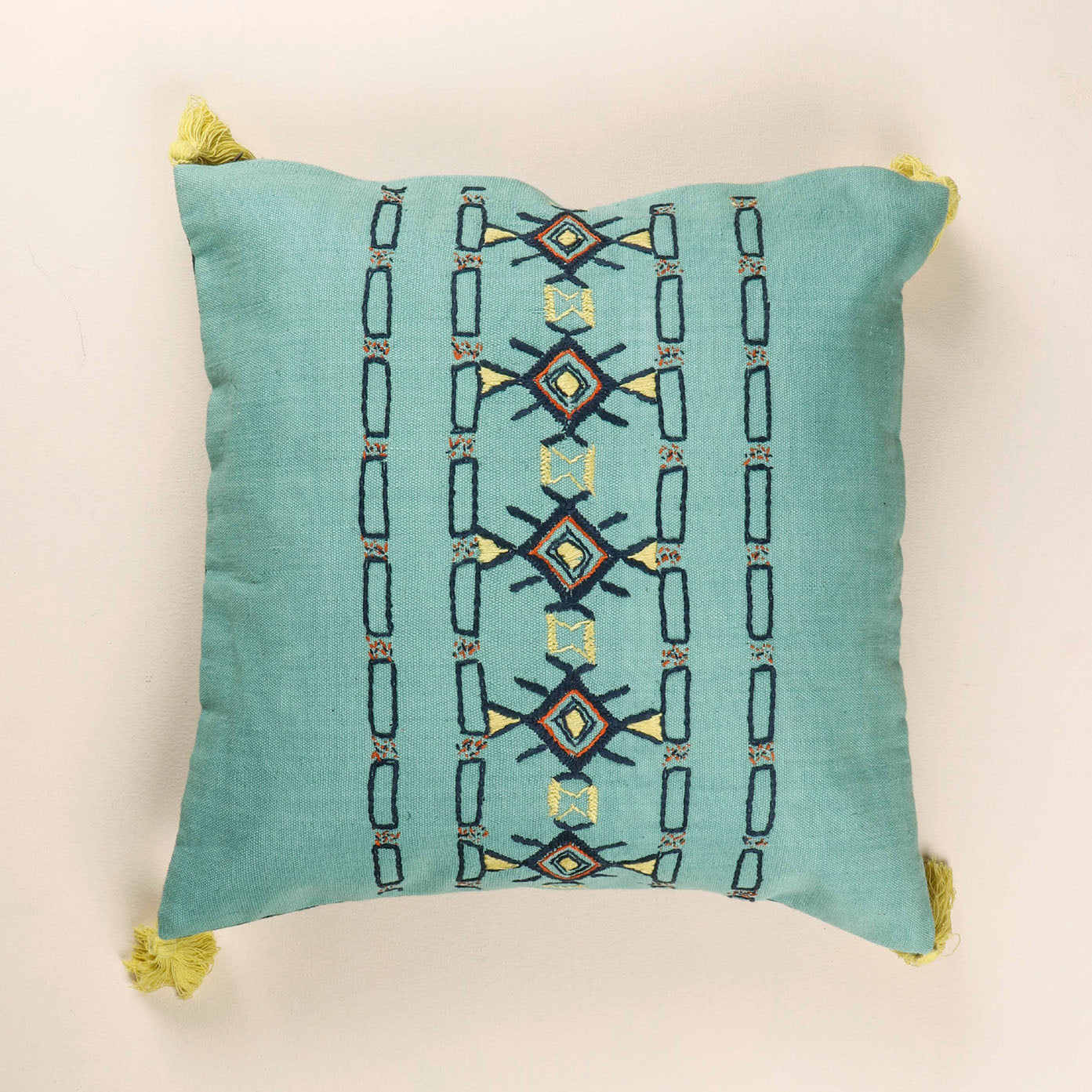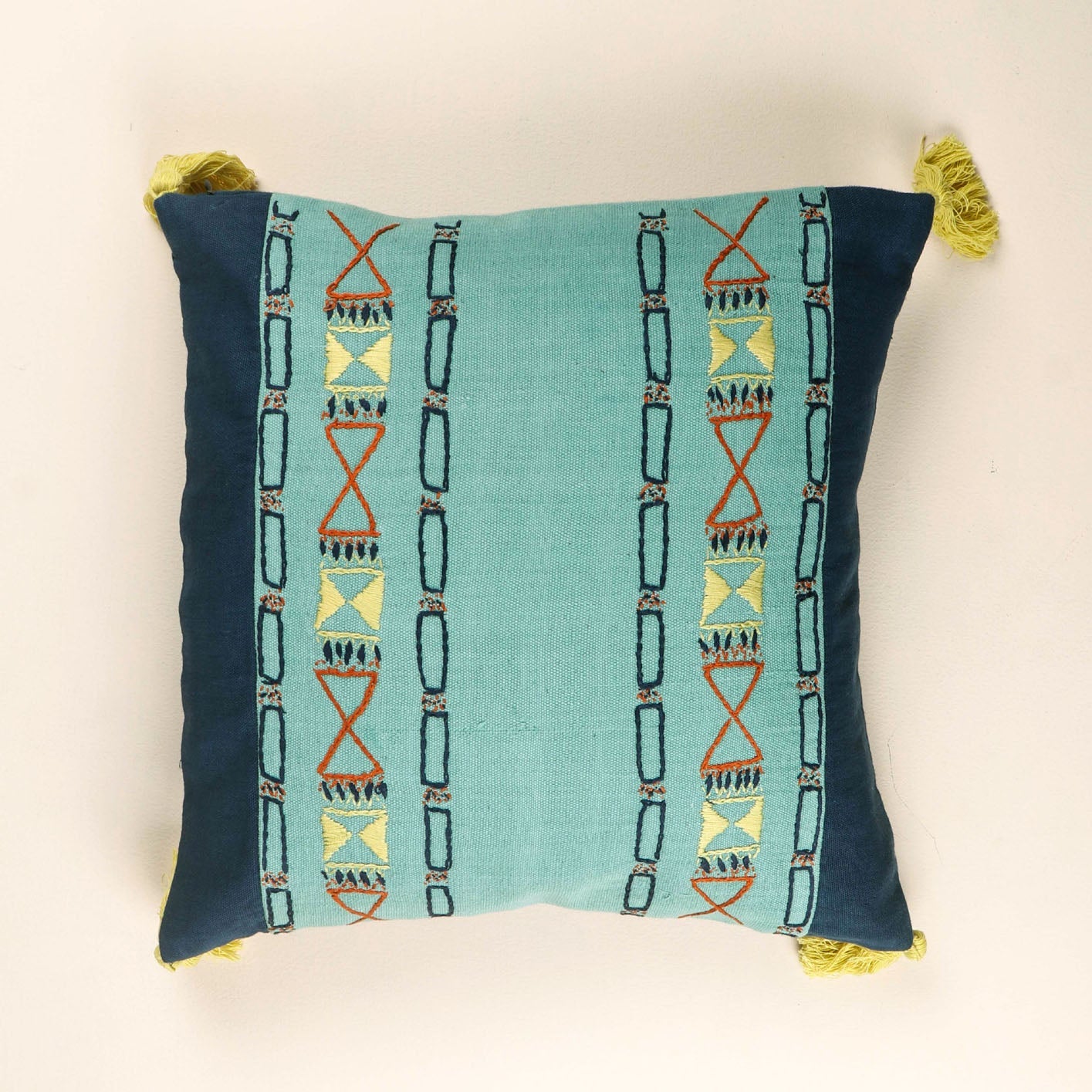 The contrasting colours of blue and yellow makes the Sara handwoven cotton cushion stand apart from the rest. Translating to ‘vivid’, the Sara cushion impresses all individuals with its elaborate chain and satin hand embroidery on the patterns; inspired by the African-Aztec culture.