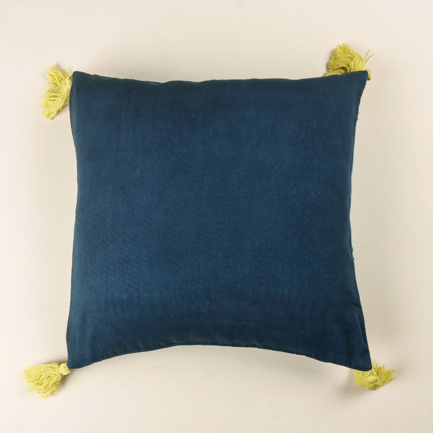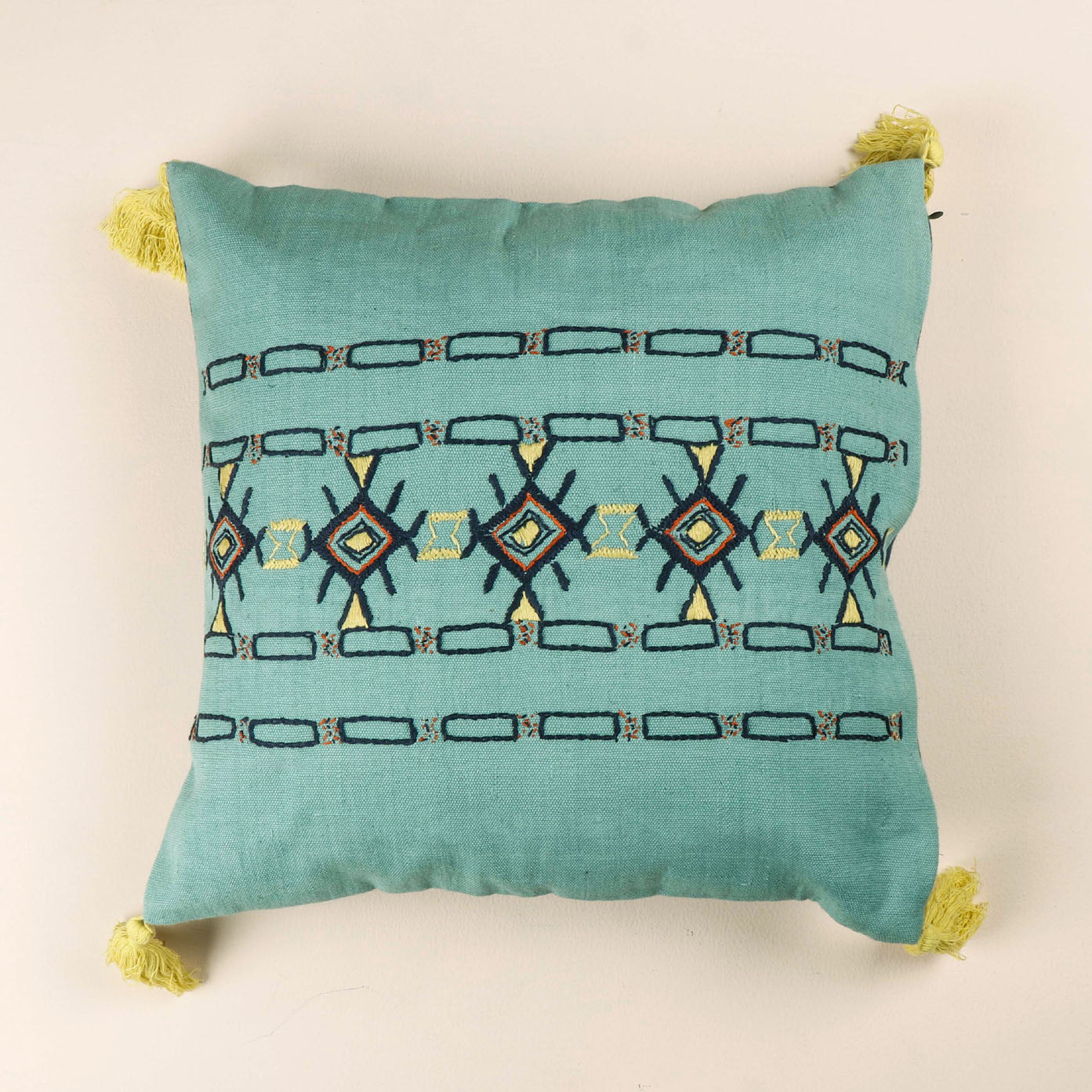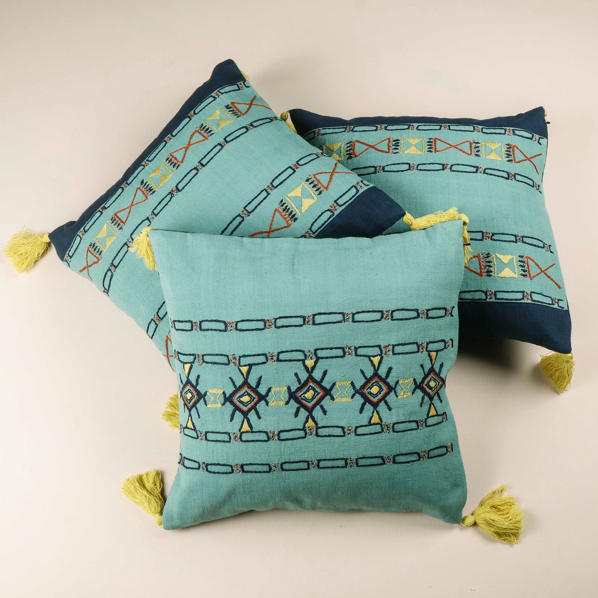 The contrasting colours of blue and yellow makes the Sara handwoven cotton cushion stand apart from the rest. Translating to ‘vivid’, the Sara cushion impresses all individuals with its elaborate chain and satin hand embroidery on the patterns; inspired by the African-Aztec culture.