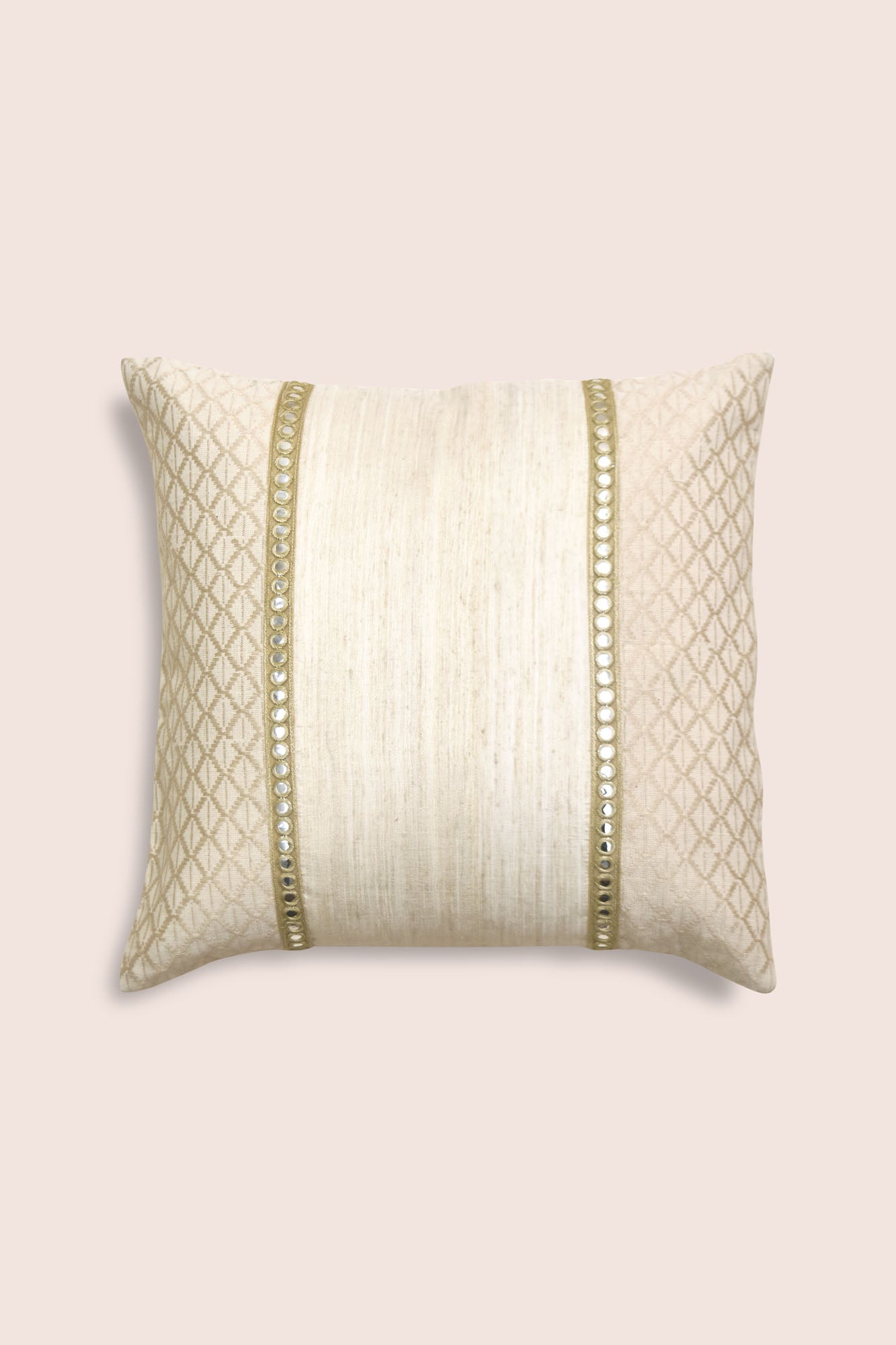 Inject a splash of illuminating shades of Ivory or gold to your furniture, this festive season. The Scintilla cushion indeed scintillates any corner with its pure, handwoven Matka silk and cotton fabric with an added touch of mirror work on its borders for that festive feel.