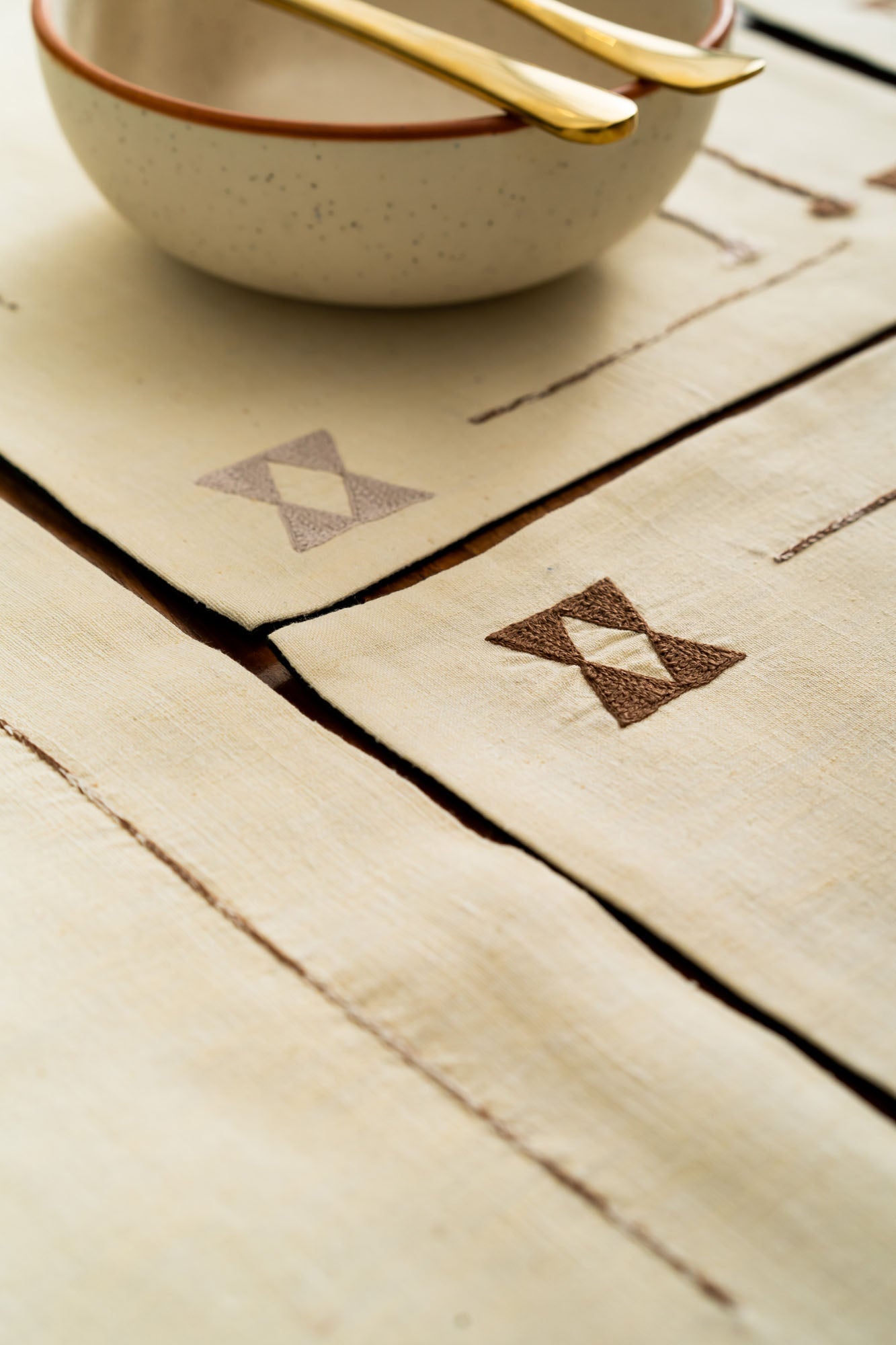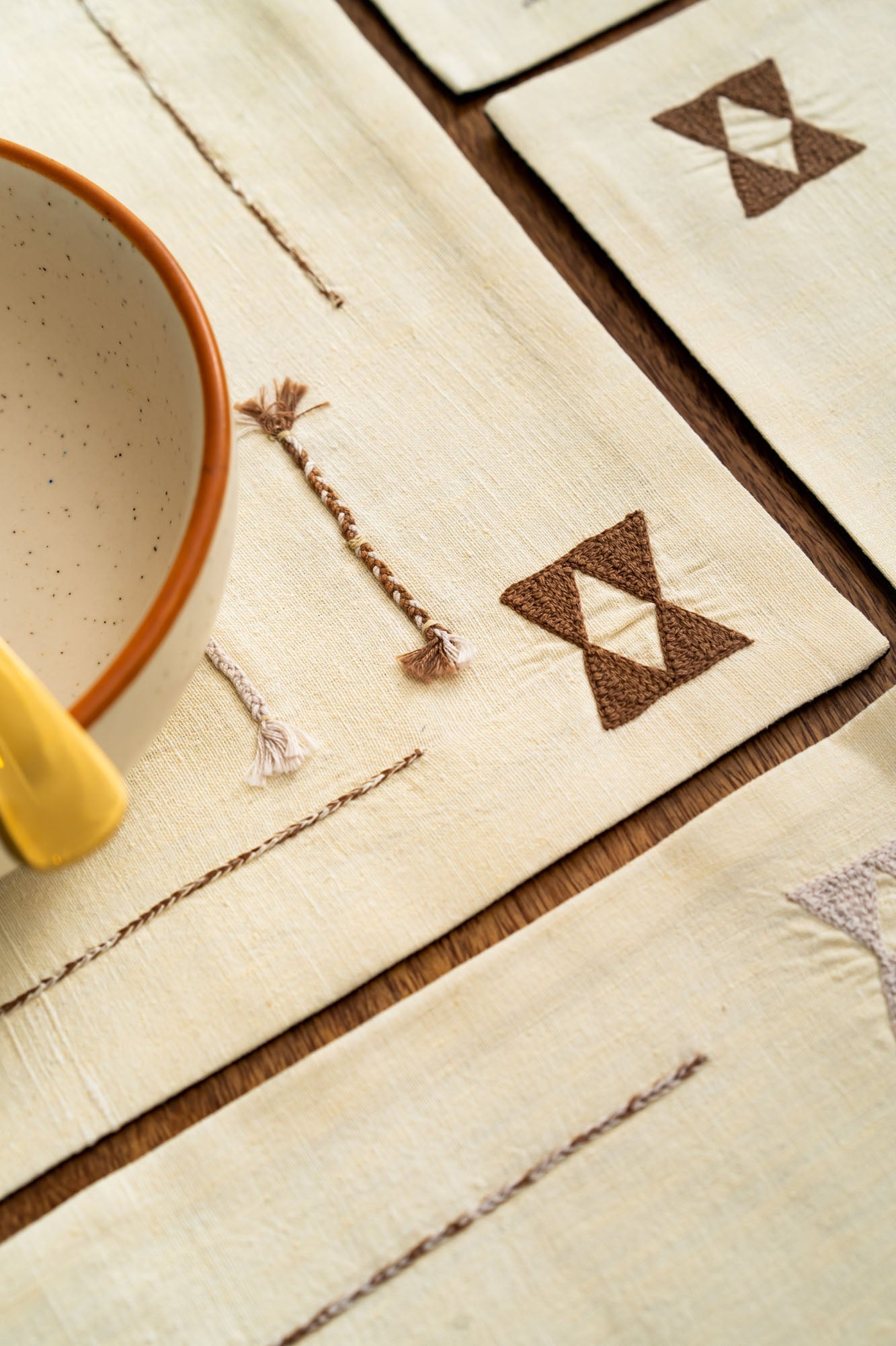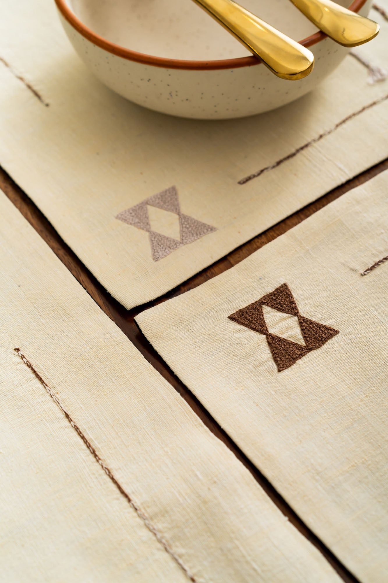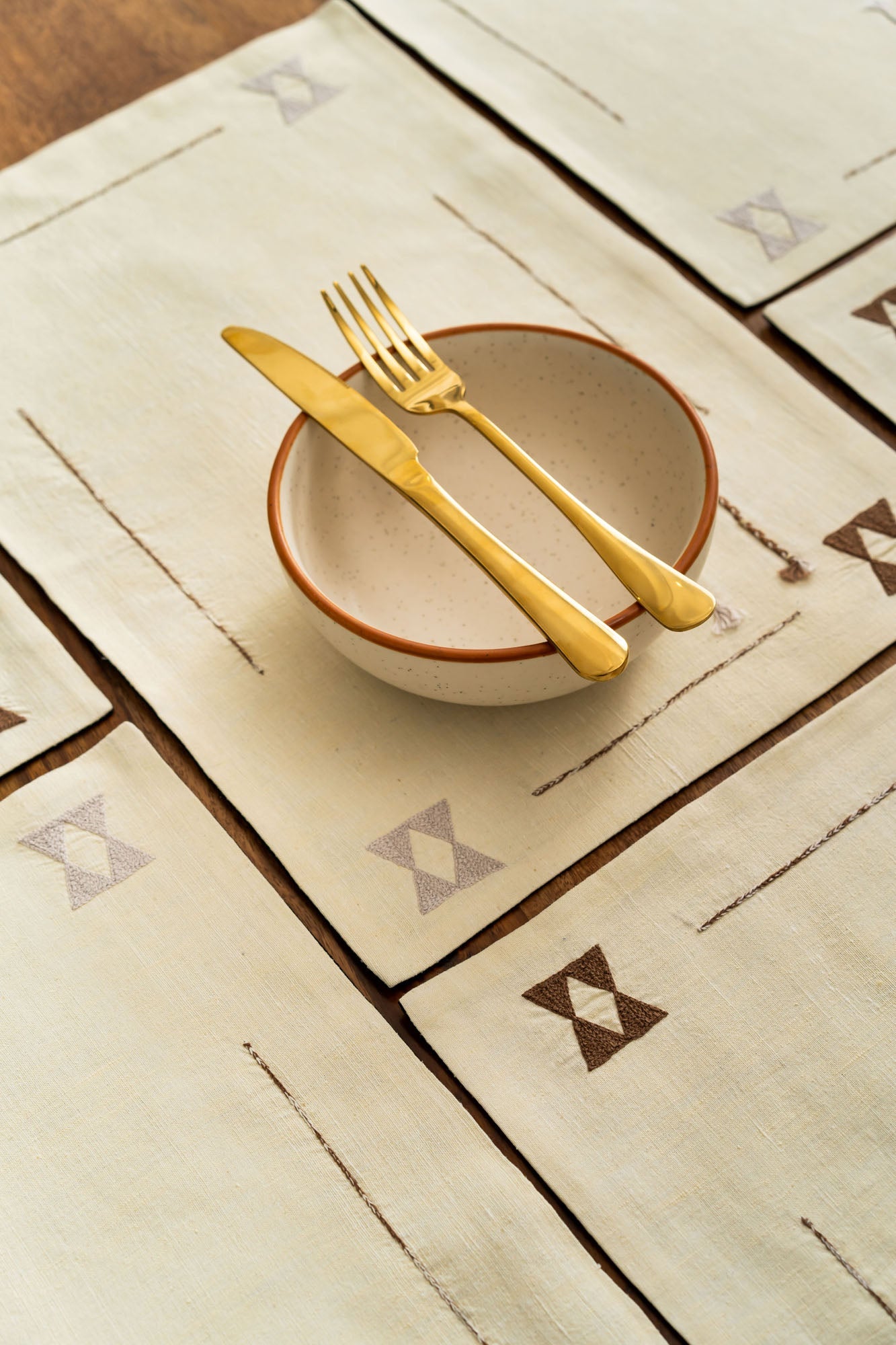 Sokuban is inspired by the Aztec Japanese art and culture that requires the side plates. This table mat set is a fusion artwork created in handwoven cotton fabric with hand embroidery junctions. The elite and imperial style lounge and dining furniture suits best with the theme. Comes with a cutlery pocket.