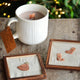 The set includes one beanie coaster & one sock coaster +Hazelnut Cappuccino Candle in a ceramic cup.