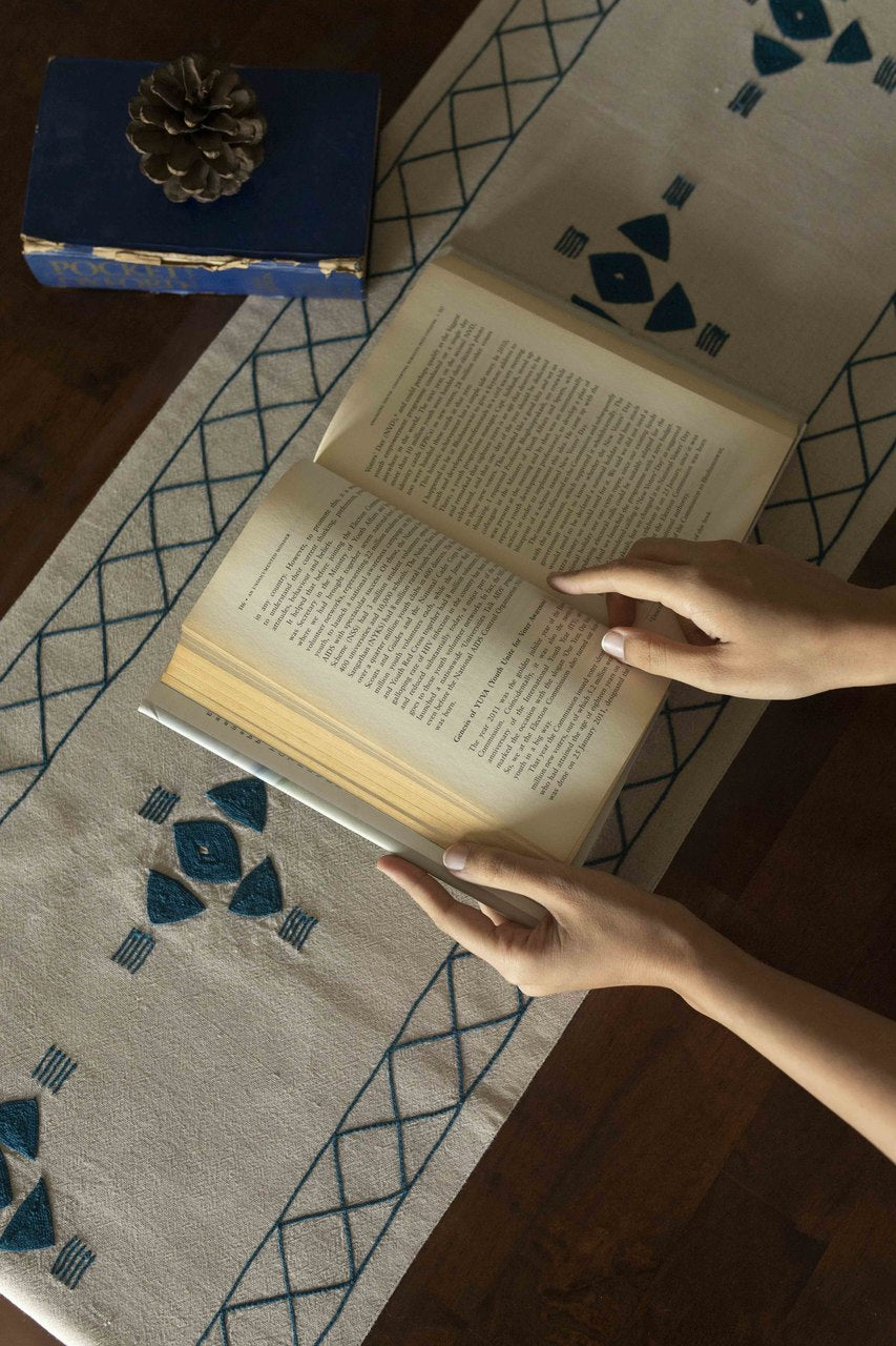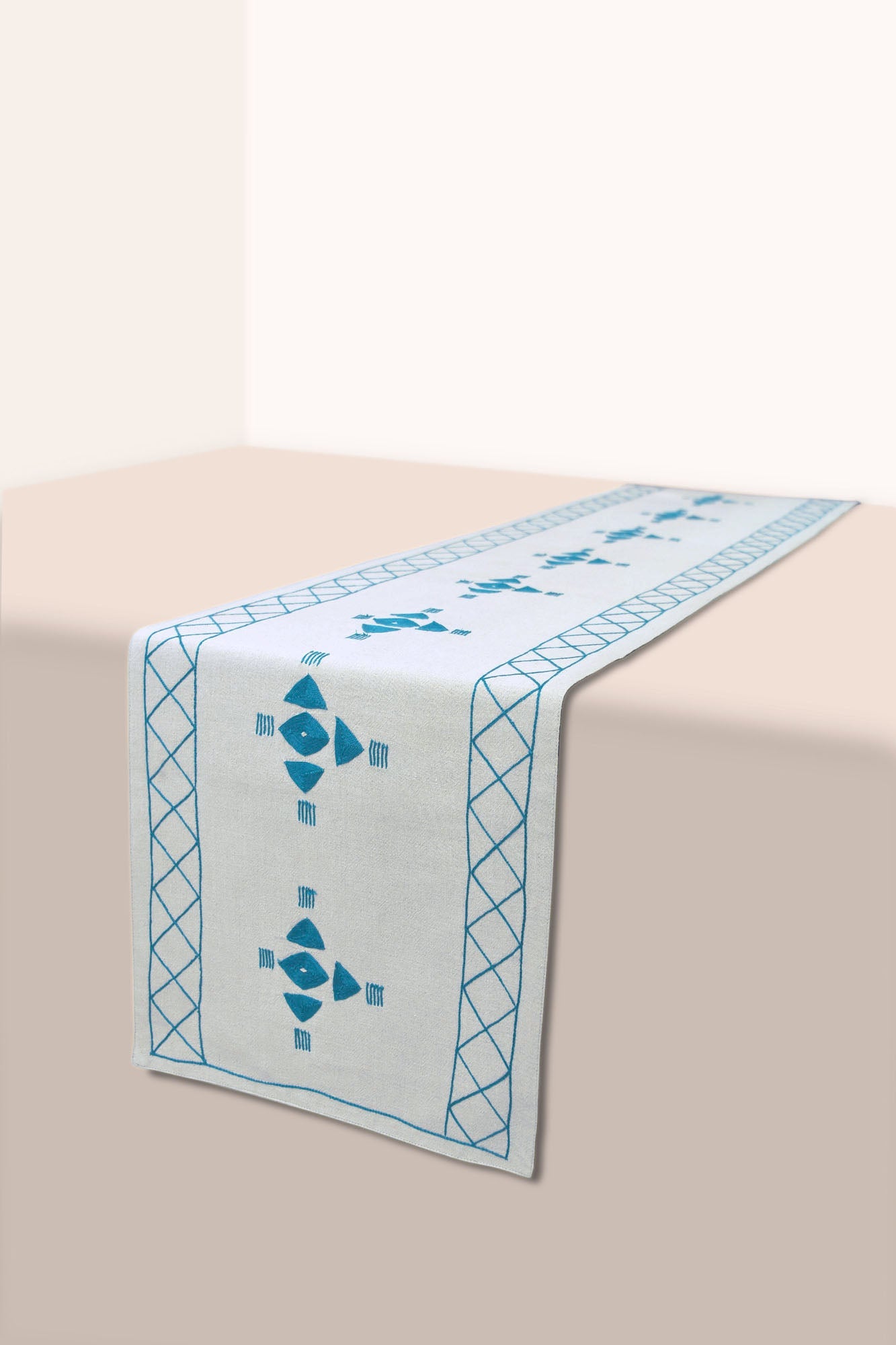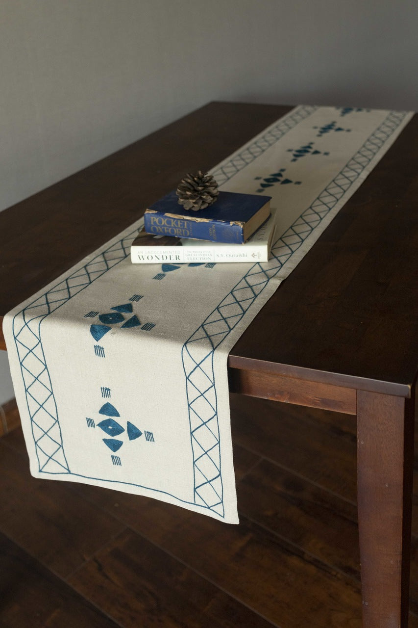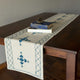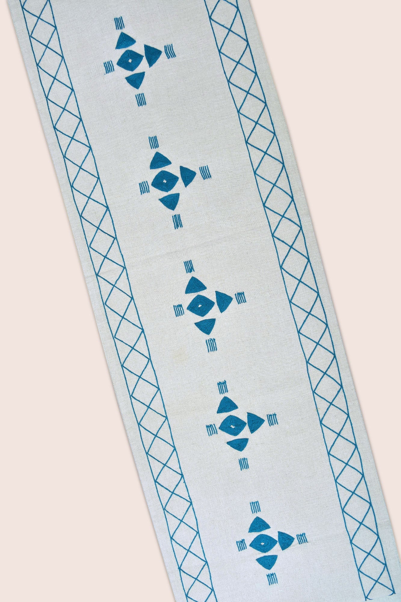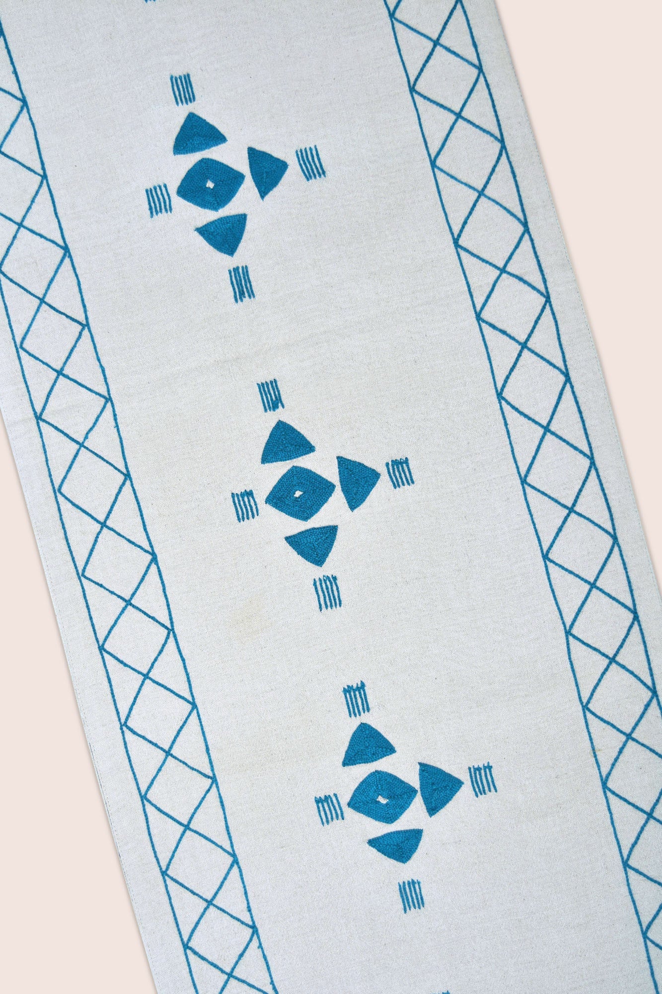 Our Swish table runner is handspun in natural handwoven cotton khadi by our talented artisans. A prized possession in serene white, it is finished with calming blue satin embroidery and chain work.