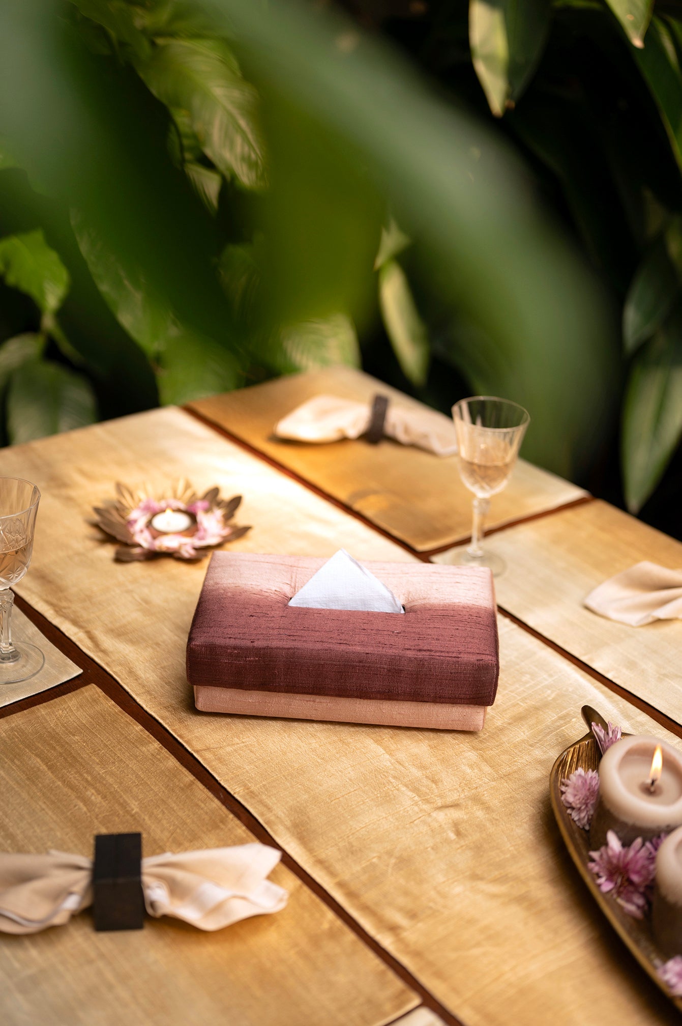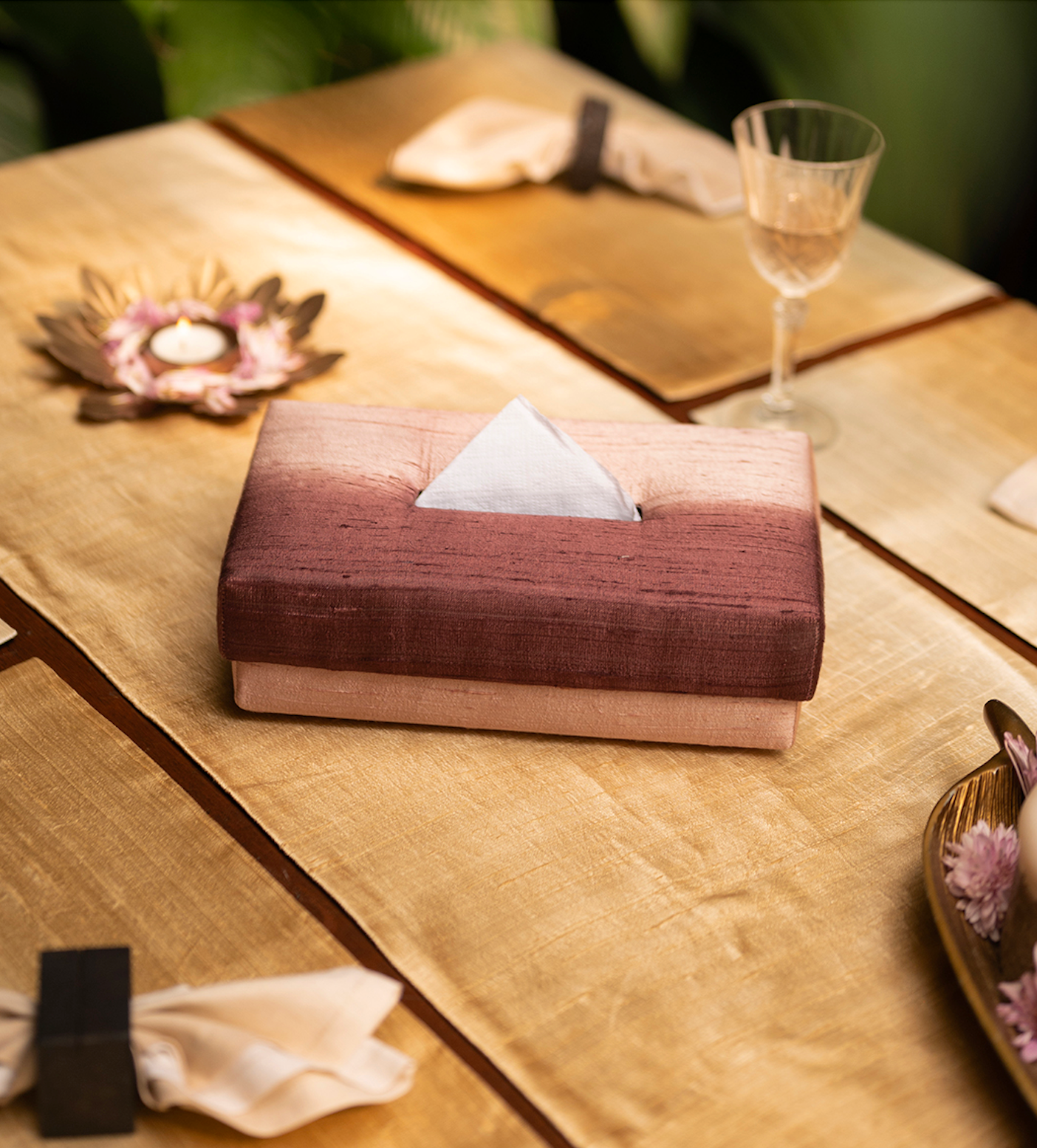 Virtu, a masterpiece of artistry, unveils Indian handwoven Dupion Silk, symmetrical in Mapuche art's embrace. Its tissue box, a virtuoso's creation, boasts immersive, transverse arrows, a wine-hued symphony, hand-tied, and dyed with reflection's grace. A warm welcome for new guests, an ode to creativity's place.