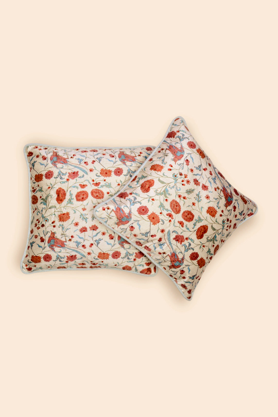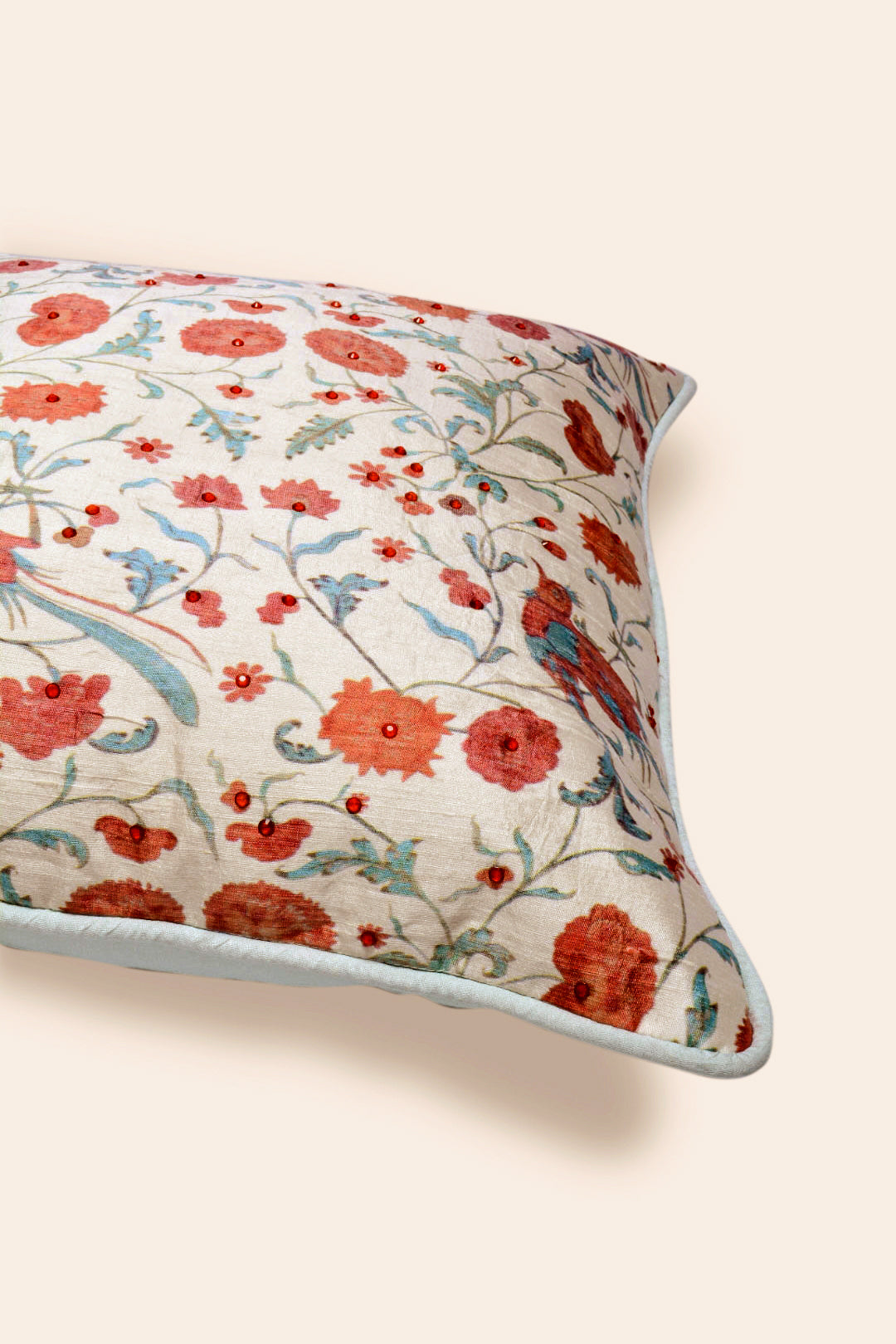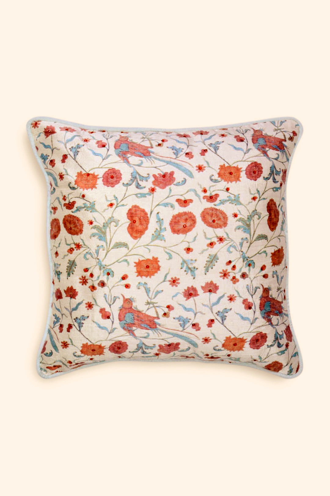 Our Zinat cushions are printed with meandering vines laden with flowers and flamboyant birds to elevate your space with a scintillating spirit for the season. Inspired by the Mughal garden, the dupion silk cushion in white is embellished with beads to add a touch of artistic flair to your festivities.